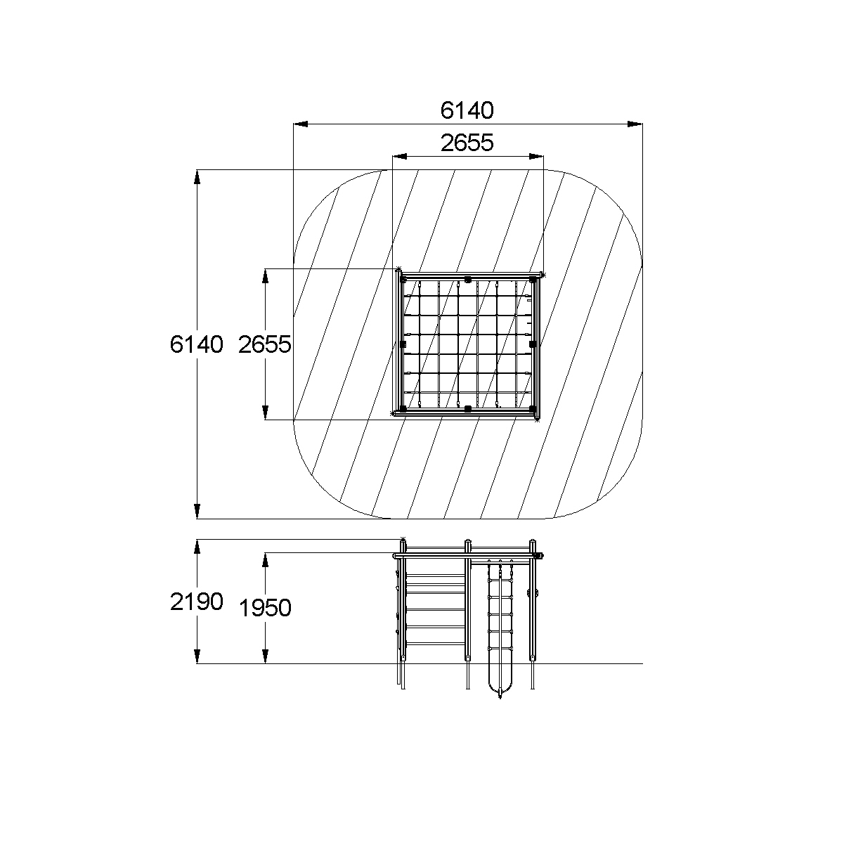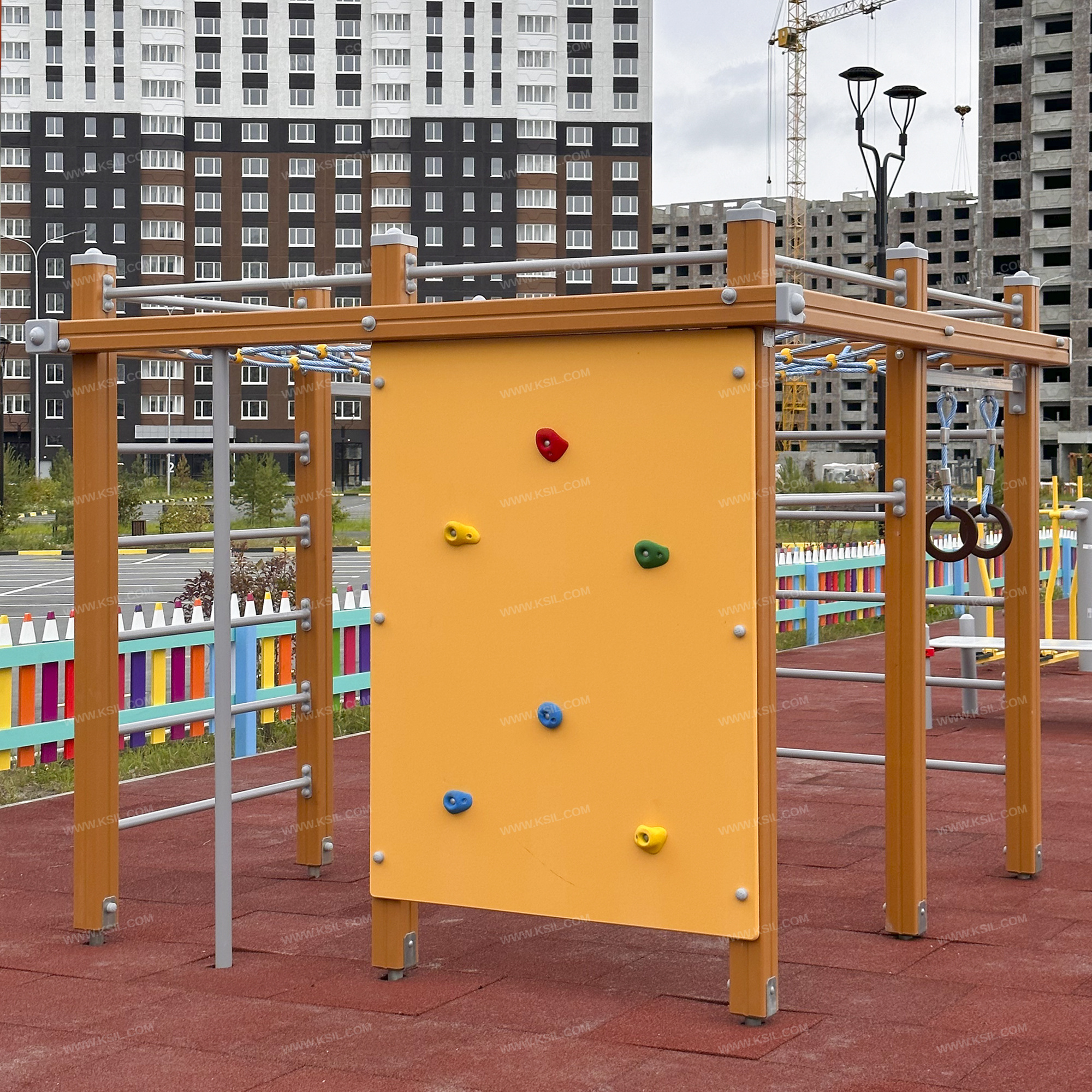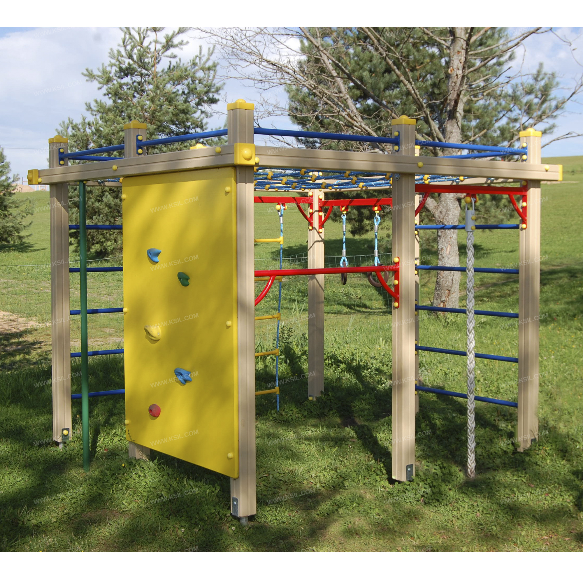 В крайних рядах должно быть по три несущих столба, расположенных на равном расстоянии друг от друга, в среднем ряду по два столба. В каждом ряду несущие столбы в верхней части должны быть соединены балками и горизонтальными столбами. В верхней части должна быть расположена полипропиленовая сетка, проемы гимнастического комплекса должны быть оснащены: шведскими стенками, гимнастическими кольцами, гибкой лестницей, вертикальным шестом, канатом, перекладиной с раскосами и альпинистской стенкой для лазания с зацепами.