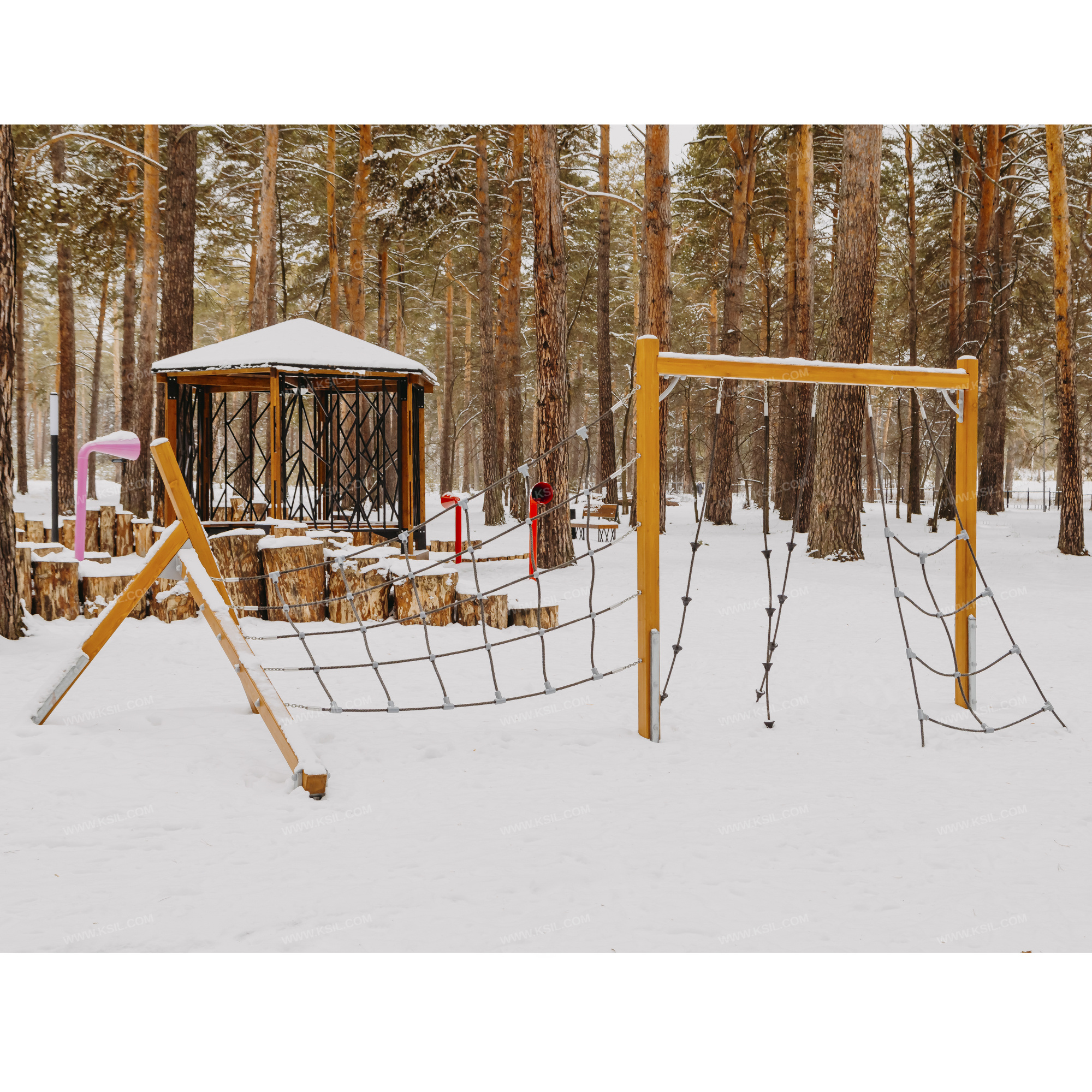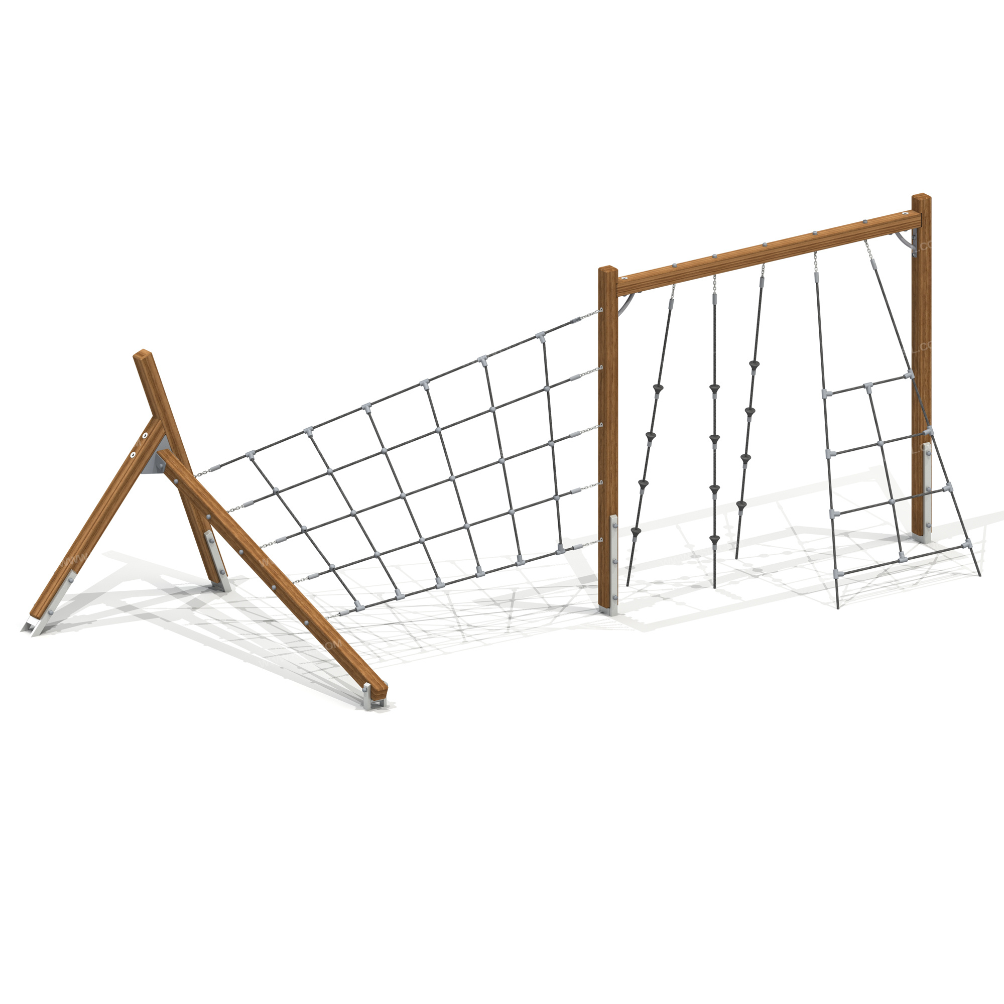 Спортивный комплекс должен представлять собой конструкцию, состоящую из несущих столбов, изготовленных из лиственницы с навесным оборудованием: сетка объемная, сетка-трапеция и 3 луча с уступами.Несущие вертикальные и горизонтальные столбы комплекса должны быть выполнены из клееного деревянного бруса лиственницы сечением не менее 100х100 мм и иметь скругленный профиль. Снизу вертикальные столбы крепятся на металлические разборные подпятники, выполненные из профильной трубы 50х25 и пластины толщиной 8 мм, которые бетонируются в землю. Горизонтальные столбы крепятся к вертикальным с помощью металлических уголков жесткости, выполненных из трубы сечением 26 мм и металлической полосы толщиной не менее 4 мм.Наклонный бум и его опоры должны быть выполнены из клееного деревянного бруса лиственницы сечением не менее 100х100 мм и иметь скругленный профиль. Снизу наклонный бум и его опоры крепятся на металлические подпятники из профильной трубы сечением 50х25 с толщиной стенки не менее 2.5 мм, которые бетонируются в землю. Соединение наклонного бума с опорами выполнено в виде кронштейна из металлического листа толщиной не менее 4 мм и окрашенного порошковыми красками.Объемная сетка, сетка-трапеция и лучи с уступами должны быть выполнены из полипропиленового 6-типрядного армированного металлом каната тросовой свивки с резиновым сердечником, канат сетки должен быть диаметром не менее 16 мм и соединен между собой пластиковыми креплениями. На лучи закреплены пластиковые уступы.