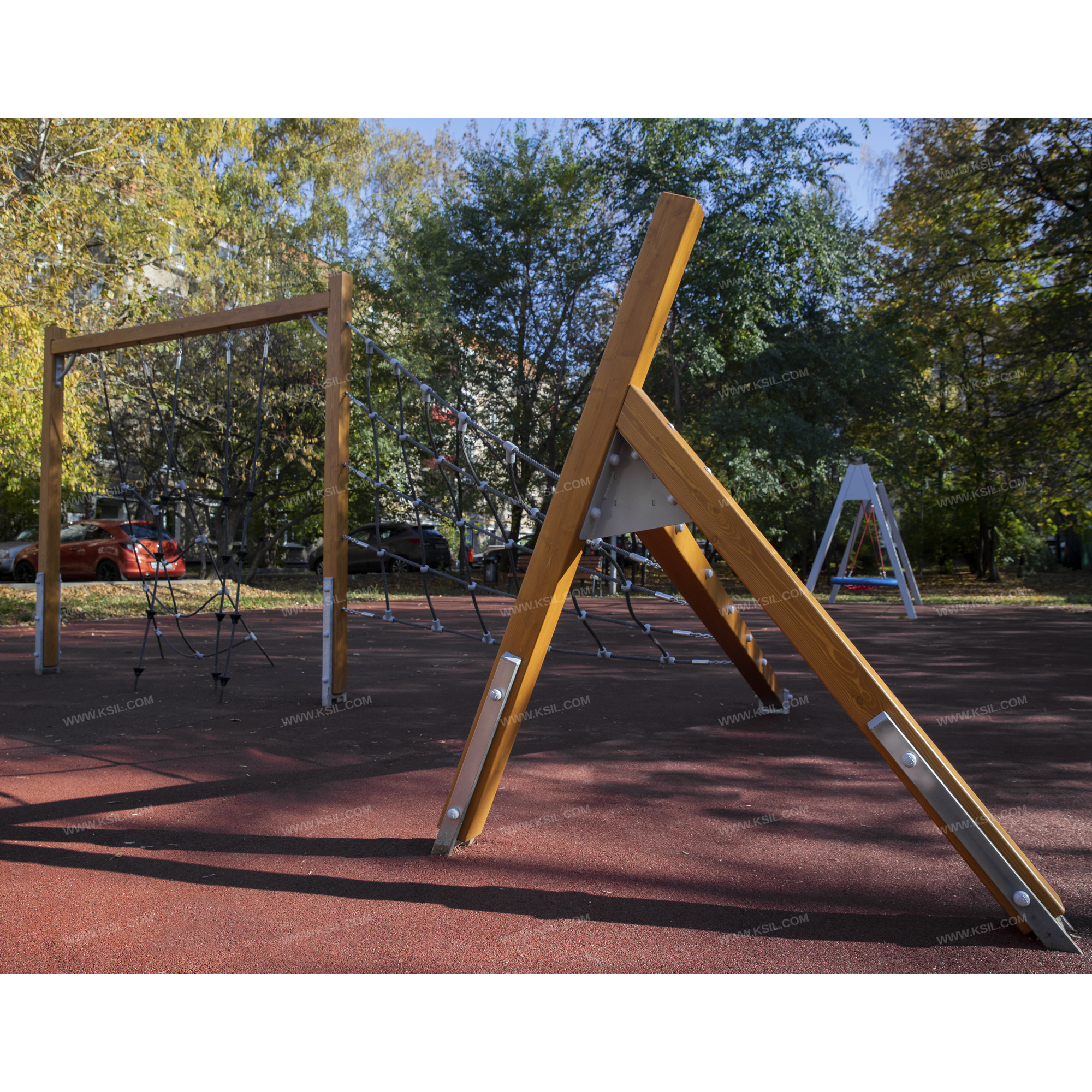 Металлические элементы должны быть покрыты порошковыми красками или подвергнуты гальванизации. Сварные швы должны быть гладкими и исключать возможность травмирования пользователей при контакте. Металлические элементы конструкции не должны состоять из нескольких частей, соединенных между собой.Весь крепеж должен быть оцинкован, все углы закруглены радиусом не менее 3 мм. Концы труб должны быть закрыты.Деревянный брус должен быть склеен под прессом из нескольких отборных досок из лиственницы, подвергнутых специальной обработке и сушке до мебельной влажности 7-10% для придания особой прочности несущим конструкциям.Материалы из древесины не должны иметь на поверхности дефектов обработки. Концы труб должны быть закрыты. Заглушки пластиковые на места резьбовых соединений.Промежутки и стыки между элементами оборудования не должны допускать застревания частей тела и одежды пользователей. В конструкции должна быть предусмотрена возможность доступа взрослого при обстоятельствах, требующих посторонней помощи пользователю.C целью повышения качества и безопасности продукции, в документацию на изделие могут вноситься изменения (изображение, размеры, и т.п.).
