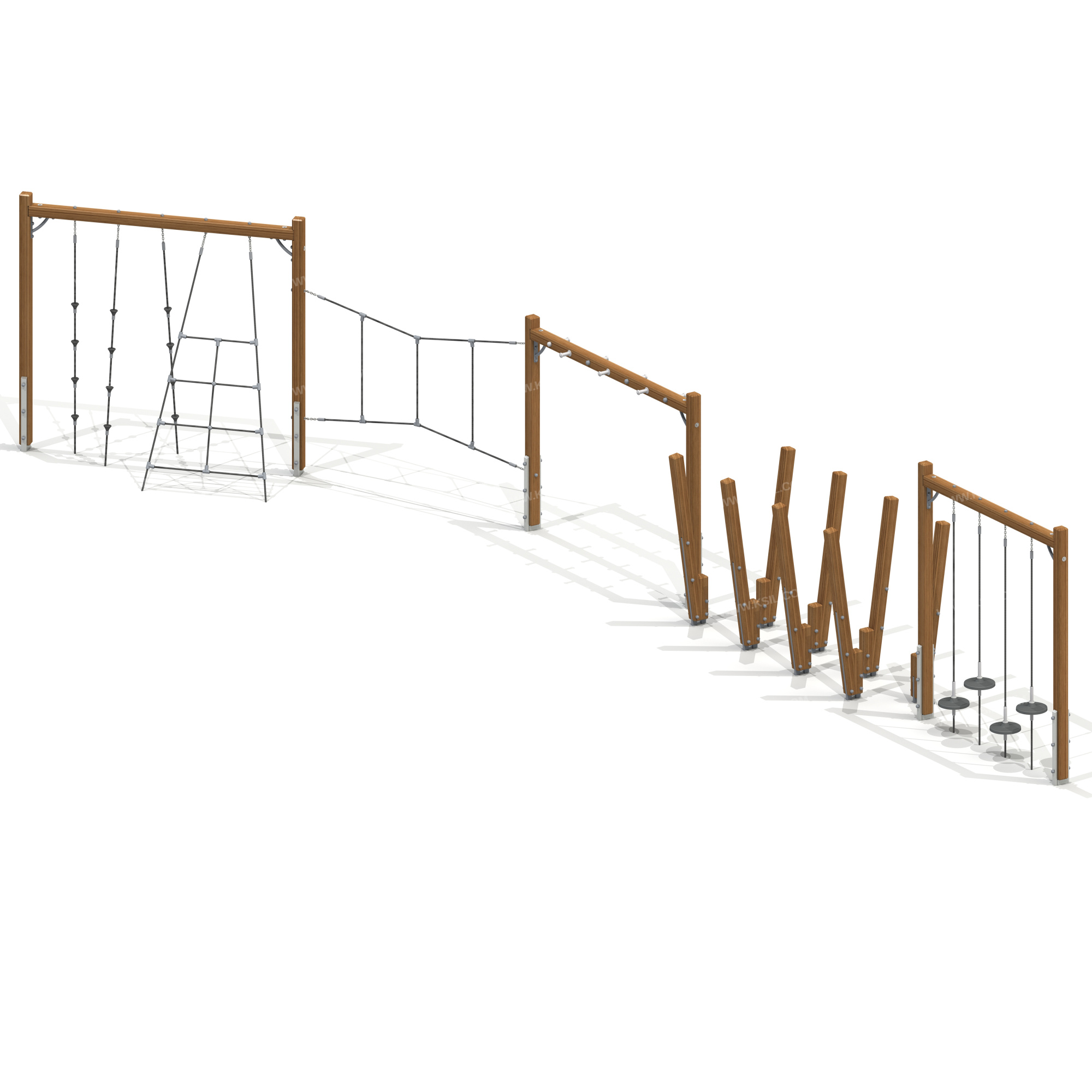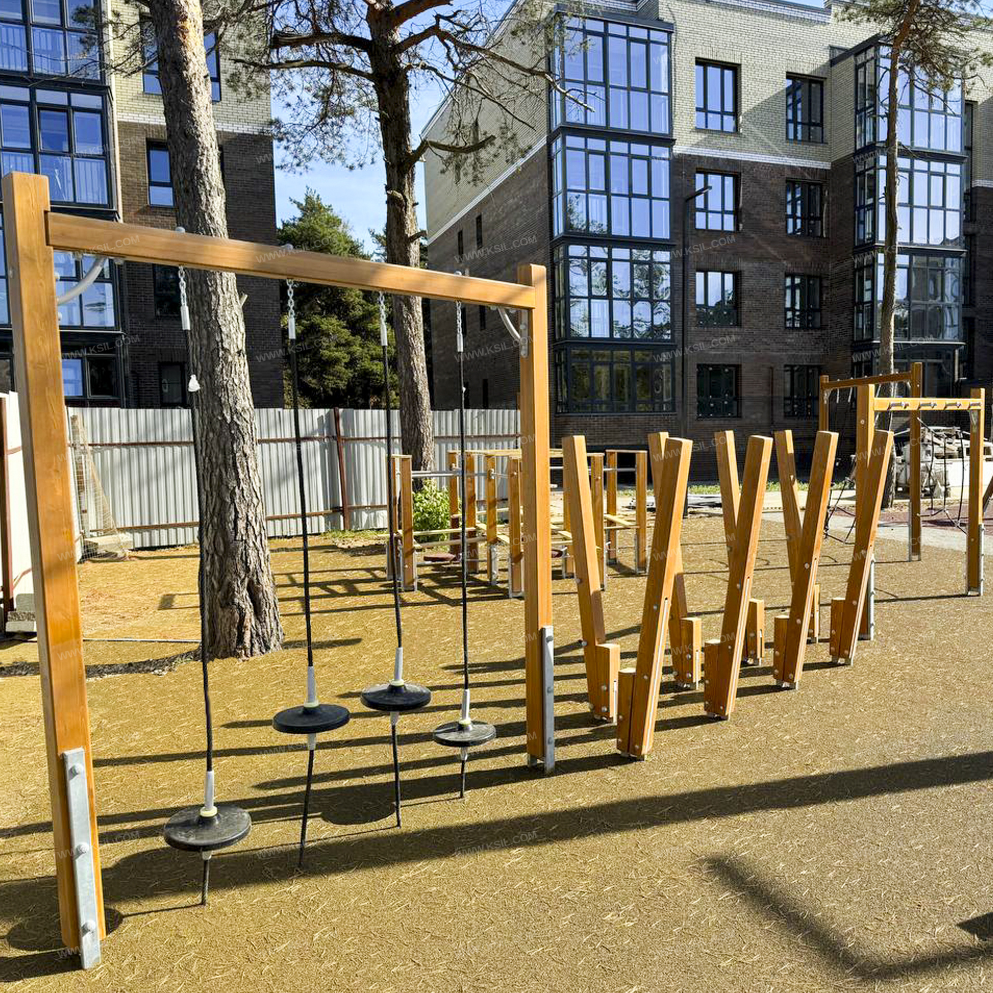 Спортивный комплекс должен представлять собой конструкцию, состоящую из несущих столбов с навесным оборудованием: ступени на канате, сетка-переход, подвесной переход, сетка-трапеция, лучи с уступами, конструкция из вертикальных и наклонных столбов ( стационарные ходули), рукоход на столбе.Несущие вертикальные, наклонные и горизонтальные столбы комплекса должны быть выполнены из клееного деревянного бруса лиственницы сечением не менее 100х100 мм и иметь скругленный профиль. Снизу вертикальные столбы крепятся на металлические разборные подпятники, выполненные из профильной трубы 50х25 и пластины толщиной 8 мм, которые бетонируются в землю. Горизонтальные столбы крепятся к вертикальным с помощью металлических уголков жесткости, выполненных из трубы сечением 26 мм и металлической полосы толщиной не менее 4 мм. Ручки на рукоходе должны быть пластмассовые диаметром не менее 32 мм и длиной не менее 100мм. Столбы на стационарные ходули крепятся попарно вертикальный короткий и наклонный на металлические подпятники специальной формы, выполненные из профильной трубы 50х25 и пластины толщиной 5 мм, которые бетонируются в землю. Ступени на канате выполнены из резинового диска Ø280мм, закрепленного на полипропиленовом канате на разных высотных отметках. Низ канатов бетонируется в землю с помощью закладной трубы диаметром не менее 26 мм и арматуры диаметром не менее 10 мм.Сетка-переход, сетка-трапеция и лучи с уступами должны быть выполнены из полипропиленового 6-типрядного армированного металлом каната тросовой свивки с резиновым сердечником, канат сетки должен быть диаметром не менее 16 мм и соединен между собой пластиковыми креплениями. На лучах должны быть закреплены пластиковые уступы.