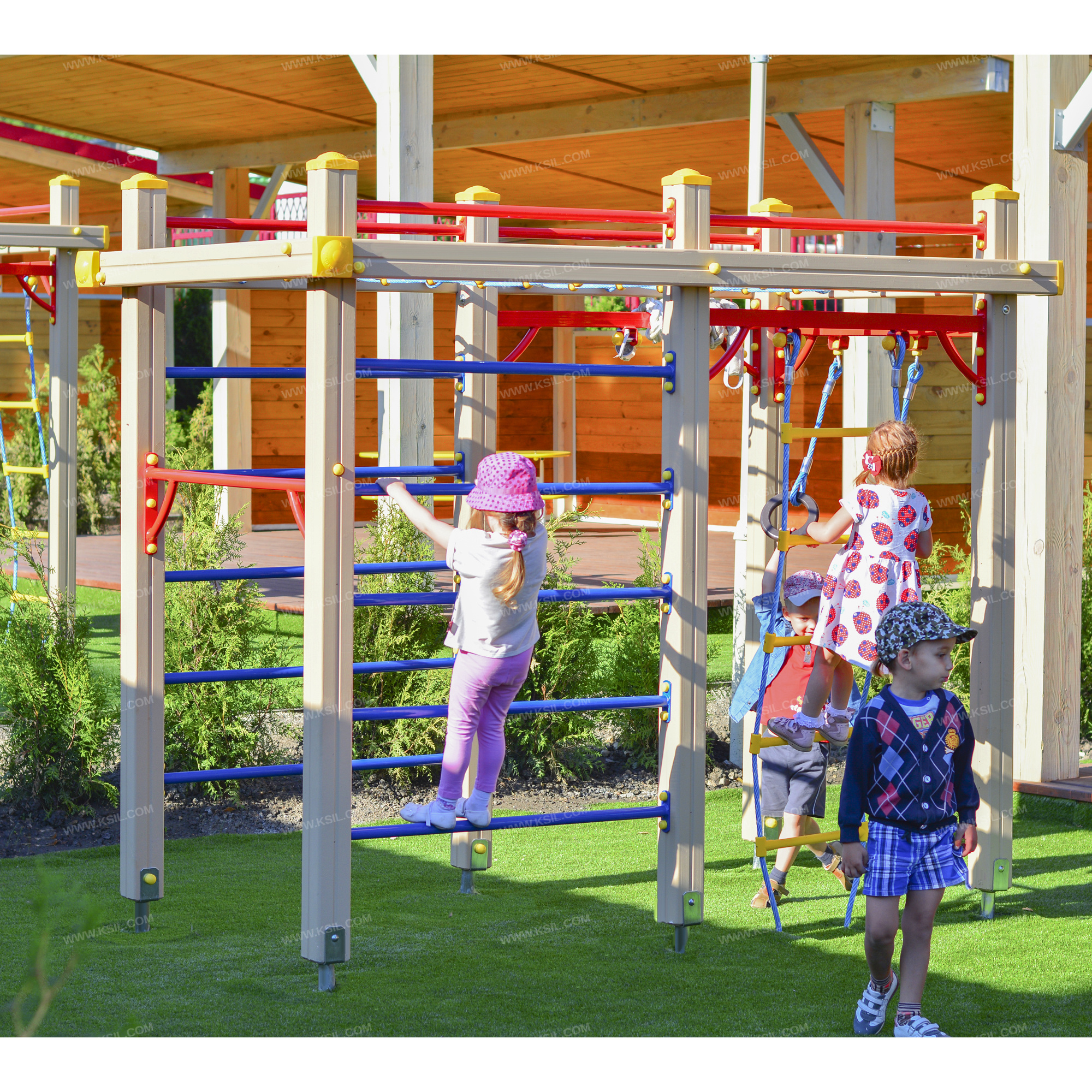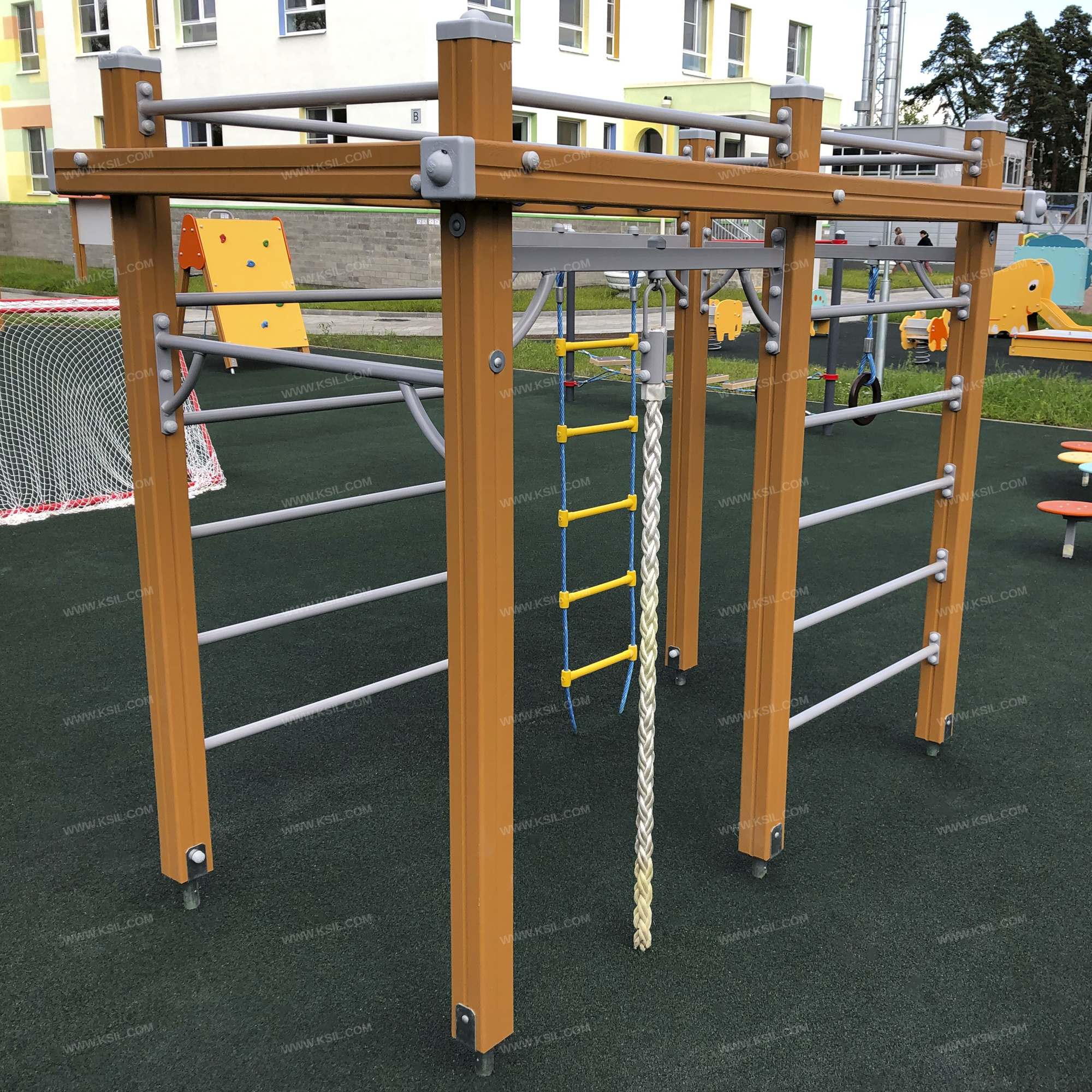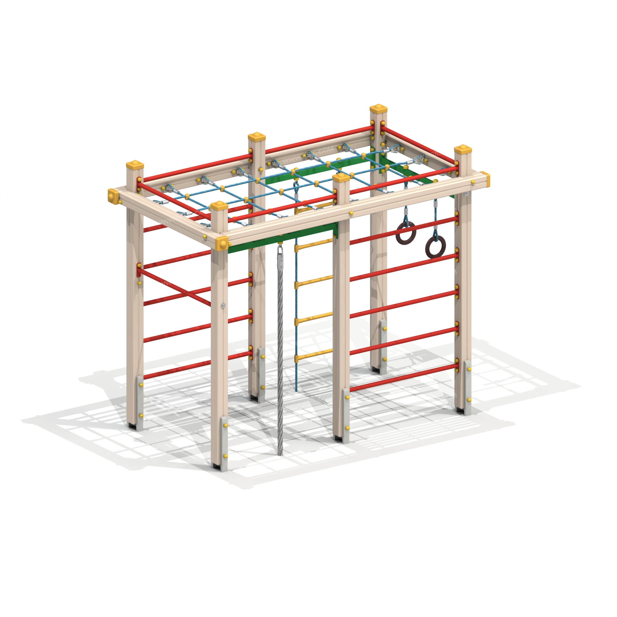Спортивный комплекс должен представлять собой устойчивую модульную сборно-разборную конструкцию, состоящую из несущих столбов, установленных в два ряда, параллельно друг другу. В каждом ряду несущие стойки в верхней части должны быть соединены балками. В верхней части должна быть расположена полипропиленовая сетка, проемы спортивного комплекса должны быть оснащены: шведскими стенками, гимнастическими кольцами, гибкой лестницей, канатом, перекладиной с раскосами.Несущие вертикальные и горизонтальные столбы комплекса должны быть выполнены из клееного деревянного бруса сечением не менее 100х100 мм и иметь скругленный профиль с канавкой посередине. Сверху вертикальный столб должен заканчиваться пластиковой заглушкой, снизу столб должен заканчиваться металлическим оцинкованным подпятником диаметром не менее 42 мм, который бетонируется в землю.Гибкая лестница должна состоять из армированного полипропиленового каната и пластиковых ступенек, закрепленных на металлической профильной трубе диаметром не менее 50х25 мм с раскосами.Канат должен быть полиамидный или полипропиленовый диаметром не менее 40 мм и подвешен на перекладине, выполненной из профильной трубы сечением не менее 50х25 мм с раскосами.Перекладина с гимнастическими кольцами должна быть выполнена из металлической профильной трубы сечением не менее 50х25 мм, гибкой подвески и колец из влагостойкой фанеры или нелегковоспламеняющегося пластика. Балки, перекладины, раскосы, перекладины шведской стенки должны быть выполнены из металлической трубы диаметром не менее 33 мм.