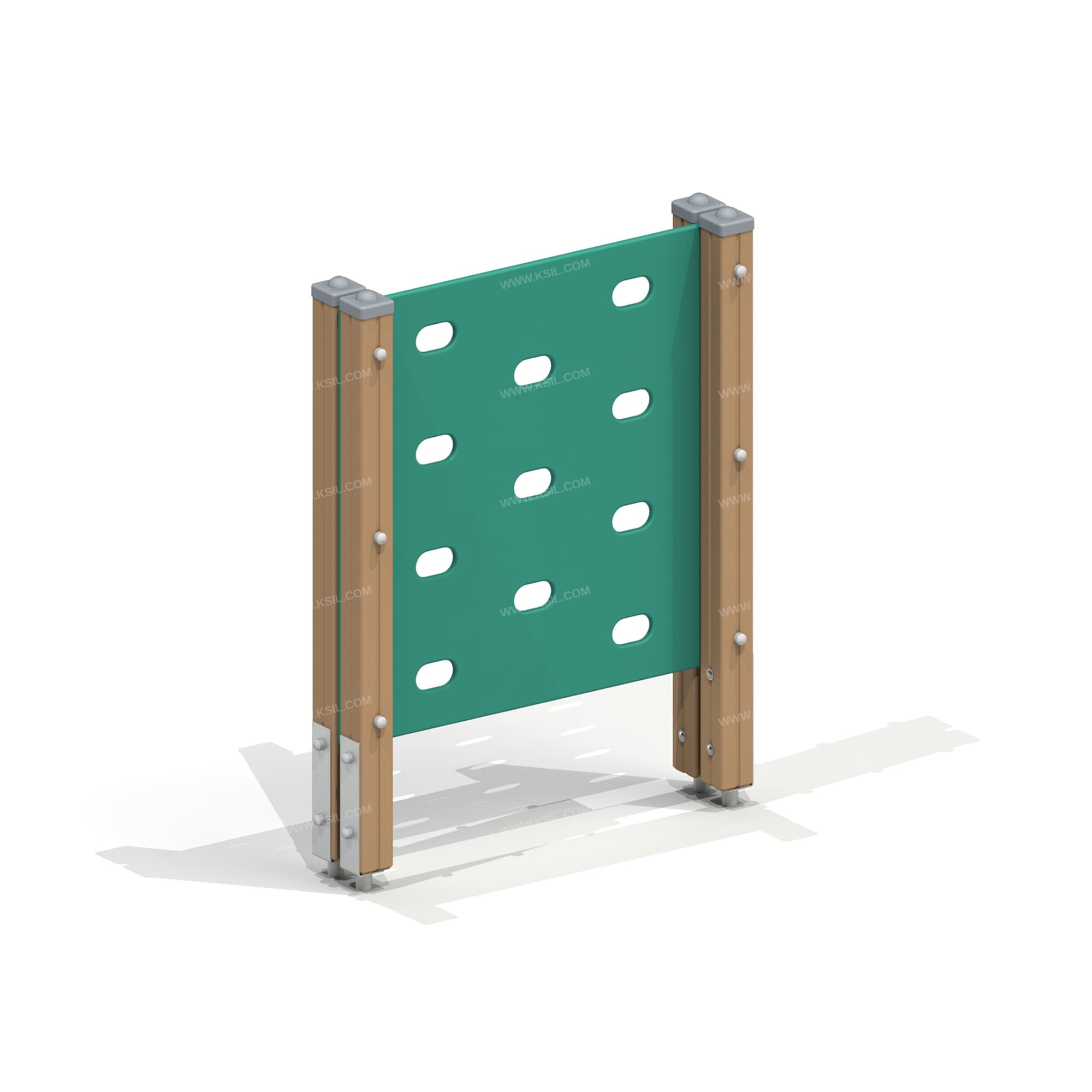 Стенка для перелезания должна представлять собой устойчивую конструкцию, состоящую из 4-х несущих столбов и стенки для перелезания. Несущие столбы должны быть выполнены из клееного деревянного бруса сечением не менее 100х100 мм и иметь скругленный профиль с канавкой посередине. Сверху столб должен заканчиваться пластиковой заглушкой, снизу столб должен заканчиваться металлическим оцинкованным подпятником диаметром не менее 42 мм, который бетонируется в землю.Стенка с отверстиями для рук и ног должна быть выполнены из влагостойкой фанеры толщиной не менее 21 мм.
