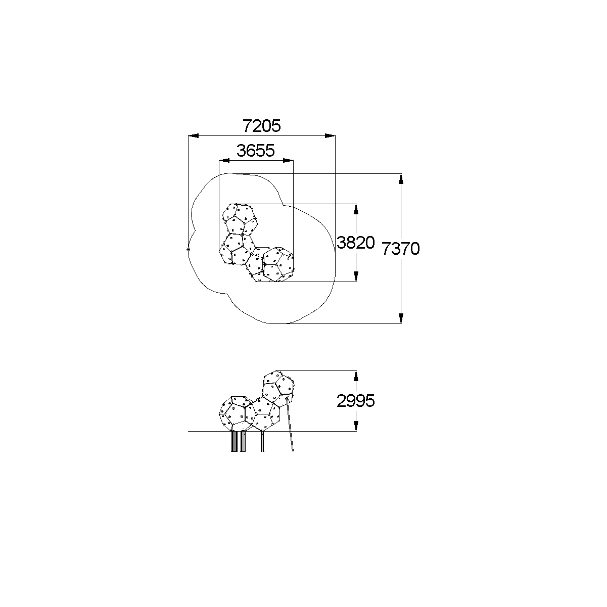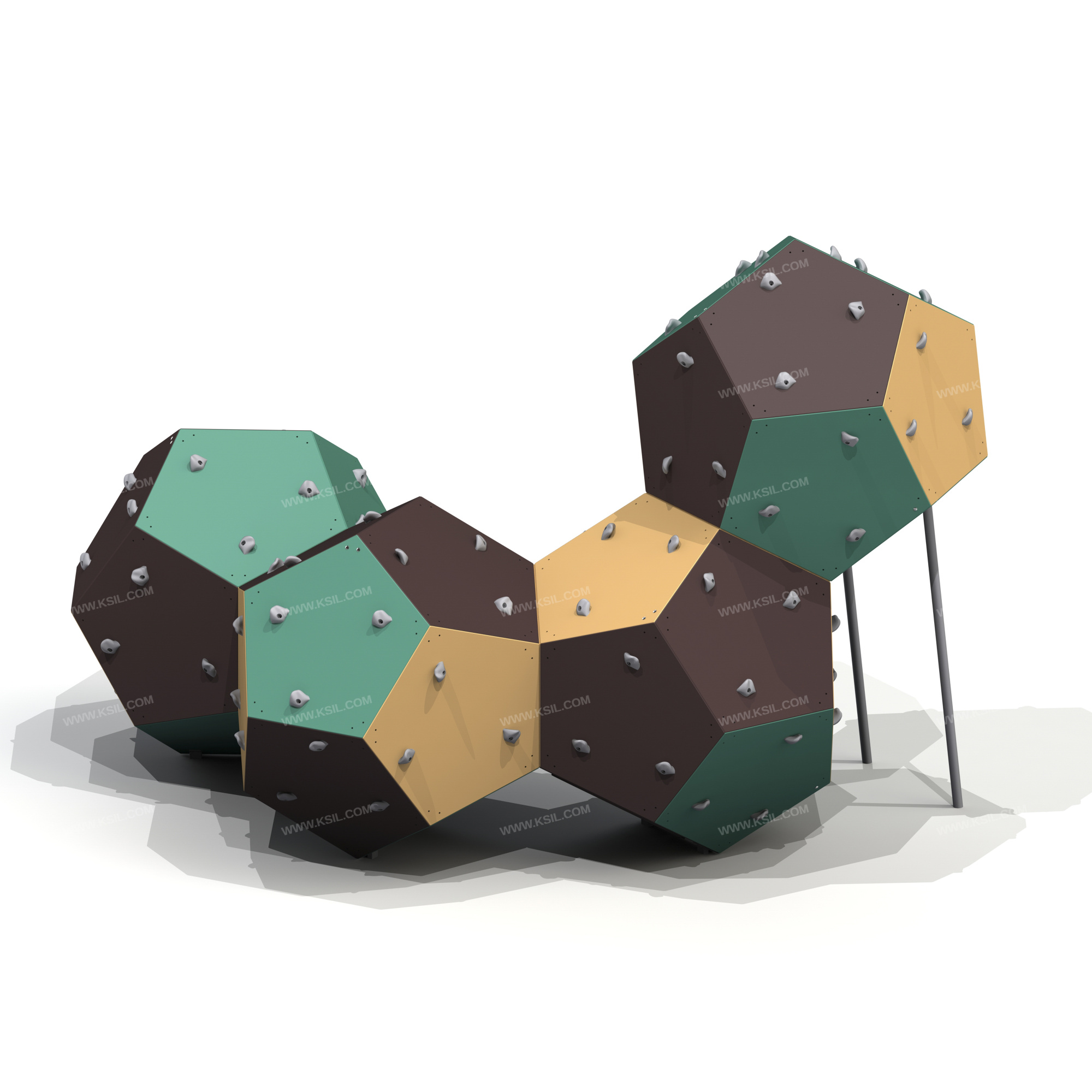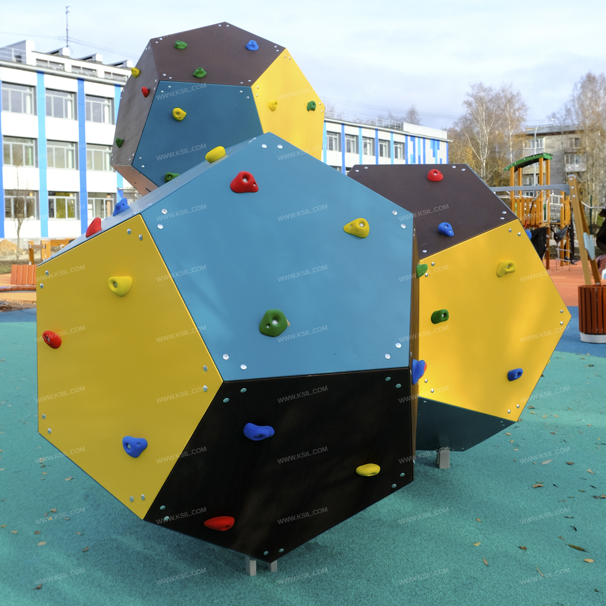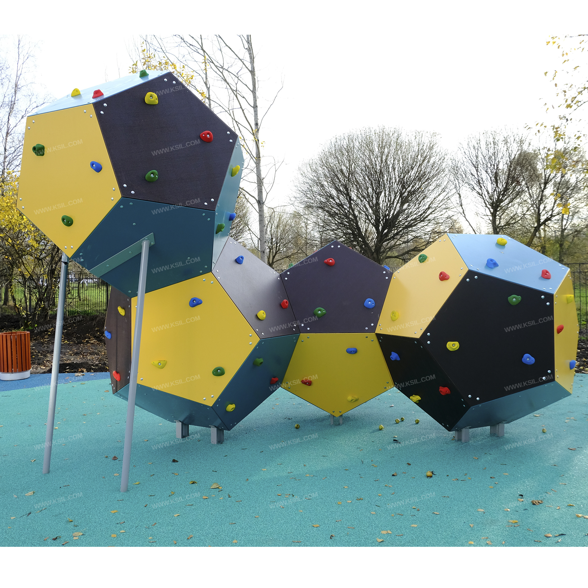 Спортивный комплекс должен представлять собой модульную сборно-разборную конструкцию и представлять собой конструкцию для лазанья, состоящую из трех додекаэдров с зацепами.Комплекс должен состоять из 41 стандартных пятигранников, 4-х пятигранников – лазов, 1-го пятигранника – люка с крышкой, не менее 63 зацепов и пяти опорных стоек. Опорные стойки должны бетонироваться в землю, выполнены из профильной трубы 60х30 и круглой трубы диаметром не менее 48 мм.Пятигранники должны быть выполнены из влагостойкой и ламинированной фанеры толщиной не менее 21 мм.
