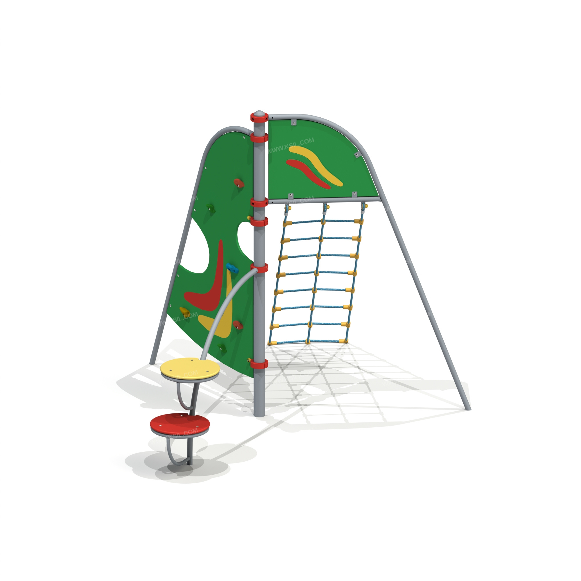 Спортивный комплекс должен представлять собой устойчивую конструкцию и состоять из несущего столба со спортивным оборудованием. Комплекс должен включать в себя: альпинистскую стенку неправильной формы, стойку с флагом, полипропиленовую сетку для лазанья, крепящуюся к перекладине стойки с флагом, дугу с разноуровневыми ступеньками. Несущий столб комплекса должен быть выполнен из металлической трубы диаметром не менее 76 мм. Сверху столб должен заканчиваться заглушкой, снизу столб должен бетонироваться в землю.Альпинистская стенка неправильной формы должна состоять из изогнутой металлической трубы диаметром не менее 42 мм и стенки с зацепами из влагостойкой фанеры толщиной не менее 21 мм. Изогнутая стойка с перекладиной должна быть выполнена из металлической трубы диаметром не менее 42 мм с декоративным флагом из влагостойкой фанеры толщиной не менее 21 мм.Стенки для лазанья должны быть выполнены из полипропиленового 6-прядного армированного металлом каната тросовой свивки с резиновым сердечником, канат сетки должен быть диаметром не менее 16 мм и соединен между собой пластиковыми креплениями овальной формы. Дуга должна быть выполнена из металлической трубы диаметром не менее 42 мм с круглыми ступеньками из влагостойкой фанеры толщиной не менее 21 мм на металлическом каркасе с ребрами жесткости.