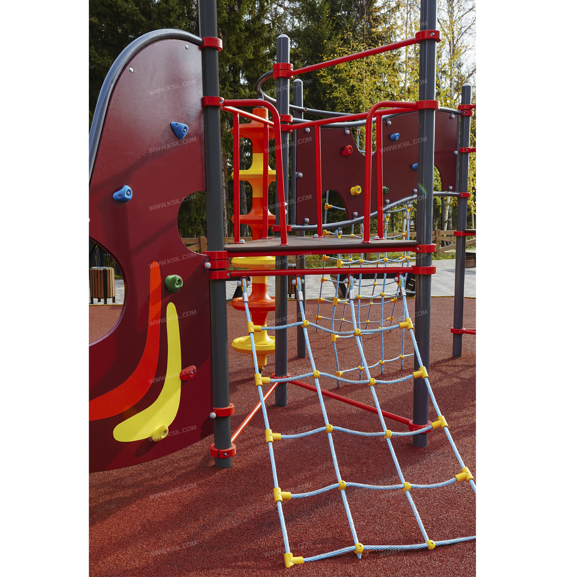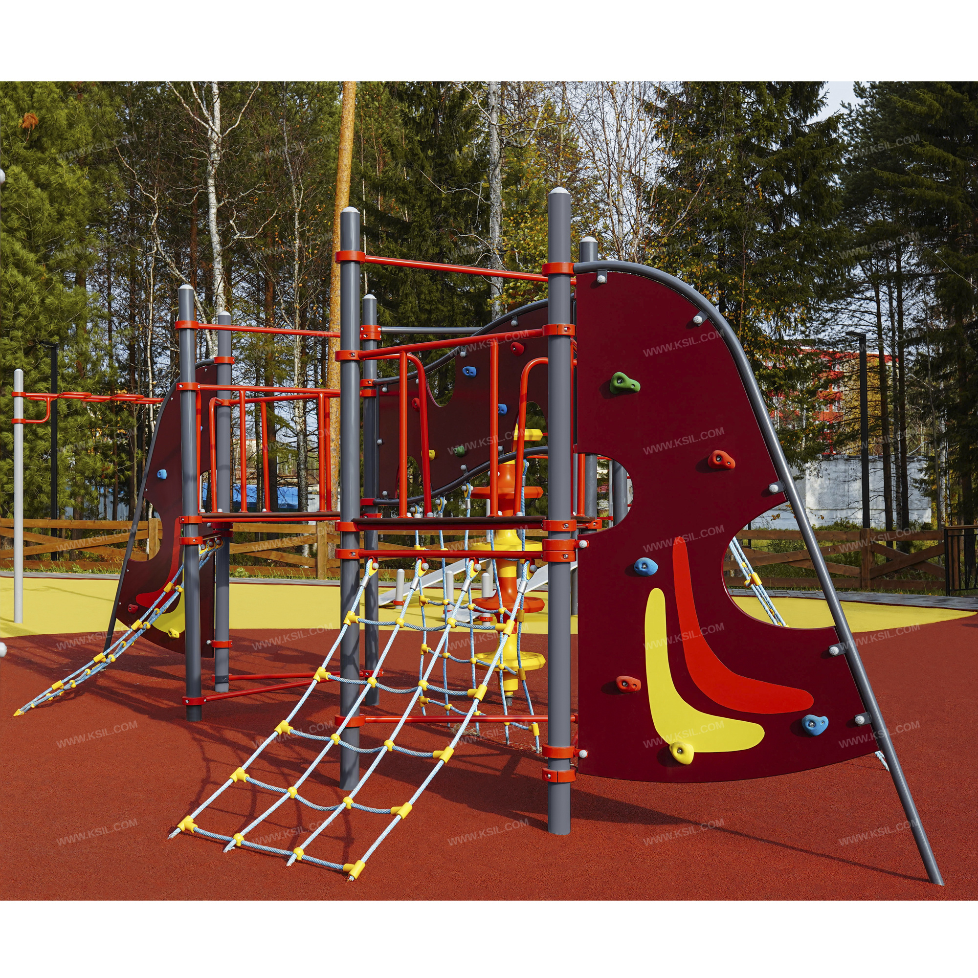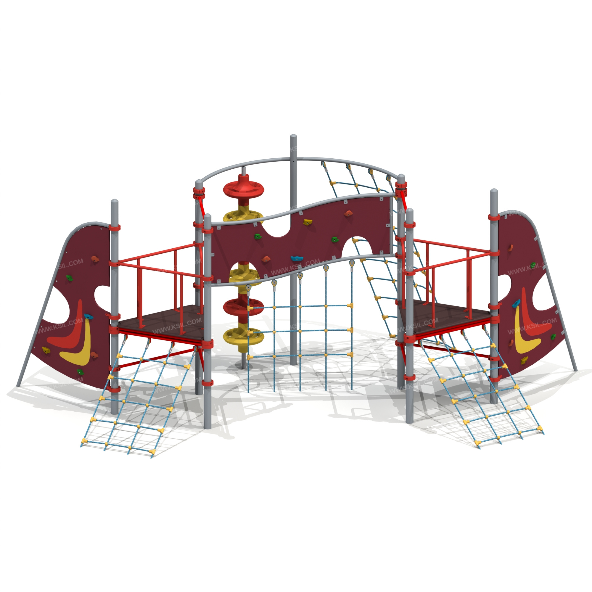 Спортивный комплекс должен представлять собой устойчивую конструкцию и состоять из 2-х треугольных башен с навесным оборудованием соединенных между собой спортивным оборудованием и дугообразной перекладиной. Комплекс должен включать в себя: 3 альпинистские стенки, две из которых неправильной формы, третья – в виде перехода, 4 полипропиленовые сетки для лазанья, три из которых наклонные, крепящиеся к треугольным башням и к дугообразной перекладине и одна вертикальная, крепящаяся к альпинисткой стенке – переходу, вертикальный шест с пластиковыми кольцами. Несущие столбы комплекса должны быть выполнены из металлической трубы диаметром не менее 88 мм. Сверху столб должен заканчиваться заглушкой, снизу столб должен бетонироваться в землю.Пол башен должен быть выполнен из влагостойкой фанеры толщиной не менее 21 мм.Ограждения башен должны быть выполнены из металлической трубы диаметром не менее 33 мм. Альпинистская стенка неправильной формы должна состоять из изогнутой металлической трубы диаметром не менее 42 мм и стенки с зацепами из влагостойкой фанеры толщиной не менее 21 мм. Альпинистская стенка в виде перехода должна состоять из 2-х волнообразных металлических балок диаметром не менее 42 мм, 2-х стоек диаметром не менее 33 мм и стенки с захватами неправильной формы из влагостойкой фанеры толщиной не менее 21 мм. Сетки для лазанья должны быть выполнены из полипропиленового 6-прядного армированного металлом каната тросовой свивки с резиновым сердечником, канат сетки должен быть диаметром не менее 16 мм и соединен между собой пластиковыми креплениями овальной формы. Вертикальный шест должен быть выполнен из металлической трубы диаметром не менее 48 мм и крепиться к дугообразной перекладине диаметром не менее 42 мм. Колеса в количестве не менее 6-ти штук должны быть выполнены из пластика. Нижняя часть шеста бетонируется в землю.Все узлы крепления элементов к стойкам осуществляются через металлические хомуты Ø 140 мм.