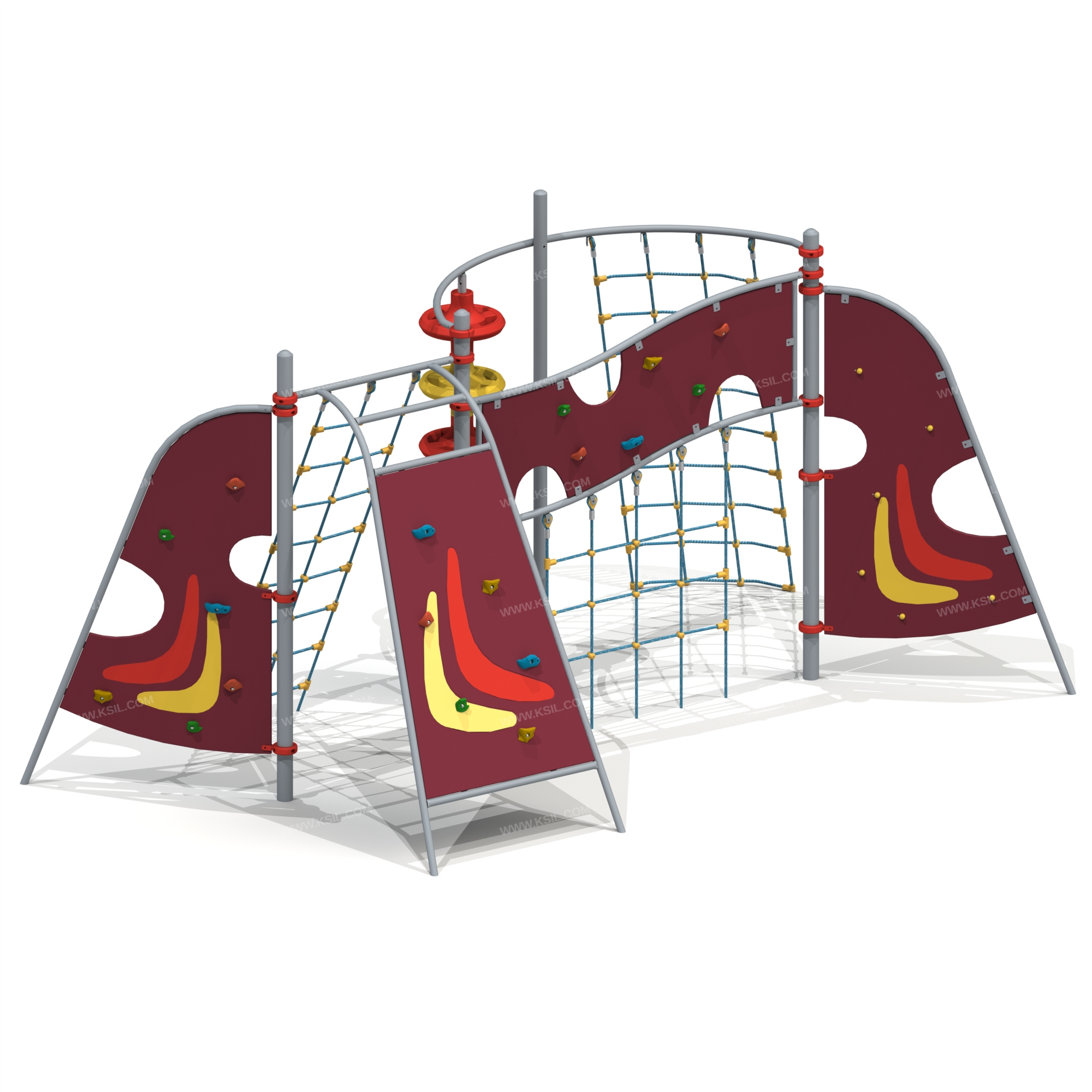 Спортивный комплекс должен представлять собой устойчивую конструкцию и состоять из 4-х несущих столбов, соединенных между собой спортивным оборудованием. Комплекс должен включать в себя: 4 альпинистские стенки, две из которых неправильной формы выполняют роль боковых стоек, третья - наклонная в виде трапа, четвертая – в виде перехода с «Камнями»-захватами «Волна», 3 полипропиленовые сетки для лазанья, две из которых наклонные, крепящиеся к перекладине наклонной альпинисткой стенки и дугообразной перекладине и одна вертикальная, крепящаяся к альпинисткой стенке – переходу, вертикальный шест с пластиковыми кольцами. Несущие столбы комплекса должны быть выполнены из металлической трубы диаметром не менее 89 мм. Сверху столб должен заканчиваться заглушкой, снизу столб должен бетонироваться в землю.Альпинистская стенка неправильной формы должна состоять из изогнутой металлической трубы диаметром не менее 42 мм и стенки с зацепами из влагостойкой фанеры толщиной не менее 21 мм. Альпинистская наклонная стенка должна состоять из 2-х изогнутых металлических труб, 3-х перекладин диаметром не менее 42 мм и стенки в виде трапеции с зацепами из влагостойкой фанеры толщиной не менее 21 мм. Альпинистская стенка в виде перехода должна состоять из 2-х волнообразных металлических балок диаметром не менее 42 мм, 2-х стоек диаметром не менее 33 мм и стенки с зацепами неправильной формы из влагостойкой фанеры толщиной не менее 21 мм. Сетки для лазанья должны быть выполнены из полипропиленового 6-прядного армированного металлом каната тросовой свивки с резиновым сердечником, канат сетки должен быть диаметром не менее 16 мм и соединен между собой пластиковыми креплениями овальной формы. Вертикальный шест с кольцами должен быть выполнен из металлической трубы диаметром не менее 48 мм и крепиться к дугообразной перекладине диаметром не менее 42 мм. Кольца в количестве не менее 6-ти штук должны быть выполнены из пластика. Нижняя часть шеста бетонируется в землю.