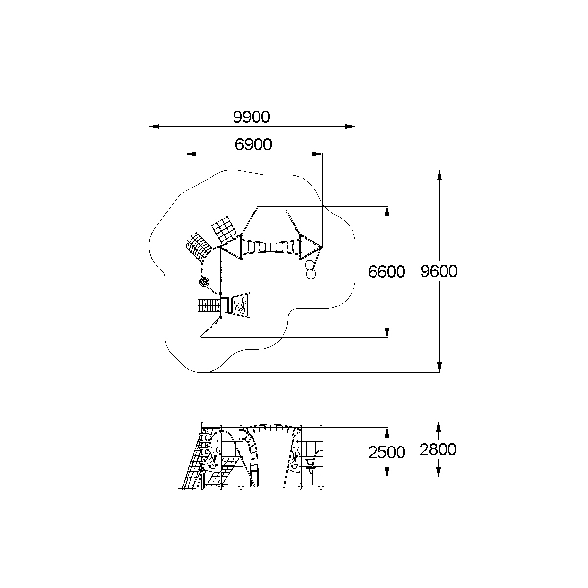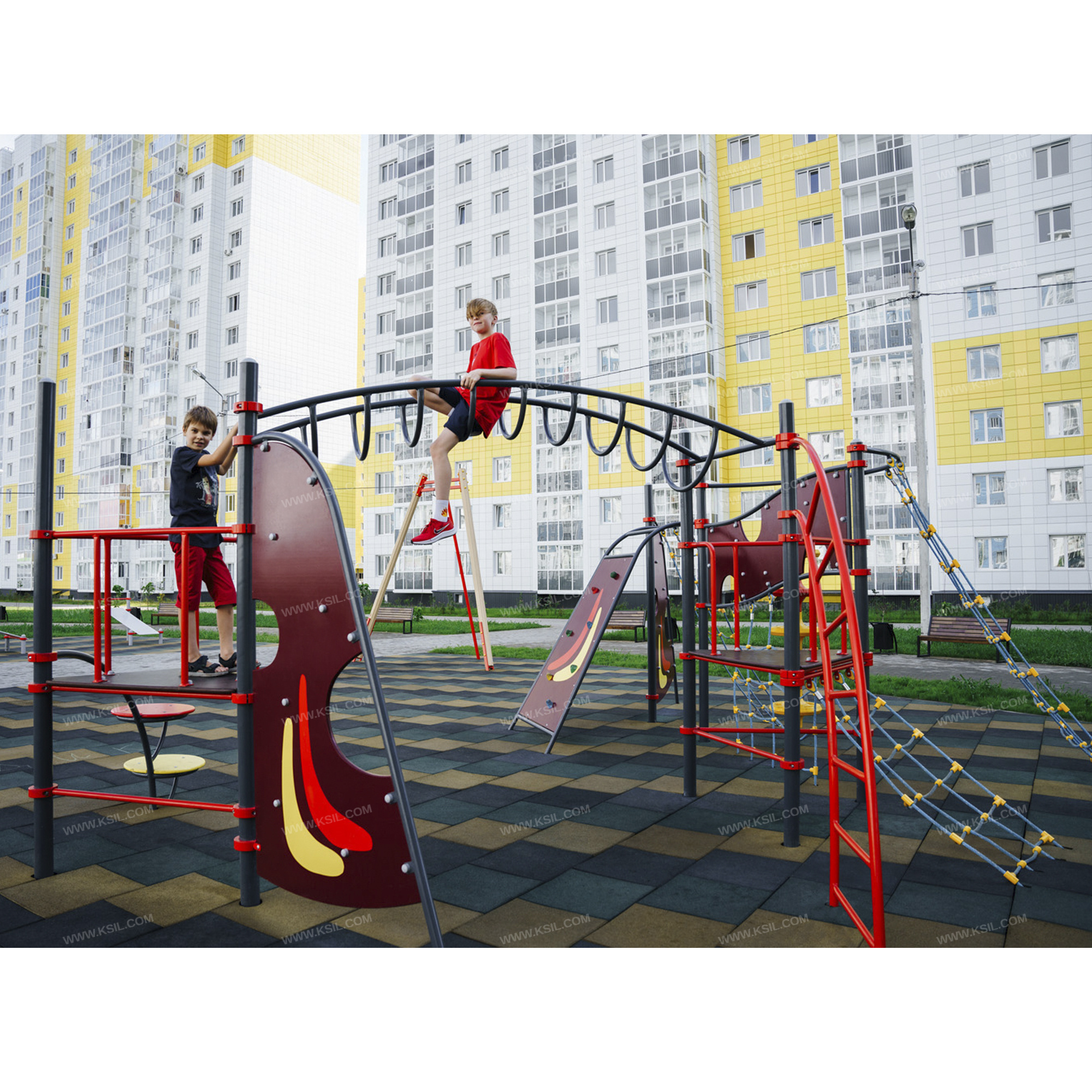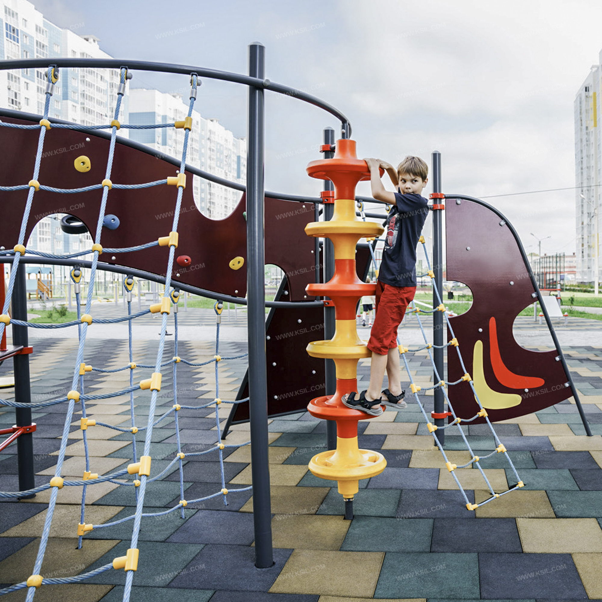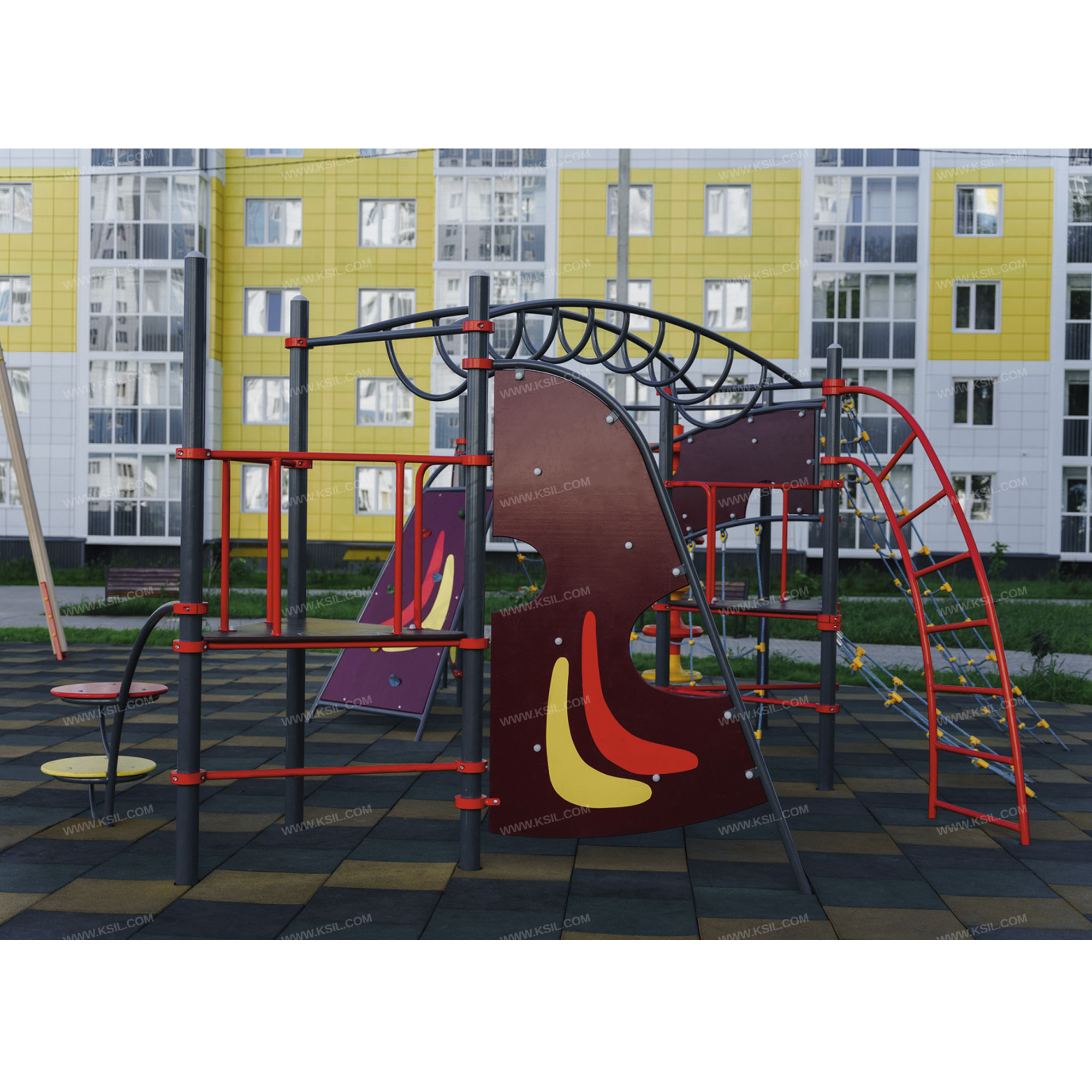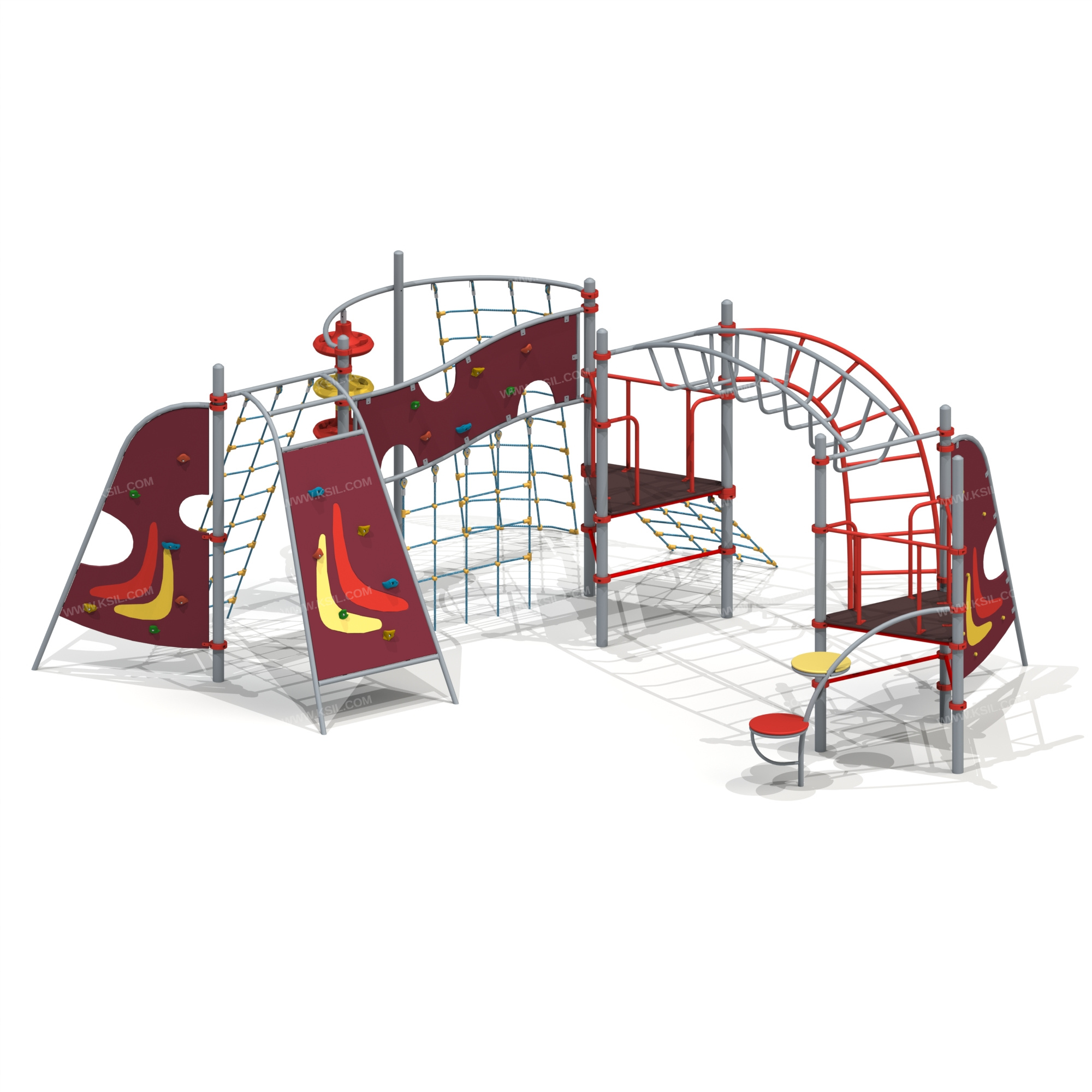 Спортивный комплекс должен представлять собой модульную сборно-разборную конструкцию и состоять из 2-х треугольных башен с навесным оборудованием соединенных между собой рукоходом и спортивной секции. Секция должна включать в себя: 4-е альпинистские стенки, две из которых неправильной формы, третья - наклонная в виде трапеции, четвертая – в виде перехода, 4-е полипропиленовые сетки для лазанья, две из которых наклонные, крепящиеся к перекладине наклонной альпинисткой стенки и дугообразной перекладине и одна вертикальная, крепящаяся к альпинисткой стенке – переходу, вертикальный шест с колесами, дугообразную лестницу, наклонная сетка к треугольной площадке. Все навесное оборудование должно крепиться при помощи хомутов диаметром не менее 140 мм. Башня 1 должна включать в себя: металлические ограждения, перекладины, дугообразную лестницу для лазанья, наклонную полипропиленовую сетку.Башня 2 должна включать в себя: металлические ограждения, перекладины, альпинистскую стенку неправильной формы и металлическую дугу с двумя разноуровневыми круглыми супеньками.Несущие столбы комплекса должны быть выполнены из металлической трубы диаметром не менее 89 мм. Сверху столб должен заканчиваться заглушкой, снизу столб должен бетонироваться в землю.Пол башен должен быть выполнен из влагостойкой противоскользящей фанеры толщиной не менее 21 мм. Альпинистская стенка неправильной формы должна состоять из изогнутой металлической трубы диаметром не менее 42 мм и стенки с зацепами из влагостойкой фанеры толщиной не менее 21 мм. Дуга должна быть выполнена из металлической трубы диаметром не менее 42 мм с круглыми ступеньками из влагостойкой фанеры толщиной не менее 21 мм на металлическом каркасе с ребрами жесткости.Рукоход должен состоять из 2-х балок, 2-х направляющих и дугообразных перекладин из металлической трубы диаметром не менее 33 мм.Перекладины дугообразной лестницы, перекладины башен, ограждение должны быть выполнены из металлической трубы диаметром не менее 33 мм. Сетки должны быть выполнены из полипропиленового 6-прядного армированного металлом каната тросовой свивки с резиновым сердечником, канат сетки должен быть диаметром не менее 16 мм и соединен между собой пластиковыми креплениями овальной формы. Альпинистская наклонная стенка должна состоять из 2-х изогнутых металлических труб, 3-х перекладин диаметром не менее 42 мм и стенки в виде трапеции с зацепами из влагостойкой фанеры толщиной не менее 21 мм. Альпинистская стенка в виде перехода должна состоять из 2-х волнообразных металлических балок диаметром не менее 42 мм, 2-х стоек диаметром не менее 33 мм и стенки с зацепами неправильной формы из влагостойкой фанеры толщиной не менее 21 мм. Вертикальный шест должен быть выполнен из металлической трубы диаметром не менее 48 мм и крепиться к дугообразной перекладине диаметром не менее 42 мм. Колеса в количестве не менее 6-ти штук должны быть выполнены из пластика. Нижняя часть шеста бетонируется в землю.