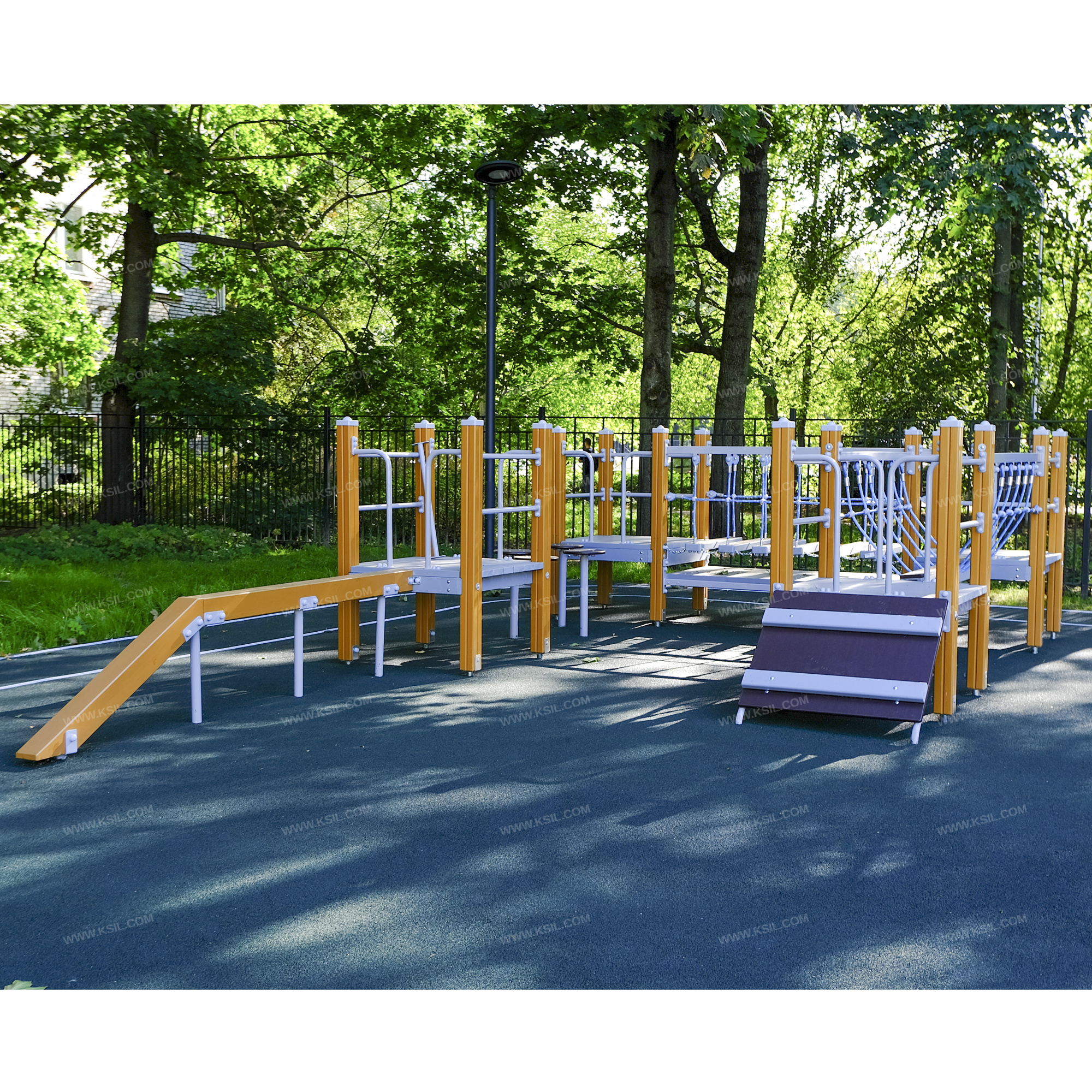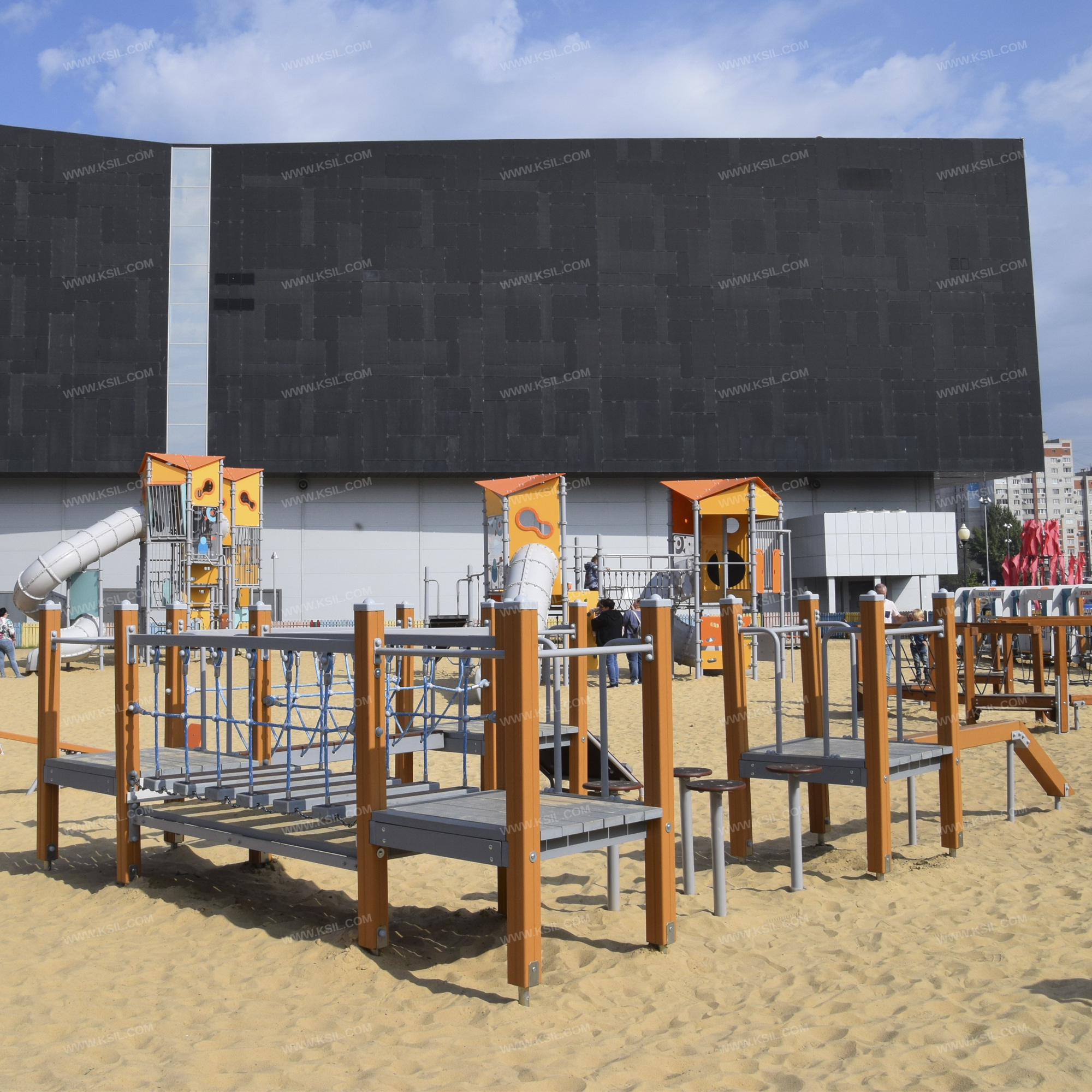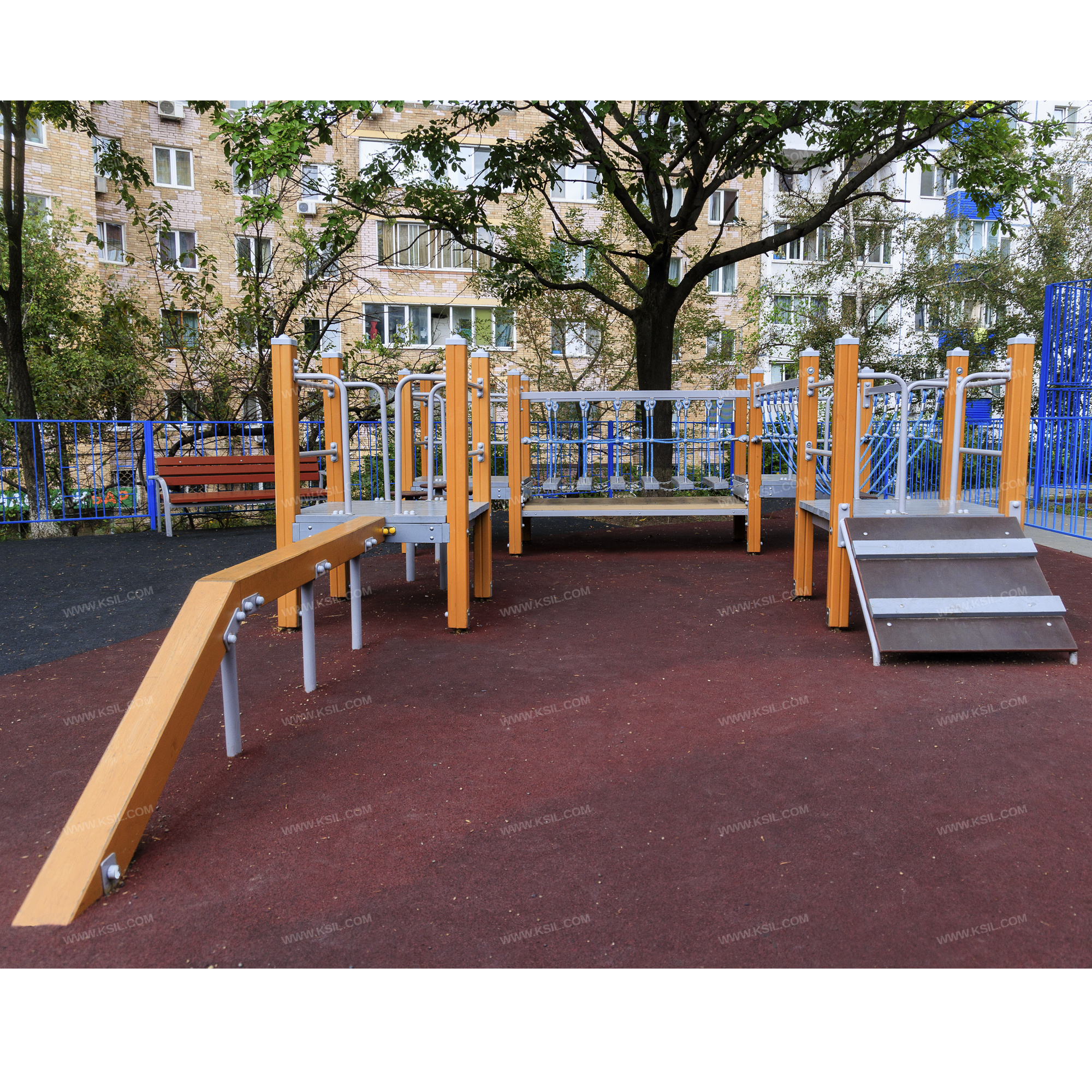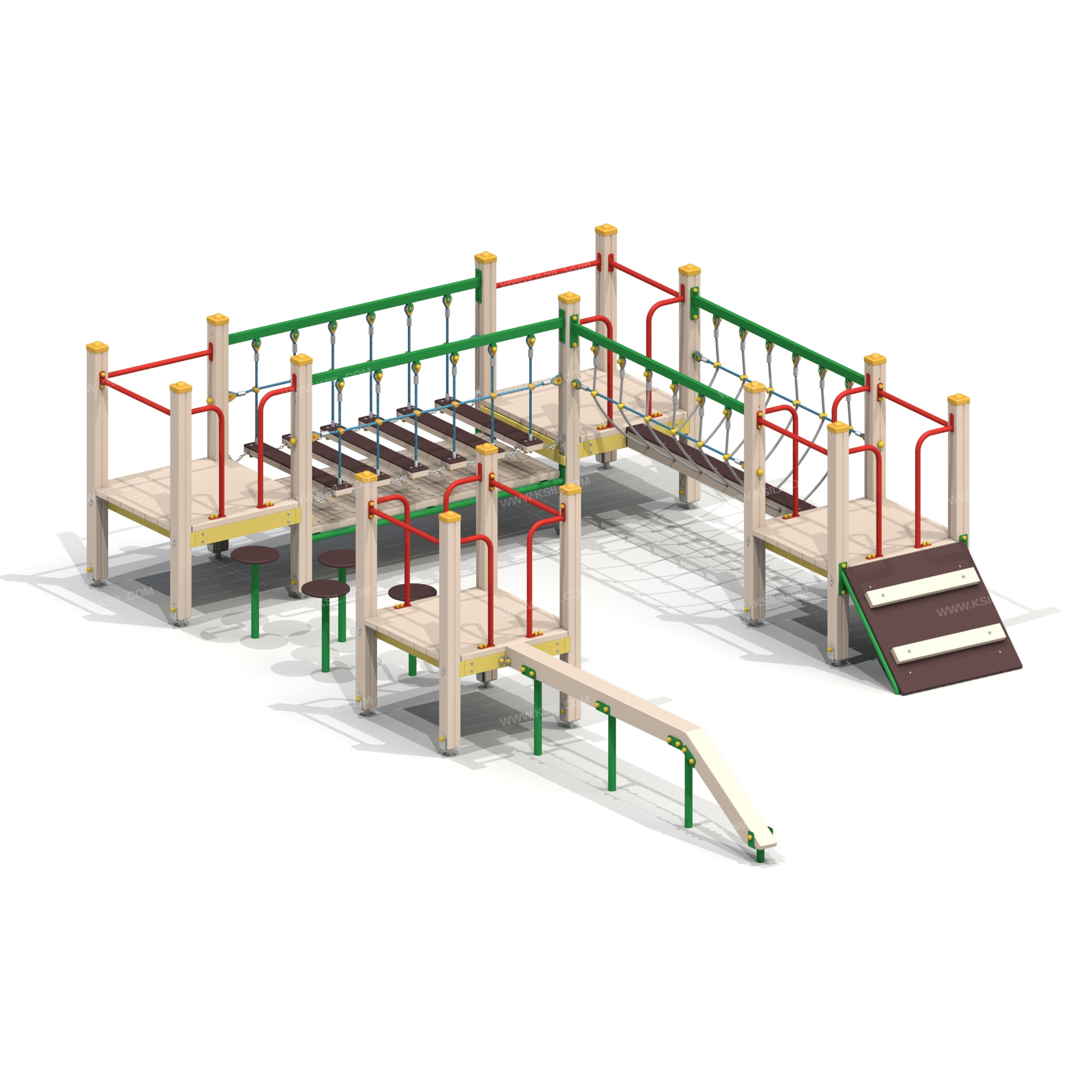 Спортивный комплекс должен представлять собой модульную сборно-разборную конструкцию и состоять из 4-х башен, соединенных между собой подвесным мостом с бревном, подвесным мостом, переходом в виде переправы. К башне 1 должны быть пристроены: входной трап, перекладины, поручни. К башне 2 должны быть пристроены: перекладины, поручни.К башне 3 должны быть пристроены: перекладины, поручни.К башне 4 должны быть пристроены: перекладины, поручни, бум бревно.Несущие столбы комплекса должны быть выполнены из клееного деревянного бруса сечением не менее 100х100 мм и иметь скругленный профиль с канавкой посередине. Сверху столб должен заканчиваться пластиковой заглушкой, снизу столб должен заканчиваться металлическим оцинкованным подпятником диаметром не менее 42 мм, который бетонируется в землю.Пол башен должен быть выполнен из деревянной доски толщиной не менее 40 мм.Перекладины, поручни должны быть выполнены из металлической трубы диаметром не менее 33 мм. Входной трап должен состоять из каркаса, выполненного из металлической трубы диаметром не менее 33 мм, настила выполненного из влагостойкой фанеры толщиной не менее 21 мм, к которому должны крепиться деревянные доски толщиной не менее 40 мм.Бум бревно с откосом должно быть выполнено из клееного деревянного бруса сечением не менее 130х130 мм и установлено на металлических стойках. Переход в виде переправы должен быть выполнен из круглых ступенек из ламинированной нескользящей фанеры толщиной 21 мм, установленных на опорных металлических стойках диаметром не менее 42 мм, которые бетонируются в землю.Подвесной мост должен состоять из страховочного моста, подвесного моста со ступеньками и перил. Ступеньки должны быть выполнены из влагостойкой ламинированной фанеры толщиной не менее 15 мм и доски толщиной не менее 40 мм склеенных между собой, каждая ступень должна крепиться к полиамидным канатам, диаметром не менее 16 мм. Канат должен крепиться к перилам мостика, выполненных из металлической трубы сечением не менее 60х30 мм. Страховочный мост должен быть выполнен из деревянной доски толщиной не менее 40 мм. Подвесной мост с бревном должен представлять собой конструкцию из бревна сечением не менее 130х130 мм и перил, выполненных из полипропиленового каната и металлической трубы сечением 60х30мм.