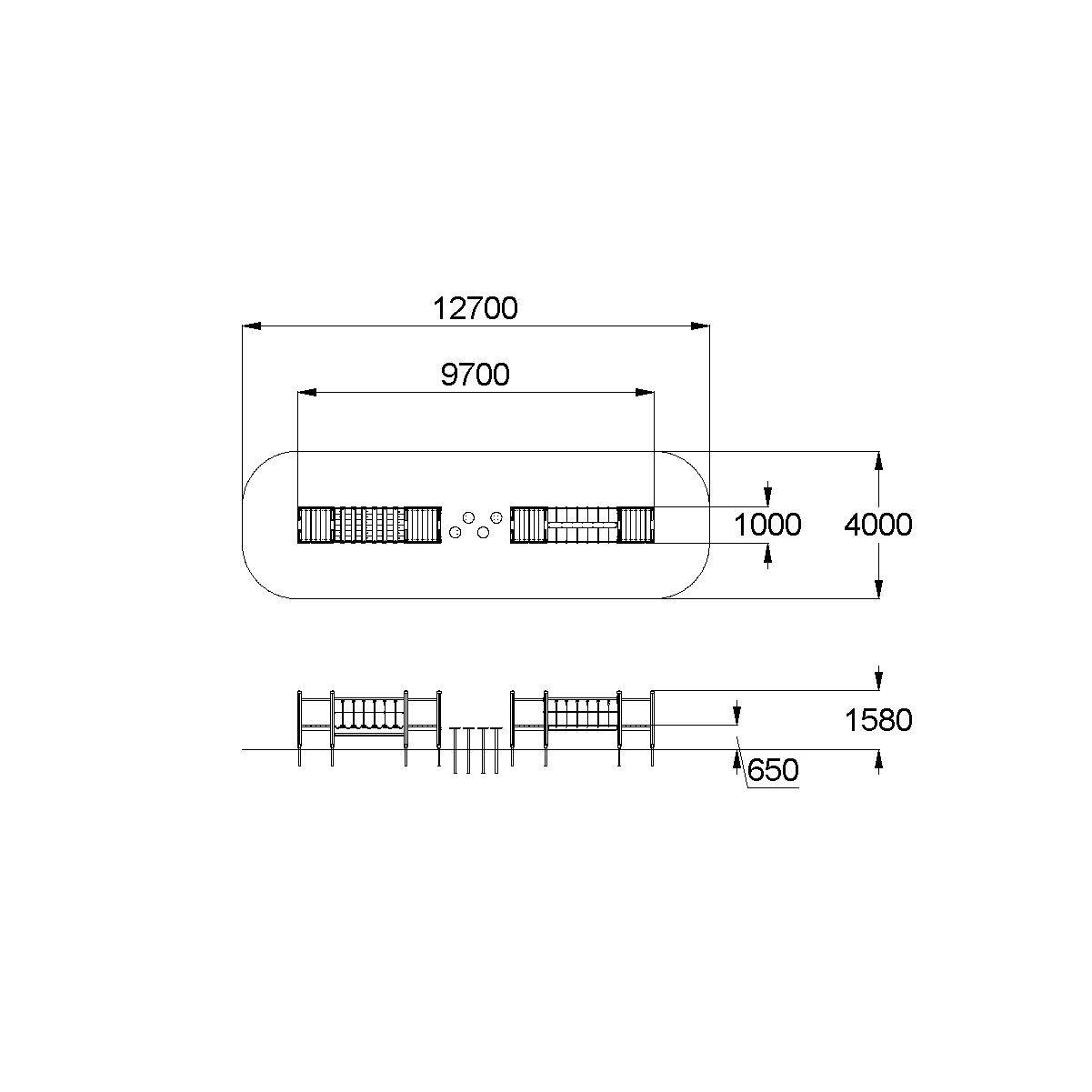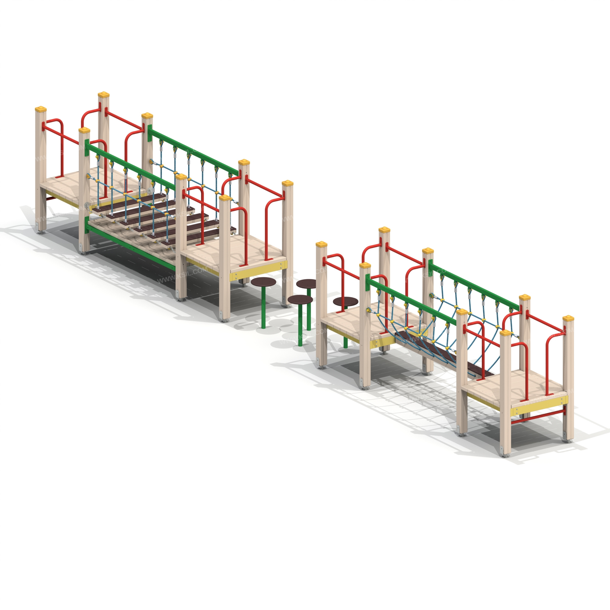 Спортивный комплекс должен представлять собой модульную сборно-разборную конструкцию и состоять из 4-х последовательно расположенных башен и соединенных между собой подвесным бумом с канатом, переходом переправой и подвесным мостом.К башне 1 и к башне 2 должны быть пристроены: ограждения в виде перекладин, поручни с двух сторон. К башне 3 и к башне 4 должны быть пристроены: ограждения в виде перекладин, поручни.Несущие столбы комплекса должны быть выполнены из клееного деревянного бруса сечением не менее 100х100 мм и иметь скругленный профиль с канавкой посередине. Сверху столб должен заканчиваться пластиковой заглушкой, снизу столб должен заканчиваться металлическим оцинкованным подпятником диаметром не менее 42 мм, который бетонируется в землю.Пол башен должен быть выполнен из деревянной доски толщиной не менее 40 мм.Перекладины, поручни, ограждение в виде перекладин должны быть выполнены из металлической трубы диаметром не менее 33 мм. Переход в виде переправы должен быть выполнен из круглых ступенек из ламинированной нескользящей фанеры толщиной 21 мм, установленных на опорных металлических стойках диаметром не менее 42 мм, которые бетонируются в землю.Подвесной мост должен состоять из страховочного моста, подвесного моста со ступеньками и перил. Ступеньки должны быть выполнены из влагостойкой ламинированной фанеры толщиной не менее 15 мм и доски толщиной не менее 40 мм склеенных между собой, каждая ступень должна крепиться к полиамидным канатам, диаметром не менее 16 мм. Канат должен крепиться к перилам мостика, выполненных из металлической трубы сечением не менее 60х30 мм. Страховочный мост должен быть выполнен из деревянной доски толщиной не менее 40 мм и металлического каркаса, выполненного из трубы сечением не менее 50х25мм. Подвесной бум должен представлять собой конструкцию из бревна сечением не менее 130х130 мм и перил, выполненных из полипропиленового каната и металлической трубы сечением 60х30мм.