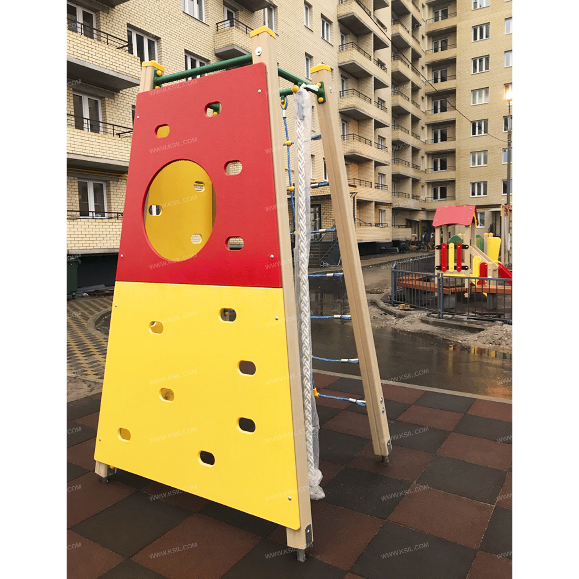 Металлические элементы должны быть покрыты порошковыми красками или подвергнуты гальванизации. Сварные швы должны быть гладкими и исключать возможность травмирования пользователей при контакте. Металлические элементы конструкции не должны состоять из нескольких частей, соединенных между собой.Весь крепеж должен быть оцинкован, все углы закруглены радиусом не менее 3 мм. Концы труб должны быть закрыты.Деревянный брус должен быть склеен под прессом из нескольких отборных сосновых досок, подвергнутых специальной обработке и сушке до мебельной влажности 7-10% для придания особой прочности несущим конструкциям.Фанера влагостойкая не ниже I сорта изготовленная из шлифованного березового шпона повышенной водостойкости, склеенного клеем класса эмиссии Е1 с предварительной заделкой (замазкой или вставками) естественных дефектов древесины.Материалы из древесины не должны иметь на поверхности дефектов обработки. Концы труб должны быть закрыты. Заглушки пластиковые на места резьбовых соединений и крышки на верхние основания несущих столбов.Промежутки и стыки между элементами оборудования не должны допускать застревания частей тела и одежды пользователей. В конструкции должна быть предусмотрена возможность доступа взрослого при обстоятельствах, требующих посторонней помощи пользователю.C целью повышения качества и безопасности продукции, в документацию на изделие могут вноситься изменения (изображение, размеры, и т.п.).