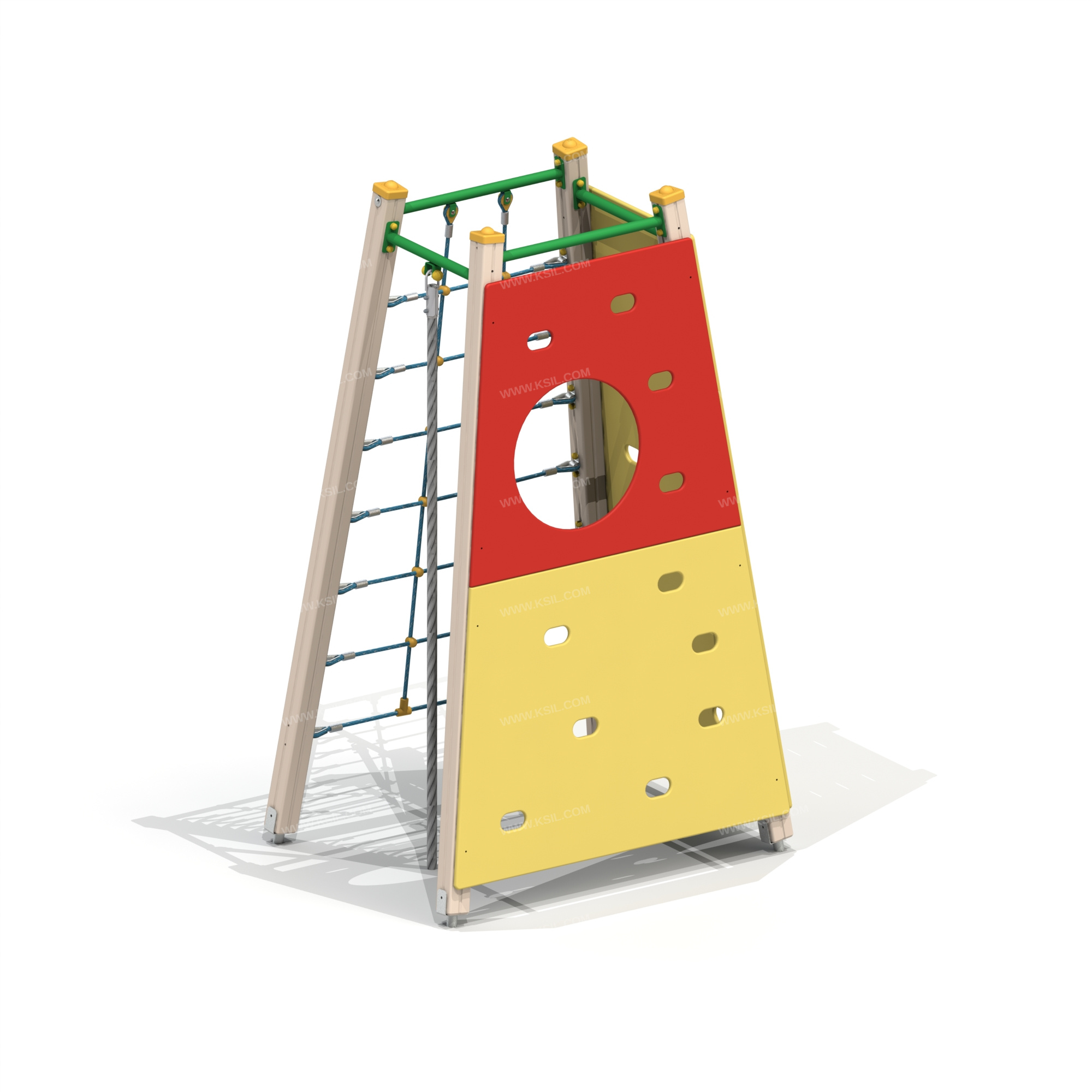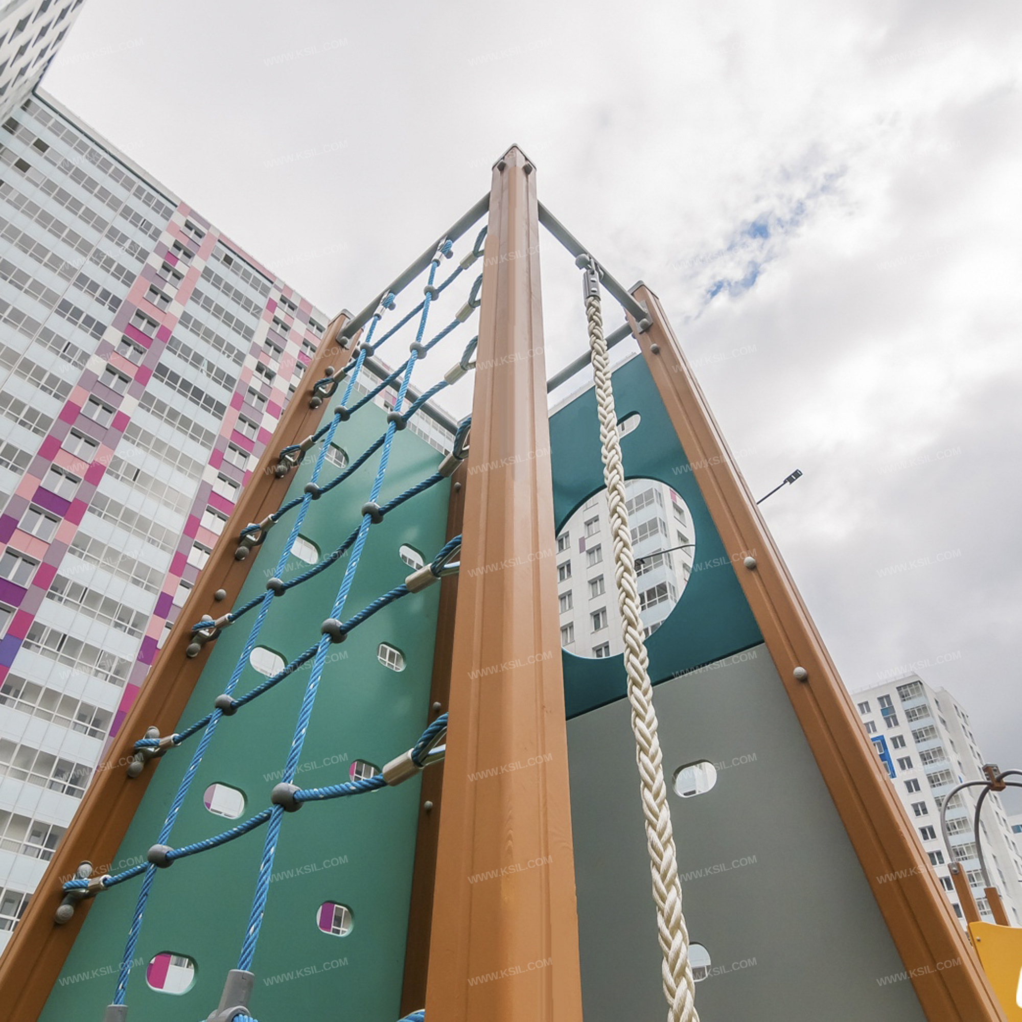 Спортивный комплекс в виде усеченной пирамиды должен представлять собой конструкцию, состоящую из несущих столбов, в верхней части соединенные балками, 3-х альпинистских стенок, расположенных по двум внешним граням комплекса, перекладины с канатом и сетки для лазания.Несущие столбы комплекса должны быть выполнены из клееного деревянного бруса сечением не менее 100х100 мм и иметь скругленный профиль с канавкой посередине. Сверху столб должен заканчиваться пластиковой заглушкой, снизу столб должен заканчиваться металлическим оцинкованным подпятником диаметром не менее 42 мм, который бетонируется в землю.Альпинистские стенки трапециевидной формы с отверстиями для рук и ног и с круглым вырезам должны быть изготовлены из влагостойкой фанеры толщиной не менее 21 мм.Канат должен быть полиамидный или полипропиленовый диаметром не менее 40 мм и подвешен на перекладине, выполненной из трубы диаметром не менее 42 мм.Балки должны быть выполнены из металлической трубы диаметром не менее 42 мм. Трапециевидная сетка должна быть выполнена из полипропиленового 6-прядного армированного металлом каната тросовой свивки с резиновым сердечником, канат сетки должен быть диаметром не менее 16 мм и соединен между собой пластиковыми креплениями овальной формы.