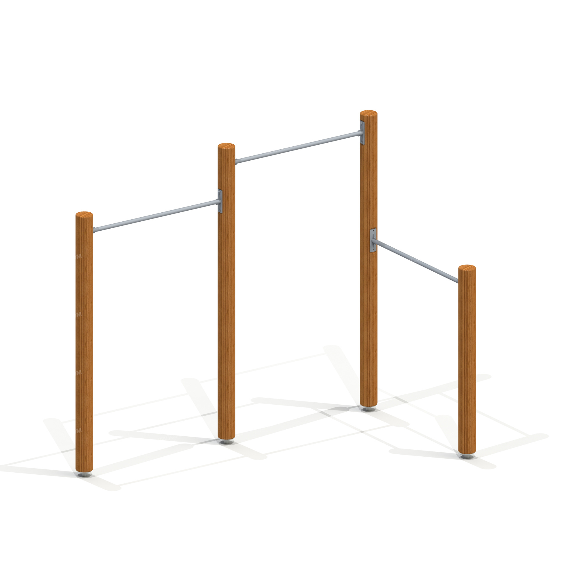 Спортивный комплекс должен представлять собой устойчивую конструкцию, обеспечивающую безопасные условия для занятий спортом на свежем воздухе. Спортивный комплекс должен состоять из 4 несущих стоек, на которые крепятся: 3 турника на разном уровне.Несущие круглые столбы комплекса должны быть выполнены из лиственницы диаметром не менее 140 мм и иметь скругленный торец. Вертикальные столбы снизу должны заканчиваться металлическим оцинкованным подпятником диаметром не менее 42,3 мм, который бетонируется в землю.Турники должны быть выполнены из металлической трубы диаметром не менее 33,5 мм с косынками из металлического листа толщиной не менее 3 мм.