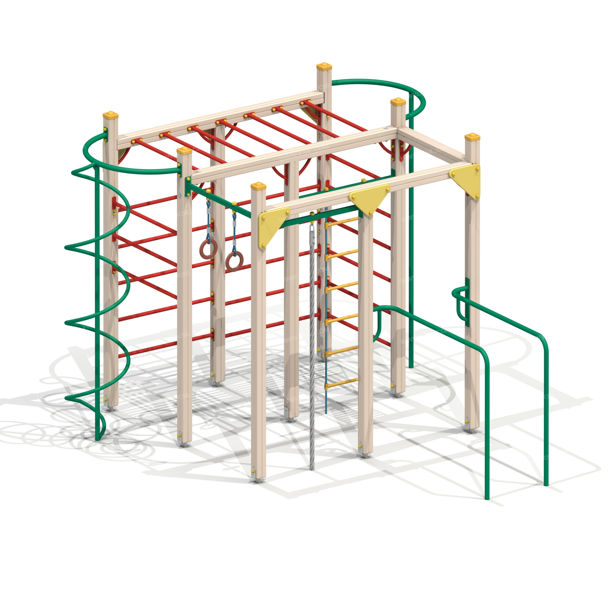 Спортивный комплекс должен представлять собой конструкцию, состоящую из несущих столбов, установленных в три ряда, параллельно друг другу и расположенных на равном расстоянии. В верхней части, в одном из рядов должен быть расположен рукоход. Проемы спортивного комплекса должны быть оснащены: шведскими стенками, гимнастическими кольцами, гибкой лестницей, вертикальным шестом с креплением в виде дуги, вертикальным шестом со спиралью и креплением в виде дуги, канатом, перекладинами, приставными параллельными брусьями и угловыми накладными элементами.Несущие вертикальные столбы комплекса должны быть выполнены из клееного деревянного бруса сечением не менее 100х100 мм и иметь скругленный профиль с канавкой посередине. Сверху столб должен заканчиваться пластиковой заглушкой, снизу столб должен заканчиваться металлическим оцинкованным подпятником диаметром не менее 42 мм, который бетонируется в землю.Канат должен быть полиамидный или полипропиленовый диаметром не менее 40 мм и подвешен на перекладине, выполненной из профильной трубы сечением не менее 50х25 мм.Угловые накладные элементы должны быть выполнены из влагостойкой фанеры толщиной не менее 21 мм. Перекладина с гимнастическими кольцами должна быть выполнена из металлической профильной трубы сечением не менее 50х25 мм, гибкой подвески и колец из влагостойкой фанеры или нелегковоспламеняющегося пластика. Гибкая лестница должна состоять из армированного полипропиленового каната и пластиковых ступенек, закрепленных на металлической профильной трубе диаметром не менее 50х25 мм.Перекладины, перекладины шведской стенки должны быть выполнены из металлической трубы диаметром не менее 33 мм. Вертикальный шест должен быть выполнен из металлической трубы диаметром не менее 42 мм, спираль – из трубы диаметром не менее 33 мм. Расстояние между витками спирали должно быть одинаковым. Нижняя часть шеста бетонируется в землю. Вертикальный шест и дуга должны быть выполнены из металлической трубы диаметром не менее 42 мм. Нижняя часть шеста бетонируется в землю. Параллельные брусья должны состоять из двух жердей, выполненных из металлической трубы диаметром не менее 40 мм.