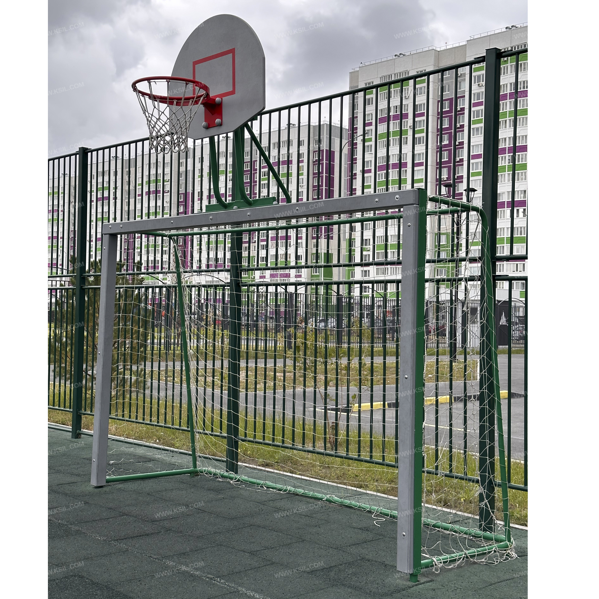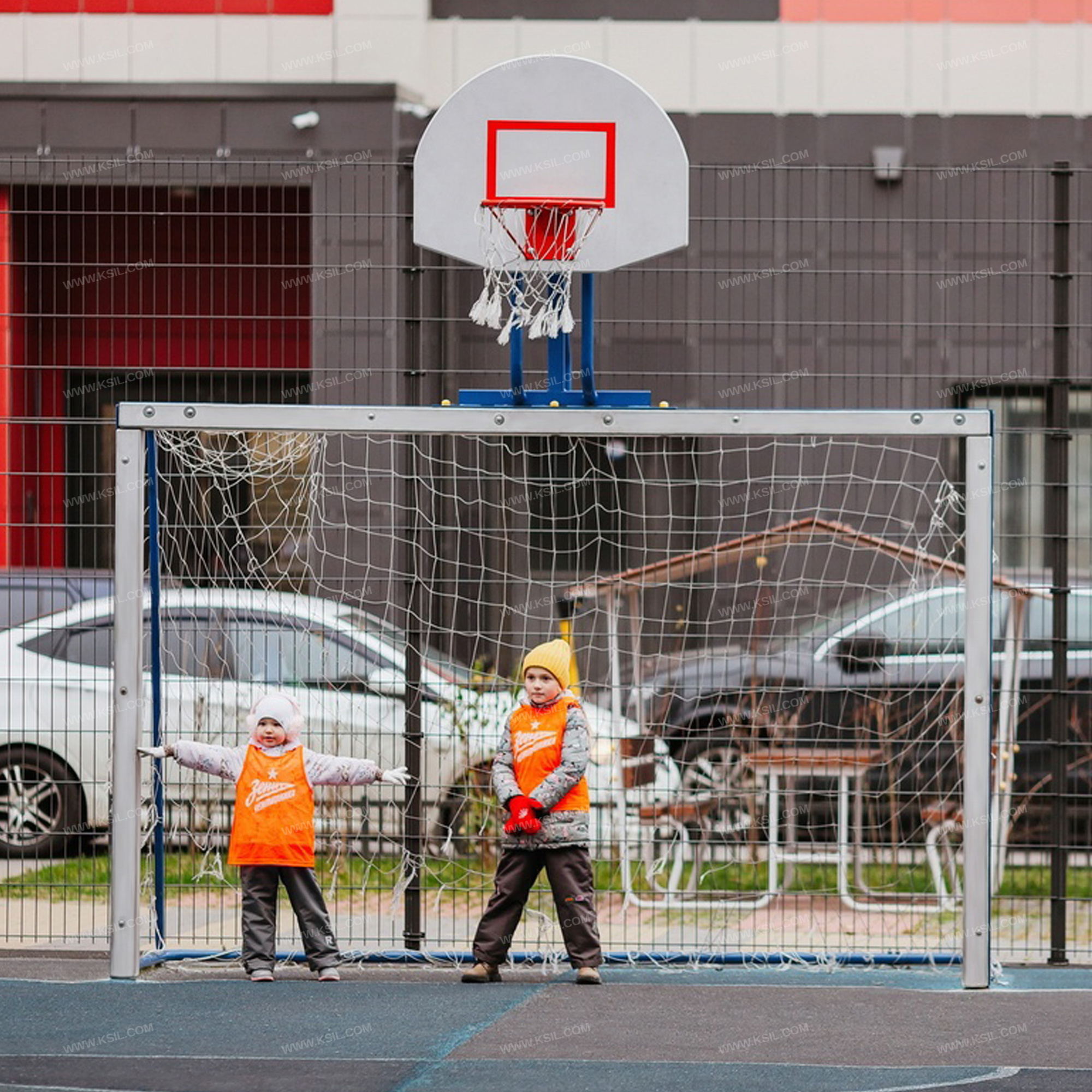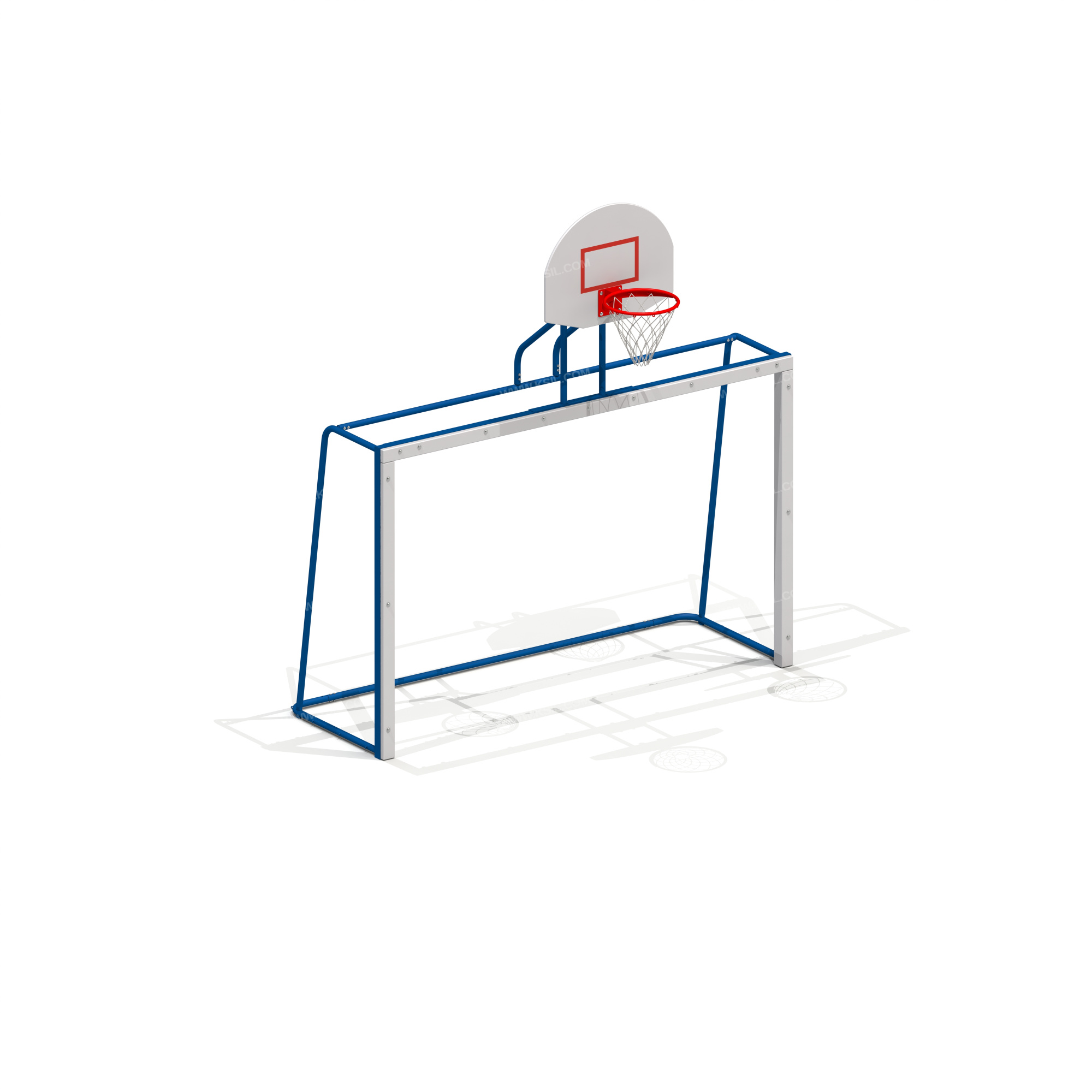 Гандбольные ворота с баскетбольным щитом предназначены для спортивных игр и физического развития ребенка и должны обеспечивать развитие координации движений, ловкости и смелости, чувства коллективизма в массовых играх.Гандбольные ворота должны состоять из металлического каркаса и баскетбольного щита, установленного в верхней части ворот.Каркас ворот должен быть разборным и состоять из двух боковых частей с брусками, верхней балки с бруском и соединительной перекладины. Каркас изготовлен из металлической трубы диаметром не менее 42 мм, металлического равнополочного уголка сечением не менее 63х63 мм и клееного деревянного бруска сечением не менее 90х90 мм.Баскетбольный щит должен состоять из консоли, выполненной из металлической трубы диаметром не менее 42 мм, профильной трубы сечением 60х30 мм и равнополочного уголка 63х63 мм; щита, выполненного из влагостойкой фанеры толщиной не менее 21 мм и баскетбольного кольца из металлической трубы диаметром не менее 21 мм с капроновой сеткой.