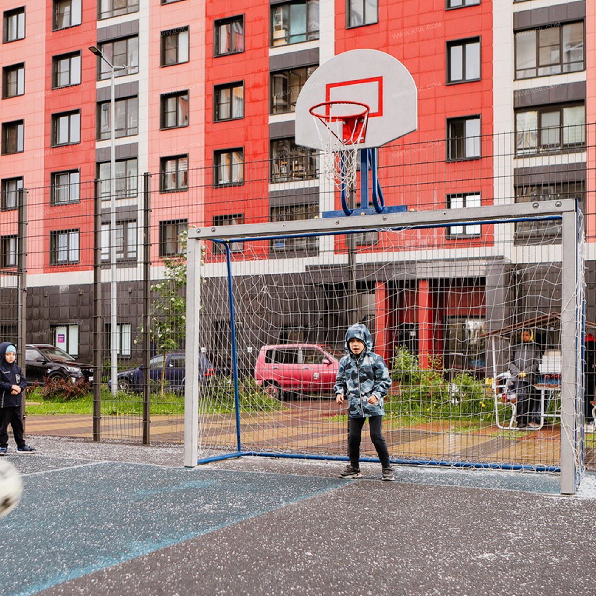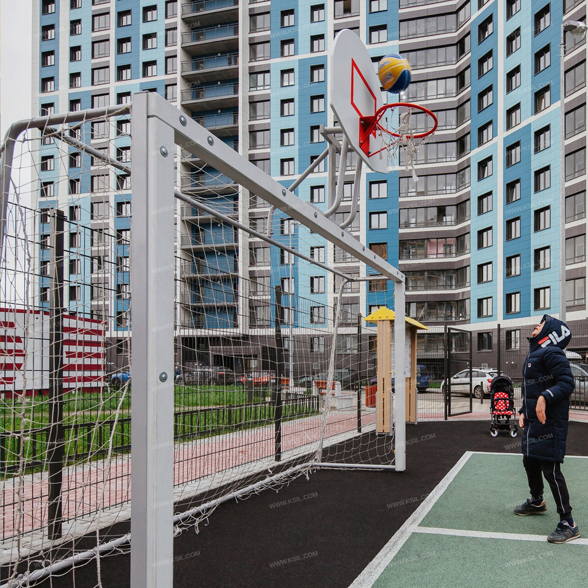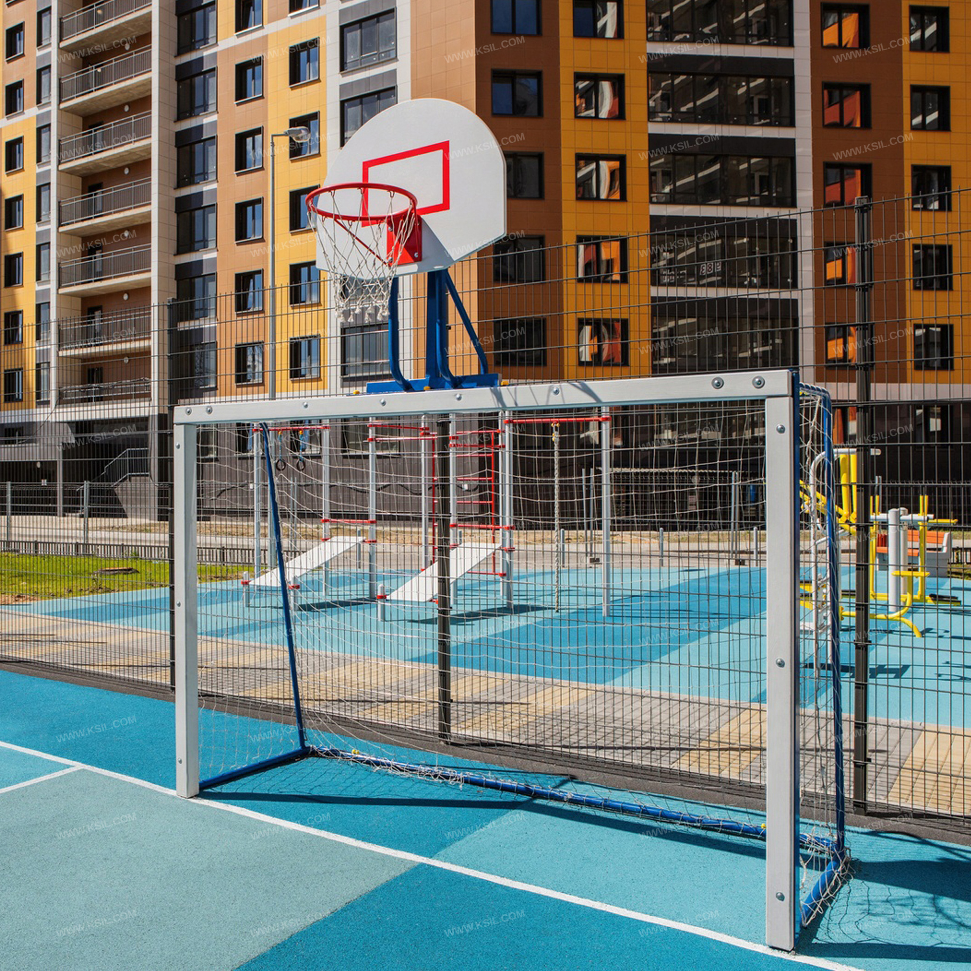Гандбольные ворота с баскетбольным щитом предназначены для спортивных игр и физического развития ребенка и должны обеспечивать развитие координации движений, ловкости и смелости, чувства коллективизма в массовых играх.Гандбольные ворота должны состоять из металлического каркаса и баскетбольного щита, установленного в верхней части ворот.Каркас ворот должен быть разборным и состоять из двух боковых частей с брусками, верхней балки с бруском и соединительной перекладины. Каркас изготовлен из металлической трубы диаметром не менее 42 мм, металлического равнополочного уголка сечением не менее 63х63 мм и клееного деревянного бруска сечением не менее 90х90 мм.Баскетбольный щит должен состоять из консоли, выполненной из металлической трубы диаметром не менее 42 мм, профильной трубы сечением 60х30 мм и равнополочного уголка 63х63 мм; щита, выполненного из влагостойкой фанеры толщиной не менее 21 мм и баскетбольного кольца из металлической трубы диаметром не менее 21 мм с капроновой сеткой.