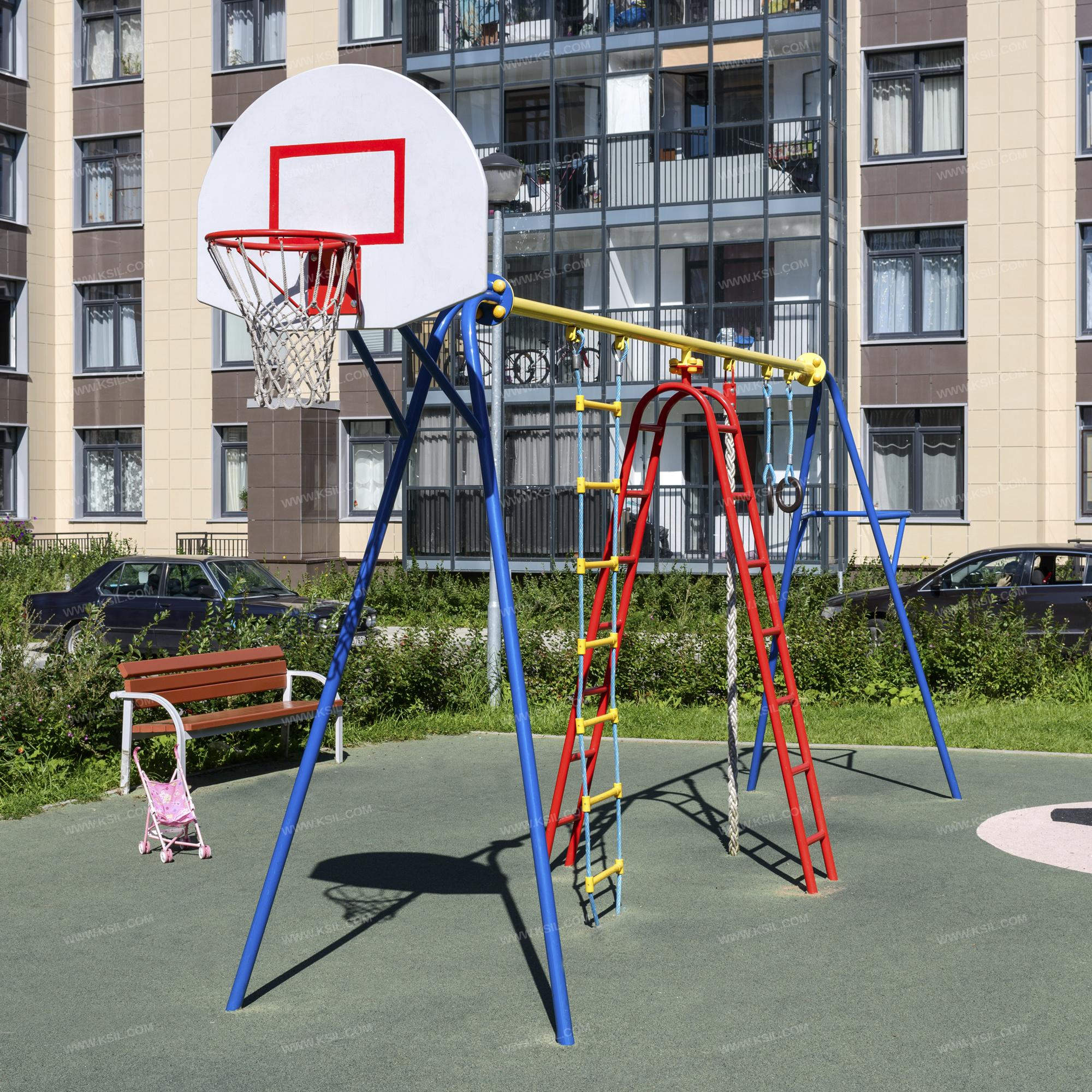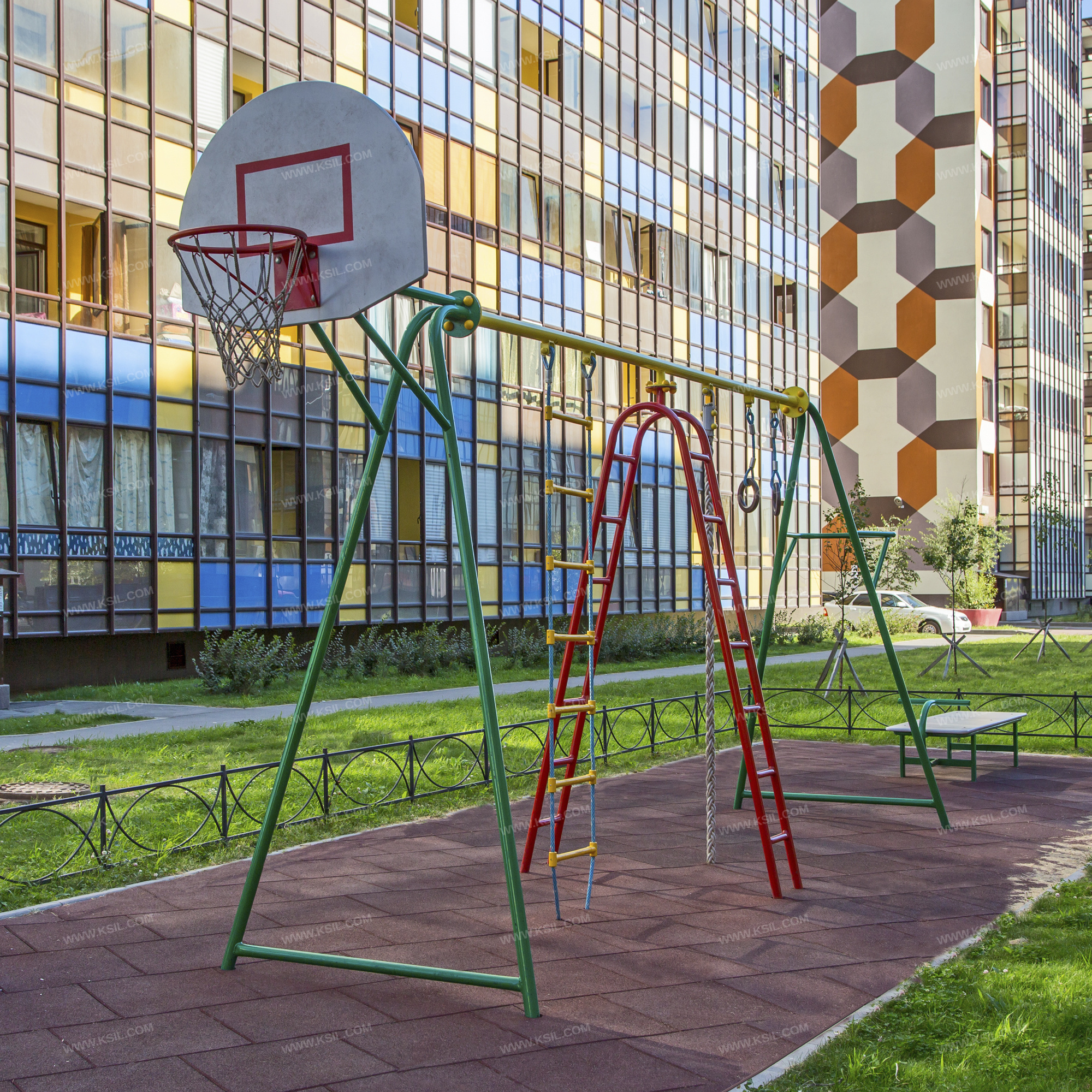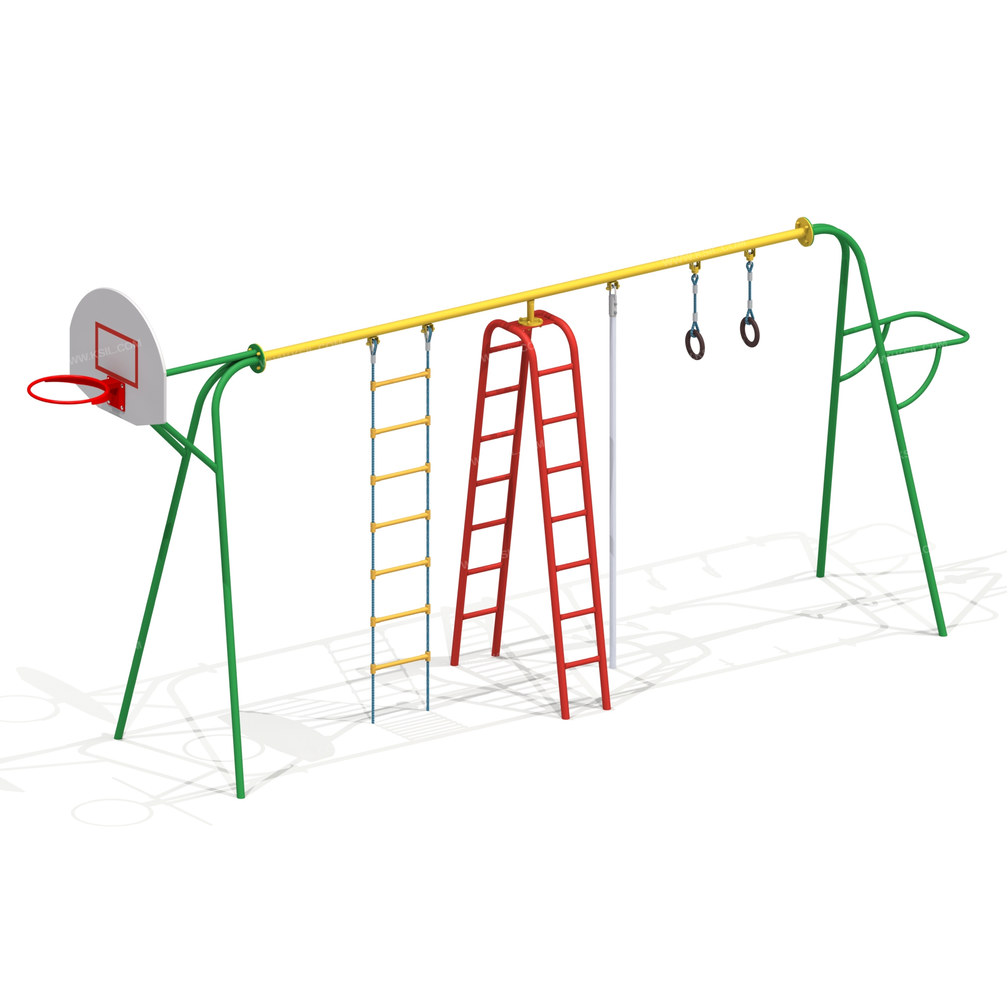 Спортивный комплекс должен представлять собой пространственную устойчивую конструкцию, обеспечивающую безопасное движение детей в вертикальной и горизонтальной плоскости. Спортивный комплекс должен состоять из стоек, верхней балки, баскетбольного щита с кольцом, гимнастических колец, каната, лестницы для лазания, гибкой лестницы, выносной перекладины. Наклонные стойки должны быть выполнены из металлической трубы диаметром не менее 48 мм и соединены в нижней части тяжами из металлической трубы диаметром не менее 33 мм, в верхней части балкой из трубы диаметром не менее 60 мм. Баскетбольный щит с металлическим кольцом должен быть выполнен из влагостойкой фанеры толщиной не менее 21 мм. К кольцу должна крепиться капроновая сетка. Баскетбольный щит должен крепиться к одной из стоек комплекса при помощи кронштейна. Кольцо должно быть закреплено таким образом, чтобы никакое усилие, которое передается от кольца, не воздействовало на баскетбольный щит. Гимнастические кольца должны состоять из колец и гибких подвесов и крепиться к балке комплекса между выносной перекладиной и канатом. Канат полипропиленовый или полиамидный диаметром не менее 40 мм должен быть установлен между гимнастическими кольцами и лестницей для лазания.Лестница для лазания должна состоять из наклонных стоек, дугообразных вставок и ступеней-перекладин, выполненных из металлической трубы диаметром не менее 33 мм. Лестница должна быть установлена между канатом и гибкой лестницей.Гибкая лестница должна состоять из армированного полипропиленового каната, пластиковых ступенек и установлена между лестницей для лазания и баскетбольным щитом. Расстояние между ступенями должно быть одинаковым по всей высоте лестницы.Выносная перекладина должна быть выполнена в виде «П»-образной перекладины с подкосами и крепиться к стойке спортивного комплекса с противоположной стороны от баскетбольного щита.