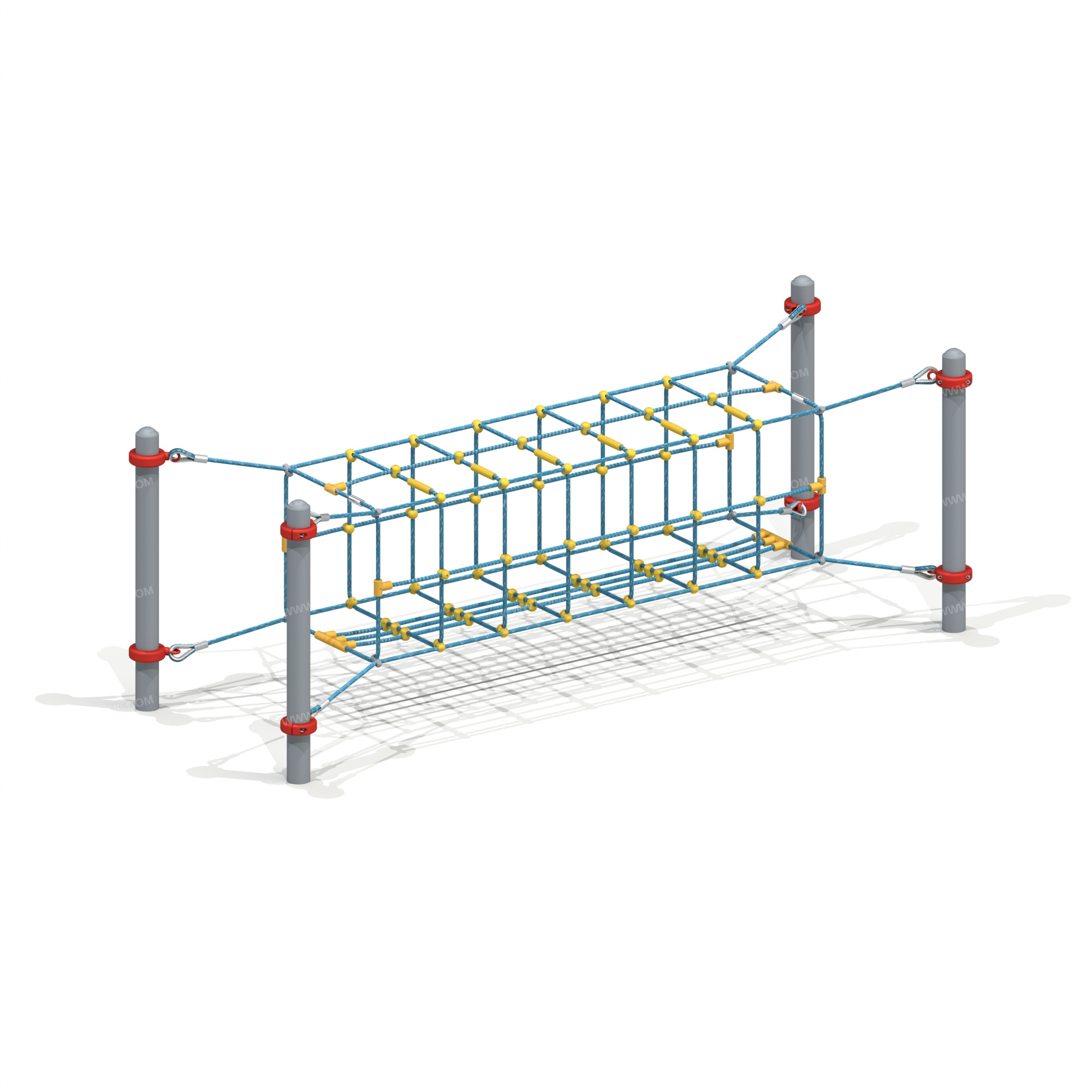 Спортивное оборудование должно представлять собой устойчивую конструкцию и состоять из 4-х несущих столбов с сетка-тоннельным переходом.Несущие стойки должны быть выполнены из металлической трубы диаметром не менее 89 мм с толщиной стенки не менее 3,0мм. Переход должен состоять из полипропиленового армированного каната диаметром не менее 16 мм и пластиковых перекладин. Канаты должны фиксироваться на столбах специальными хомутами.