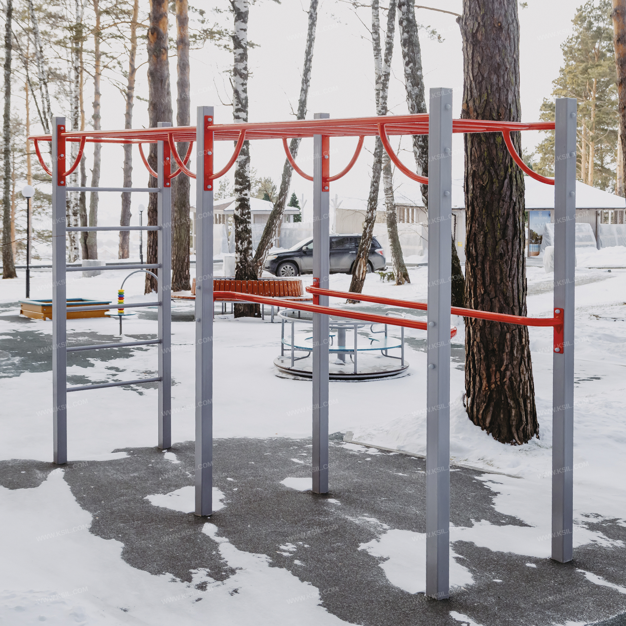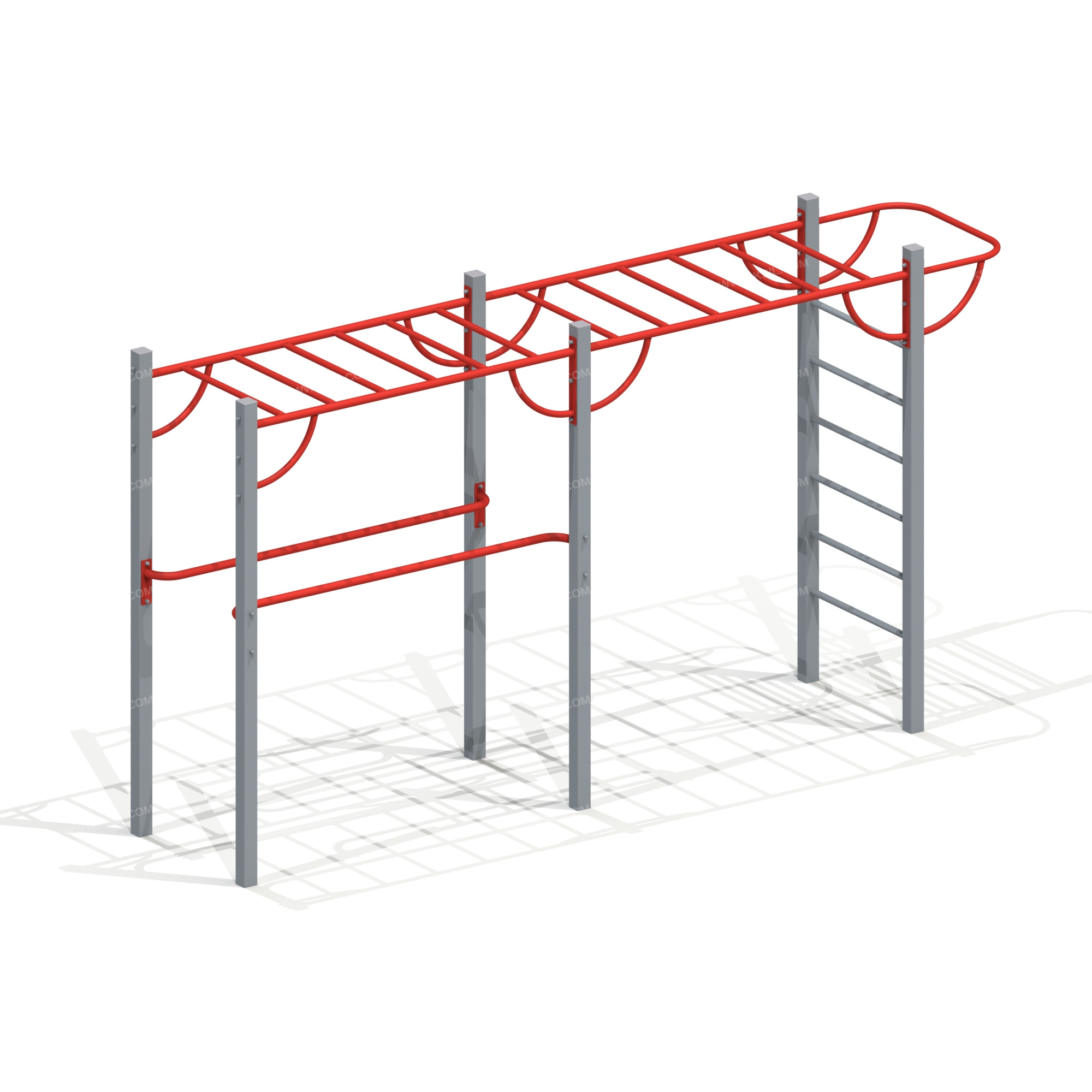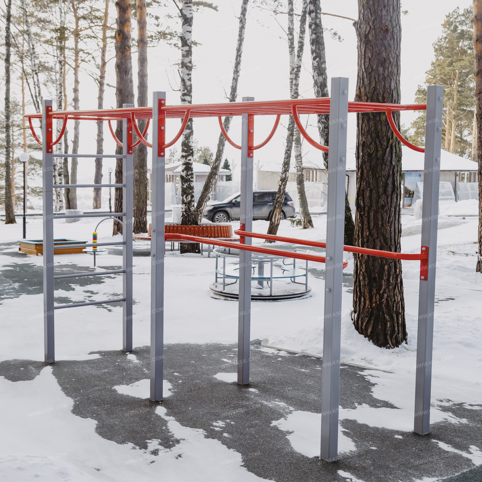 Спортивный комплекс должен представлять собой устойчивую конструкцию, обеспечивающую безопасные условия для занятий спортом на свежем воздухе.Комплекс должен представлять собой конструкцию из 6-ти несущих стоек, установленных в два ряда параллельно друг другу, выполненных из трубы сечением 80*80мм. В проемах должны быть установлены параллельными брусья, шведская стенка, выносной турник. В верхней части стойки должны быть соединены двумя рукоходами. Несущие стойки должны быть выполнены из металлической профильной трубы квадратного или прямоугольного сечения.Рукоход должен состоять из 2-х направляющих металлических труб диаметром не менее 42 мм и перекладин из трубы диаметром не менее 33 мм. Выносной турник должен состоять из гнутой металлической трубы диаметром не менее 33 мм. Перекладины шведской стенки должны быть выполнены из металлической трубы диаметром не менее 33 мм.Жерди параллельных брусьев должны быть выполнены из металлической трубы диаметром не менее 40 мм.