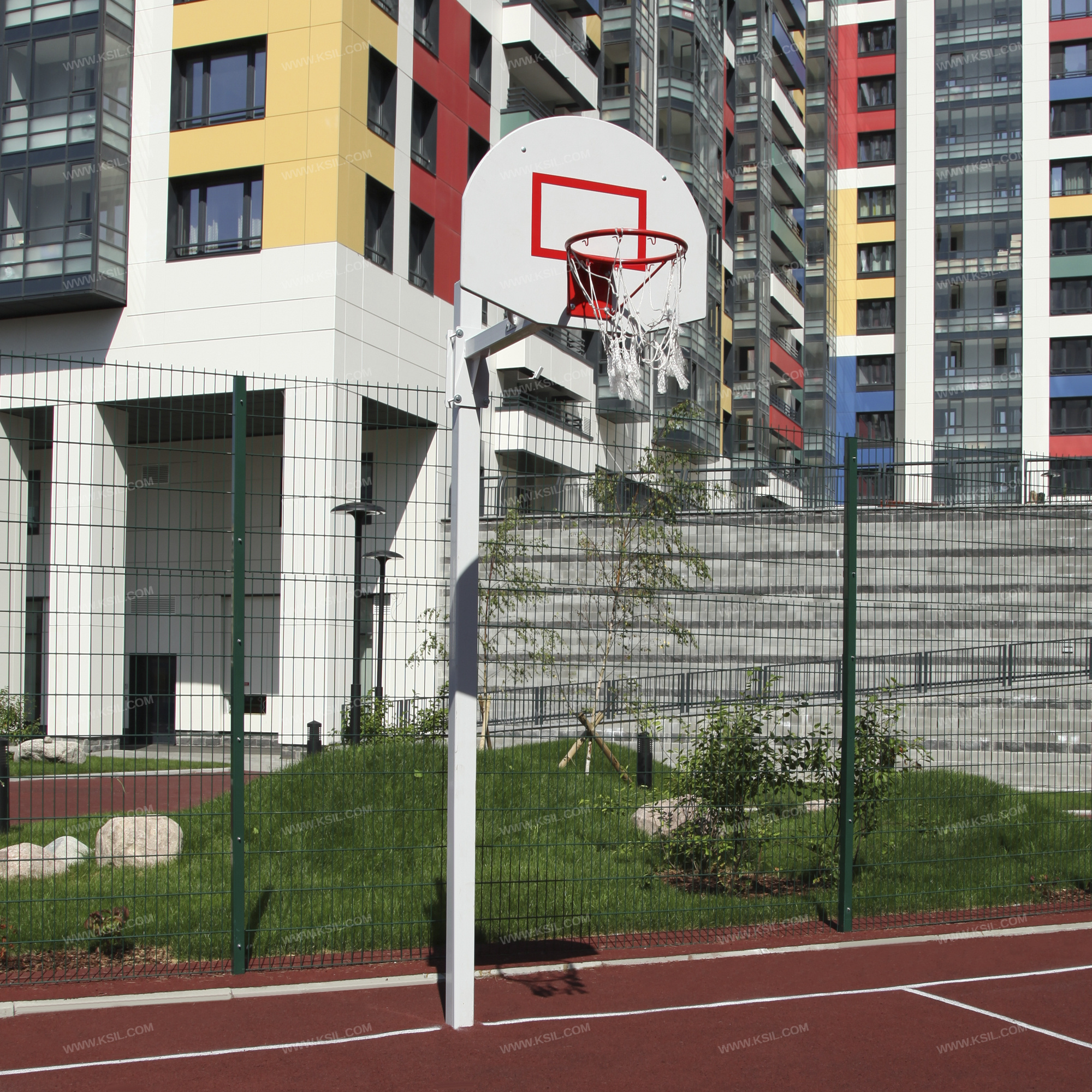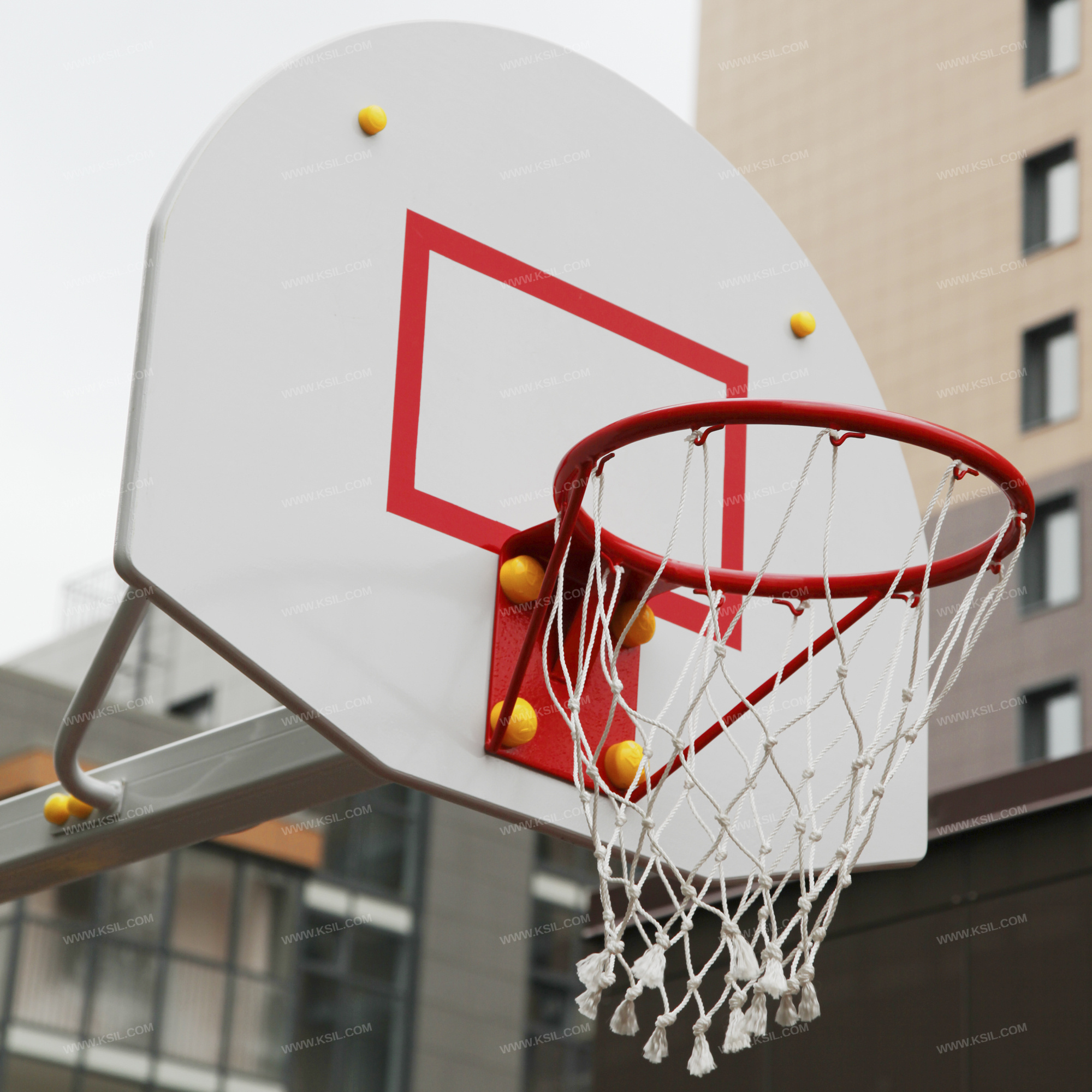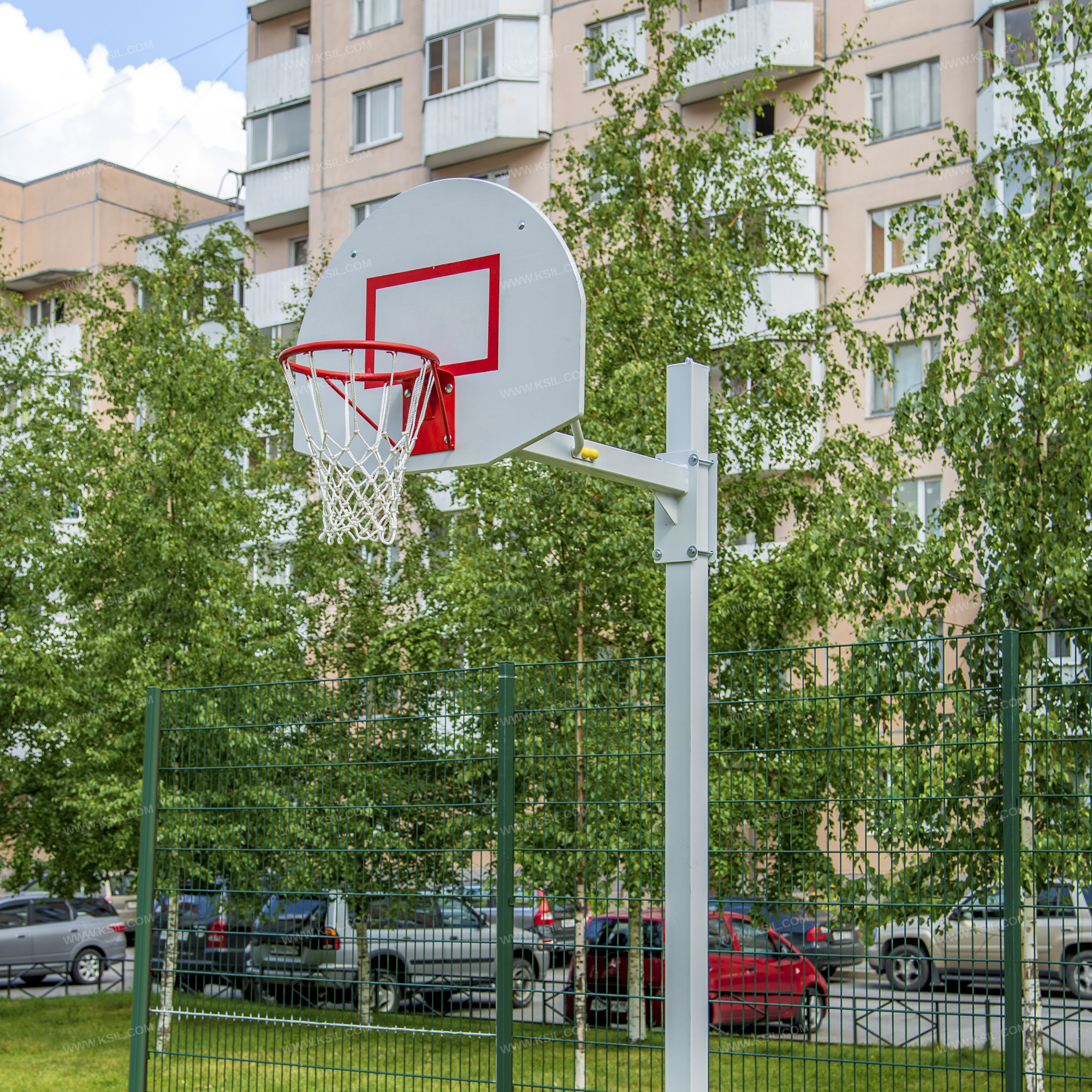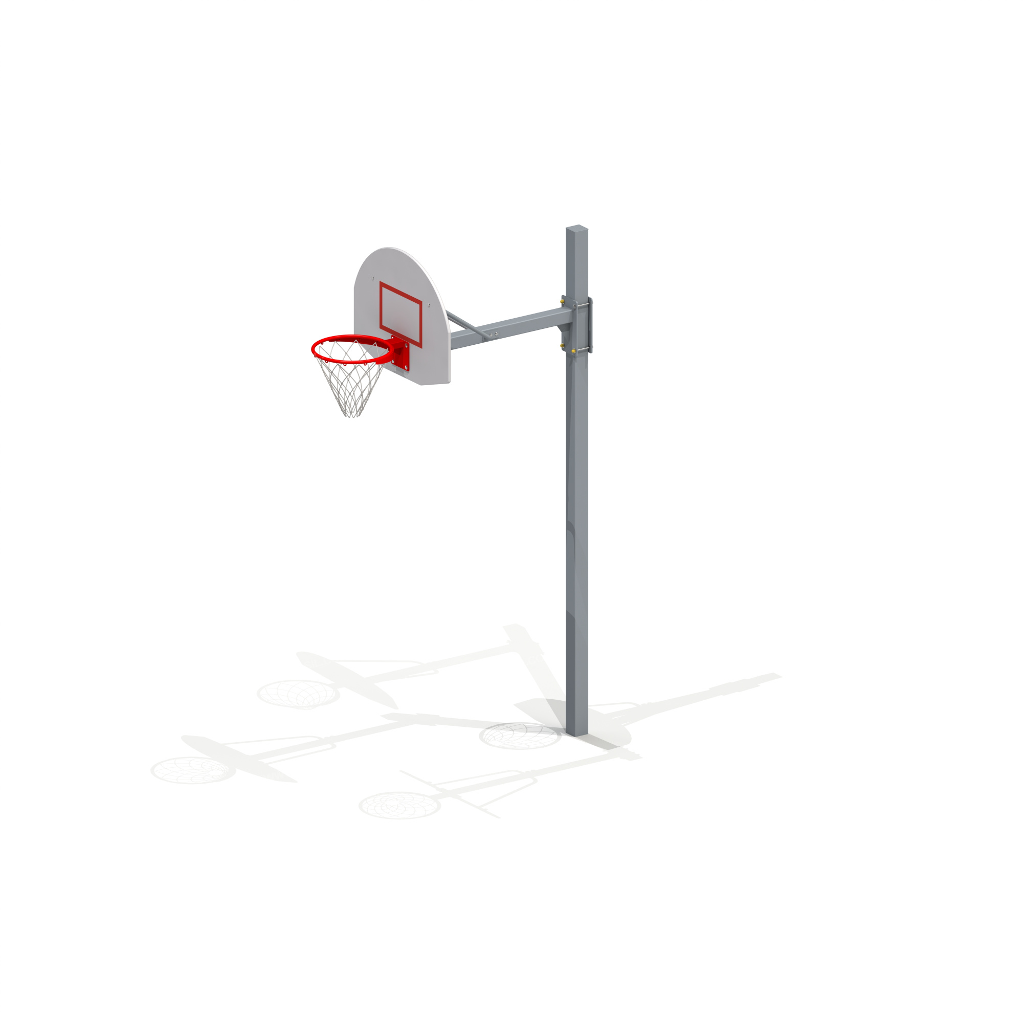 Баскетбольная стойка должна представлять собой устойчивую конструкцию, обеспечивающую безопасные условия для занятий спортом на свежем воздухе.Оборудование должно состоять из стойки, выполненной из металлической профильной трубы сечением не менее 100х100 мм, разборной консоли из трубы сечением не менее 80х80 мм и баскетбольного щита из влагостойкой фанеры толщиной не менее 21 мм с металлическим кольцом. К кольцу должна крепиться капроновая сетка. Кольцо должно быть закреплено таким образом, чтобы никакое усилие, которое передается от кольца, не воздействовало на баскетбольный щит.