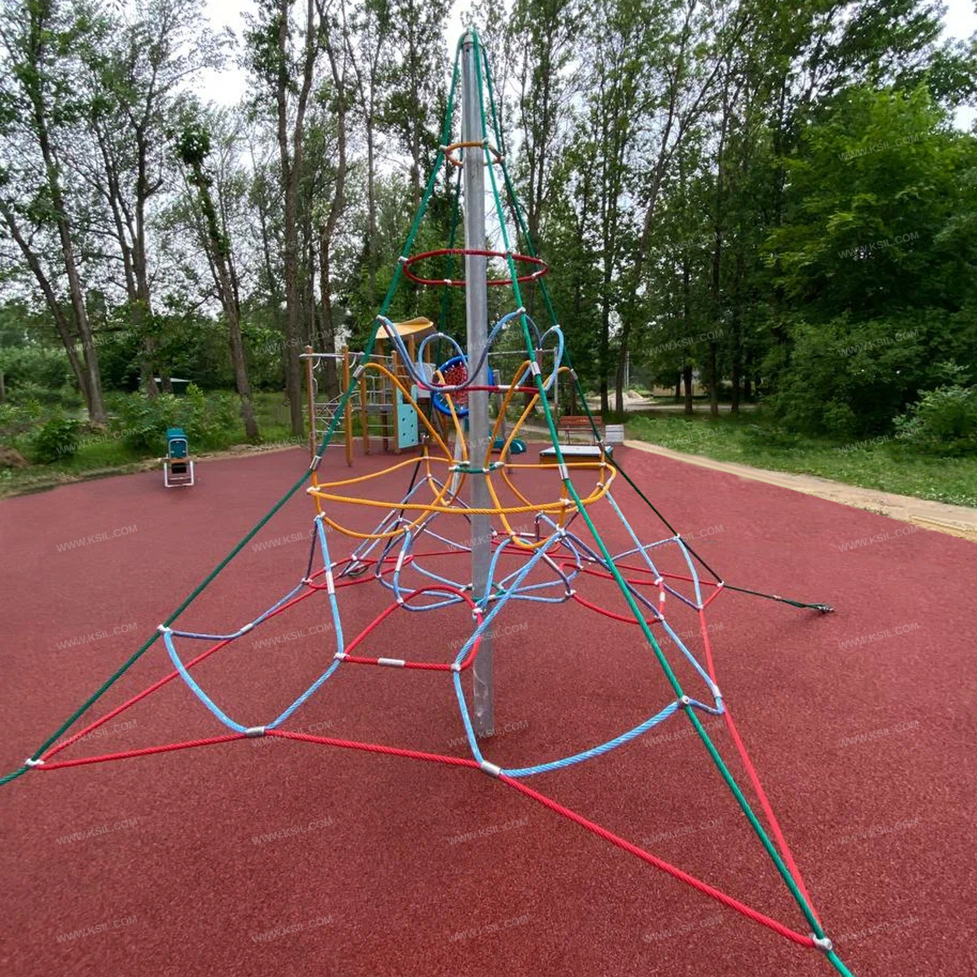 Гимнастическая сетка должна представлять собой устойчивую конструкцию, обеспечивающую безопасные условия для игры на свежем воздухе.Сетка должна состоять из полипропиленового 6-прядного армированного металлом каната тросовой свивки с резиновым сердечником, канат сетки диаметром не менее 16 мм должен быть соединен между собой зажимами и креплениями из алюминиевого сплава. Несущим элементом конструкции сетки должен являться металлический оцинкованный столб диаметром не менее 90 мм, который сверху должен быть закрыт металлической заглушкой.Крепление сетки к земле должно быть выполнено в виде четырех растяжек, позволяющих натягивать сетку и 4 страховочных канатов, которые бетонируются в землю. Все части сетки должны быть надежно закреплены специальными зажимами и креплениями из алюминиевого сплава, позволяющими удерживать конструкцию сетки под нагрузкой.