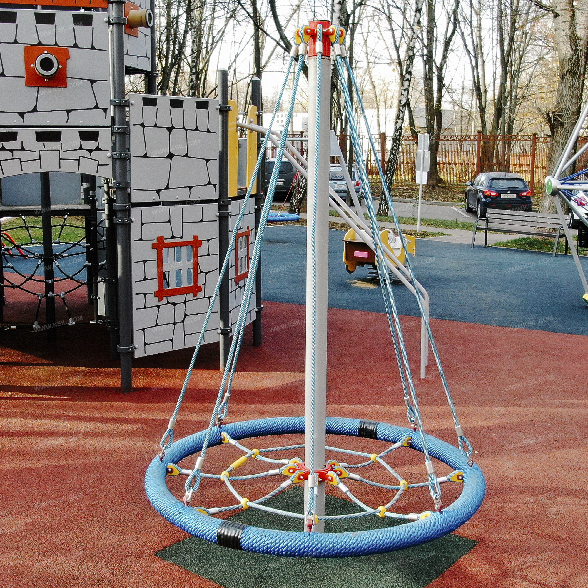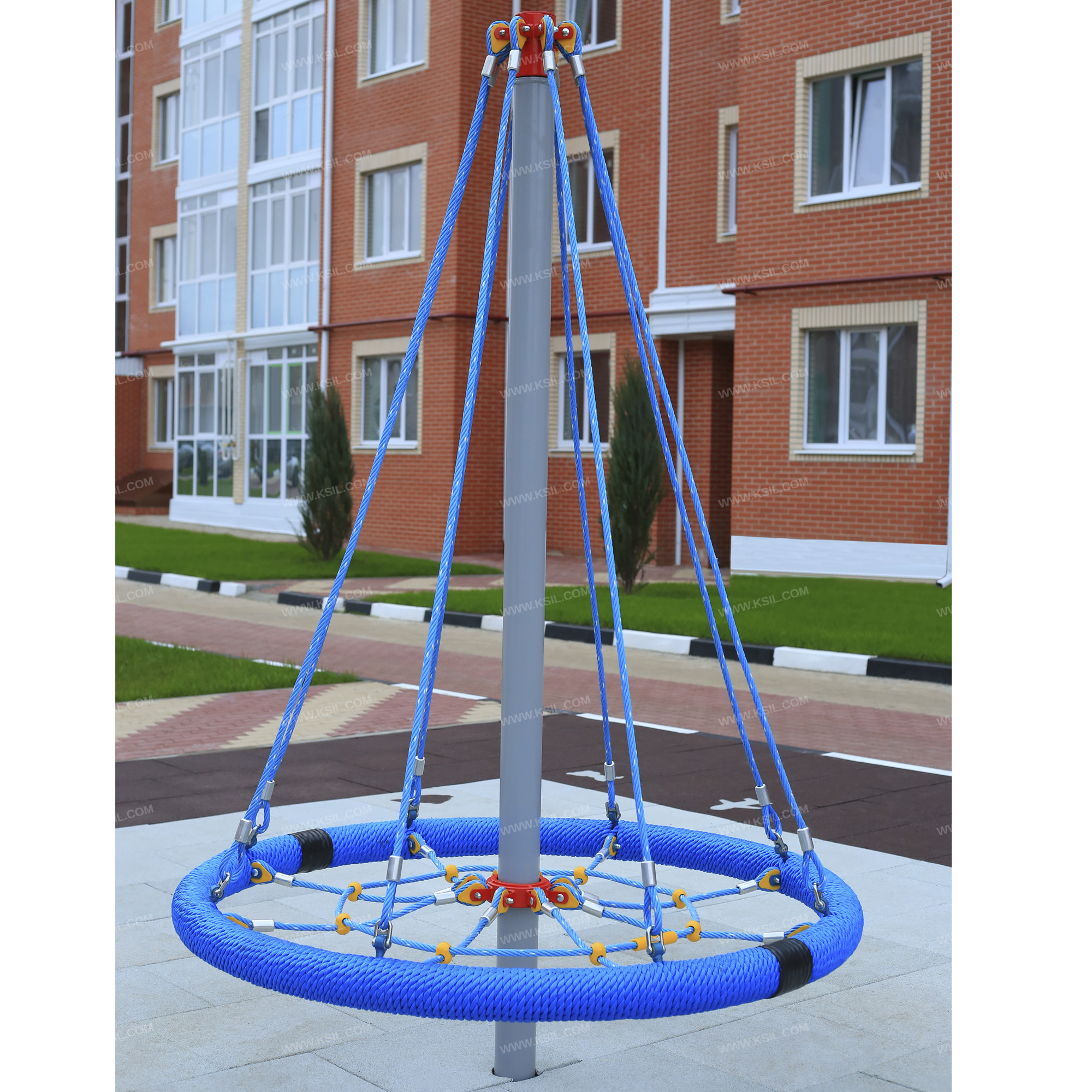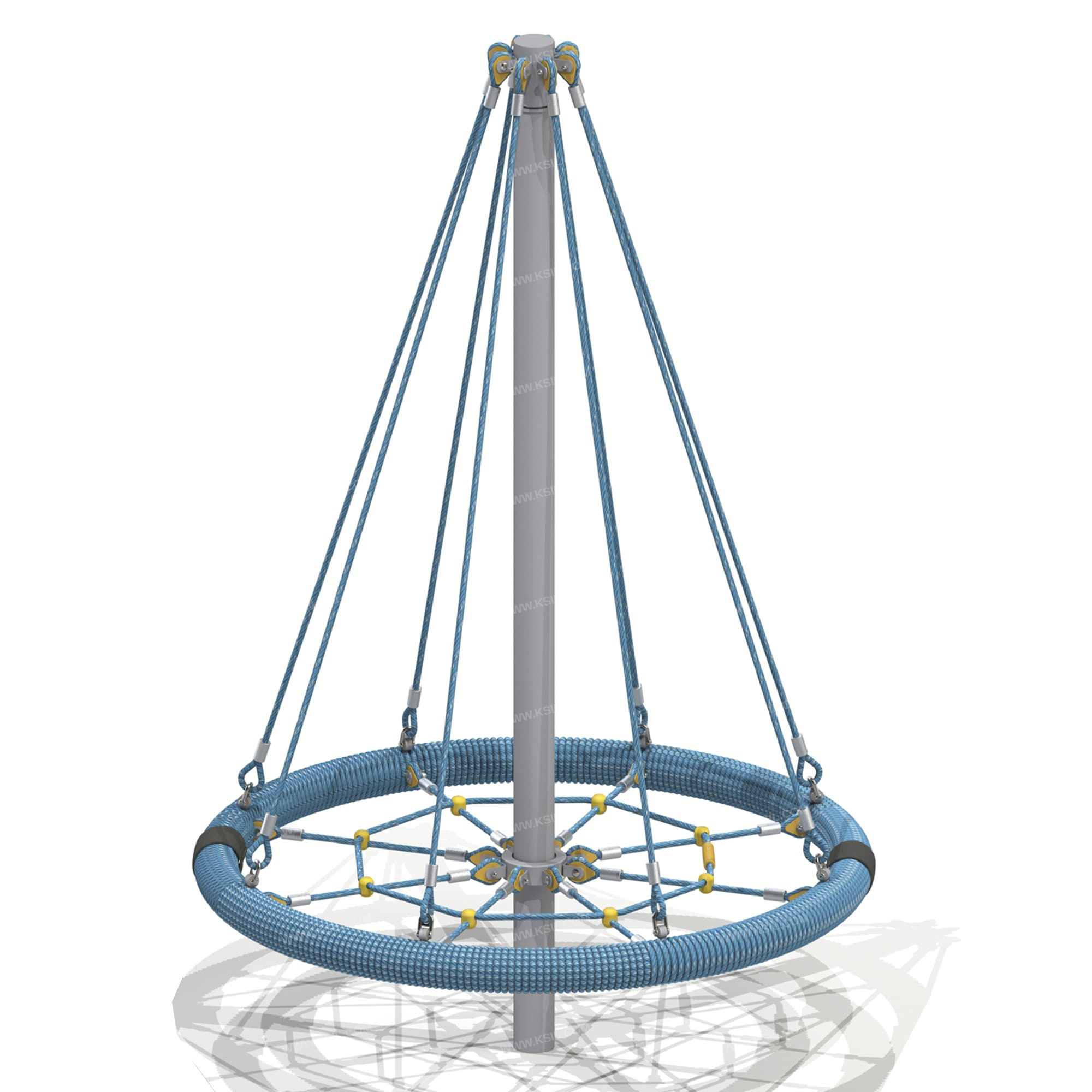 Сетка с вращением должна представлять собой устойчивую конструкцию, обеспечивающую безопасное вращение сетки для детей вокруг вертикальной оси. На центральной металлической стойке, сверху закрытой металлической заглушкой, должно быть установлено круглое сиденье, вращающееся на круглом валу с подшипниками. Сиденье диаметром не менее 1600 мм должно быть выполнено в виде сетки-паутины из полипропиленового армированного каната и наружного кольца из стальной трубы, плотно оплетенного полиамидным канатом. Канат сетки должен быть надежно закреплен специальными пластиковыми креплениями и зажимами из алюминиевого сплава, позволяющими удерживать конструкцию сетки под нагрузкой. Сиденье должно крепиться к несущей стойке в верхней точке на 8-ми лучах из полипропиленового армированного каната. В местах крепления канатов к центральной стойке должны быть использованы закрытые коуши. Центральная стойка выполнена из трубы сечением 100мм.