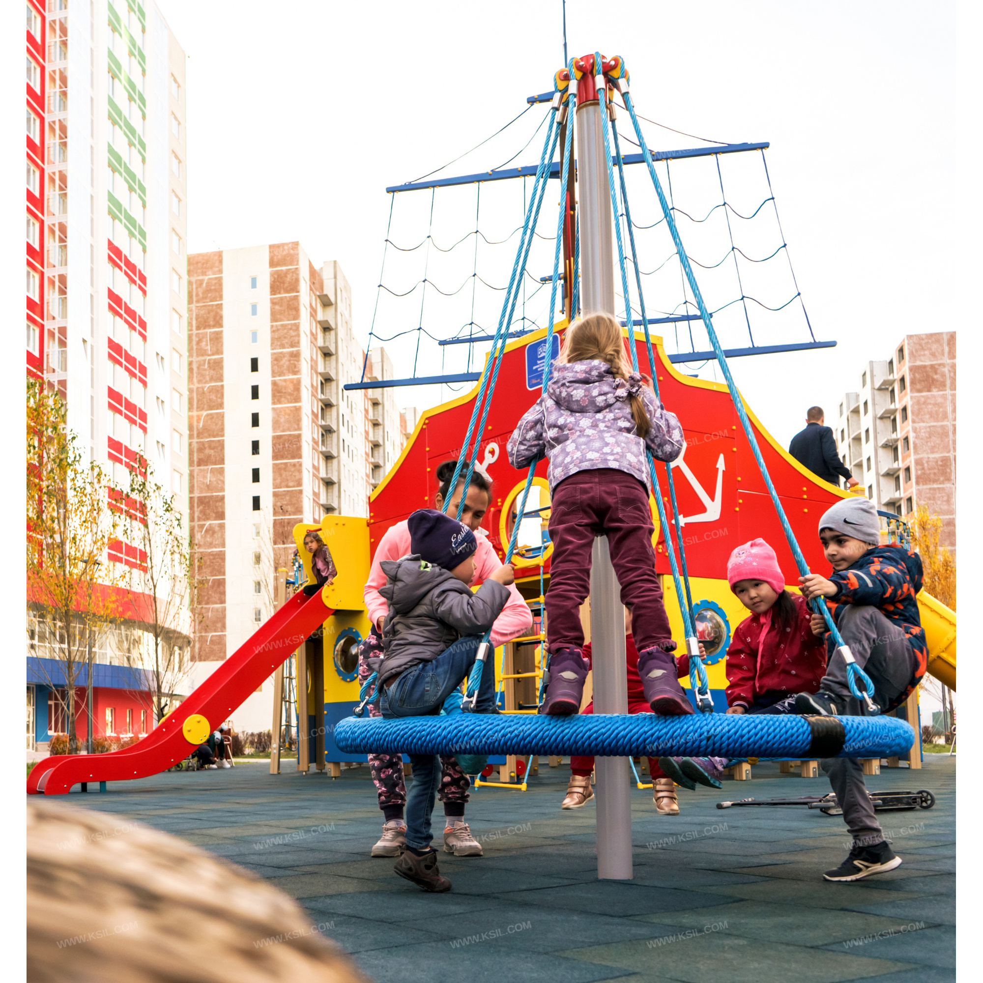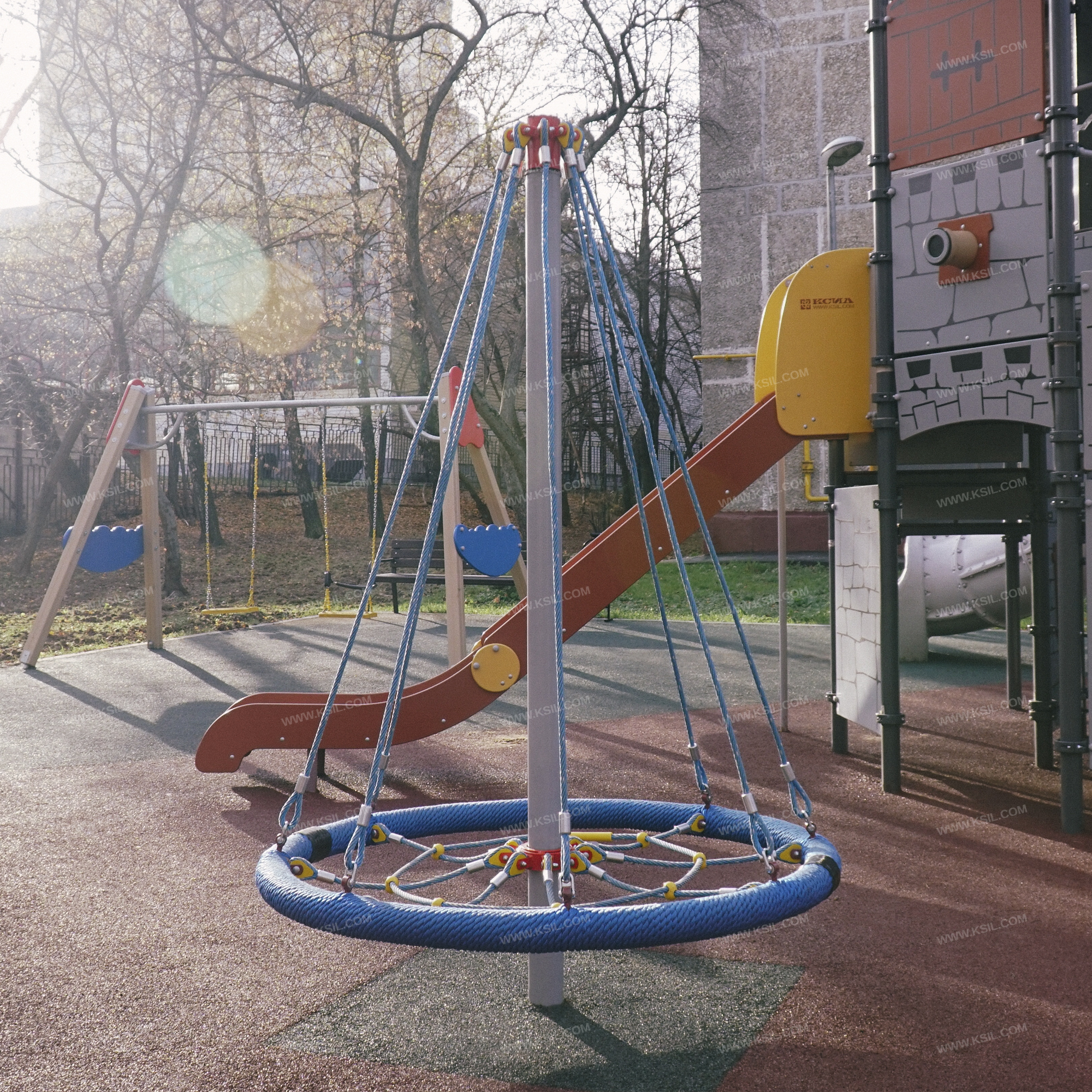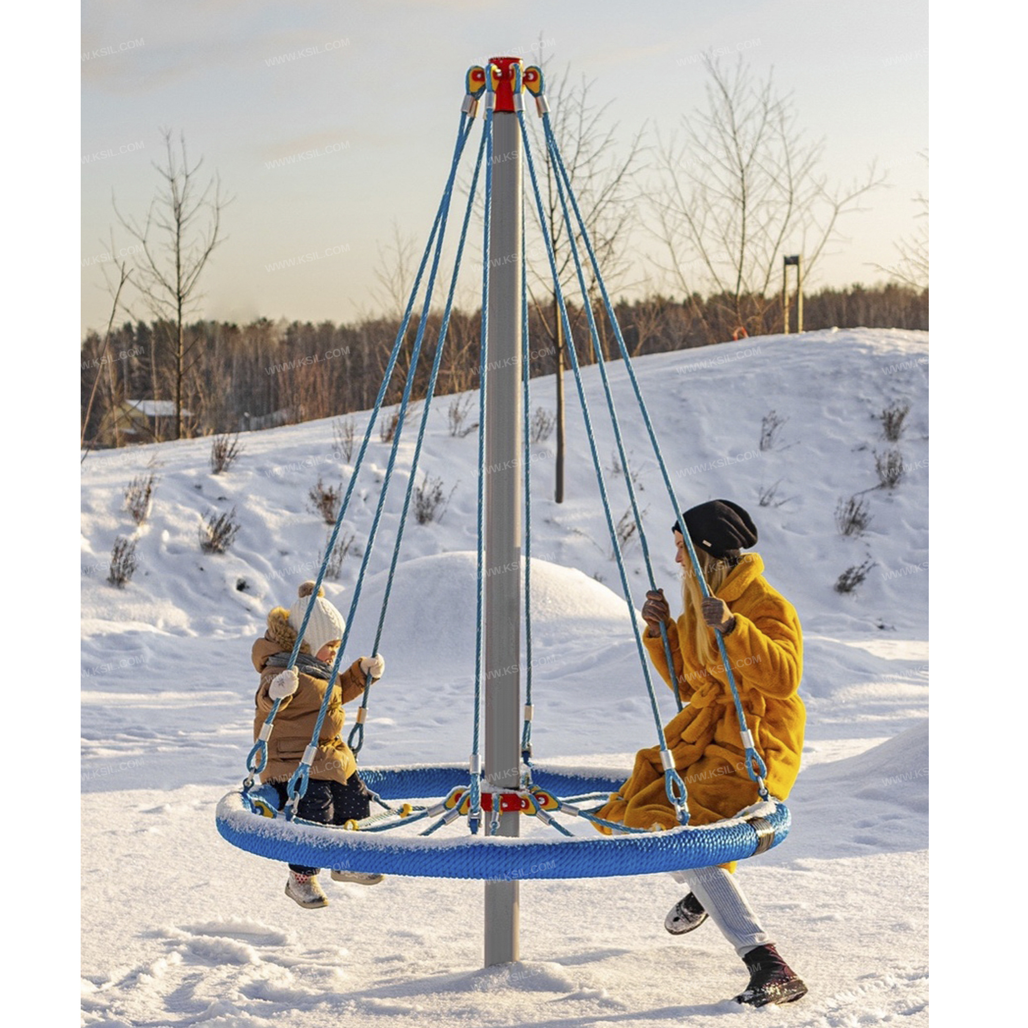 Сетка с вращением должна представлять собой устойчивую конструкцию, обеспечивающую безопасное вращение сетки для детей вокруг вертикальной оси. На центральной металлической стойке, сверху закрытой металлической заглушкой, должно быть установлено круглое сиденье, вращающееся на круглом валу с подшипниками. Сиденье диаметром не менее 1600 мм должно быть выполнено в виде сетки-паутины из полипропиленового армированного каната и наружного кольца из стальной трубы, плотно оплетенного полиамидным канатом. Канат сетки должен быть надежно закреплен специальными пластиковыми креплениями и зажимами из алюминиевого сплава, позволяющими удерживать конструкцию сетки под нагрузкой. Сиденье должно крепиться к несущей стойке в верхней точке на 8-ми лучах из полипропиленового армированного каната. В местах крепления канатов к центральной стойке должны быть использованы закрытые коуши. Центральная стойка выполнена из трубы сечением 100мм.