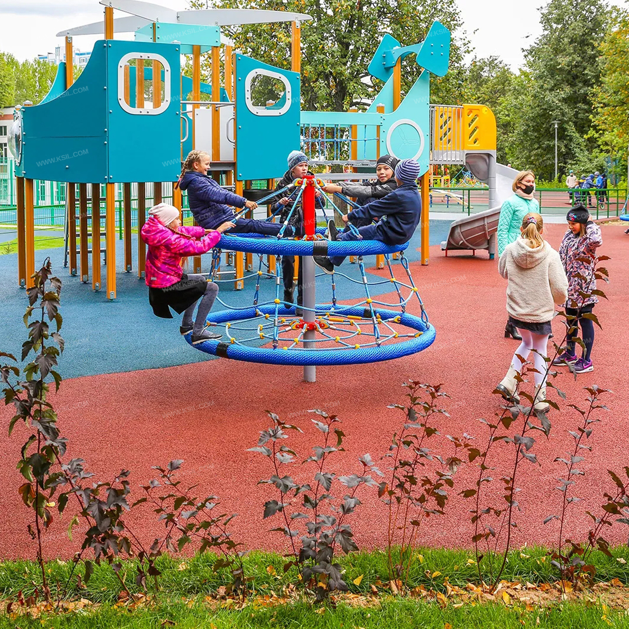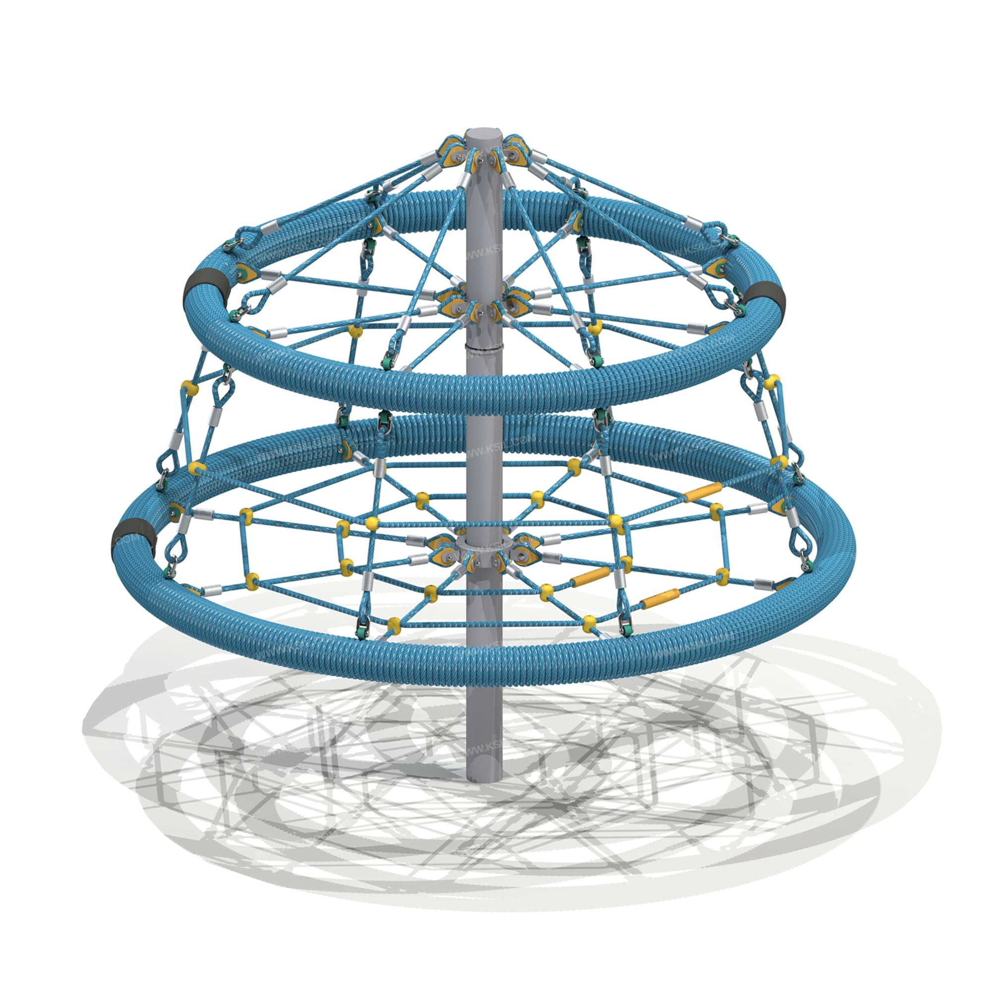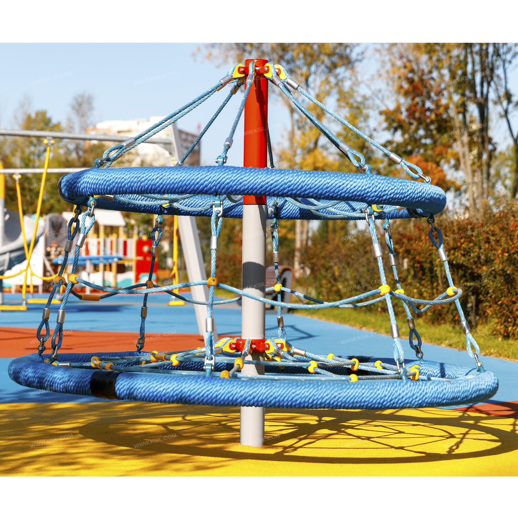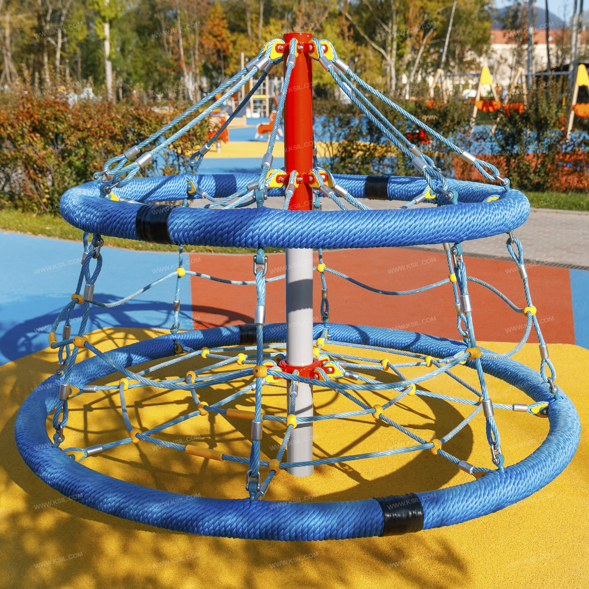 Сетка с вращением должна представлять собой устойчивую конструкцию, обеспечивающую безопасное вращение сетки для детей вокруг вертикальной оси.Сетка с вращением включает в себя два обруча, соединенных между собой полипропиленовым армированным канатом, крепящихся к центральной стойке при помощи полипропиленовых канатов к узлам вращения.На центральной металлической стойке сетки с вращением, сверху закрытой металлической заглушкой, должно быть установлено круглое сиденье, вращающееся на круглом валу с подшипниками. Сиденье диаметром не менее 2000 мм должно быть выполнено в виде сетки-паутины из полипропиленового армированного каната и наружного кольца из стальной трубы, плотно оплетенного полиамидным канатом. Параллельно сиденью на наружном кольце диаметром не менее 1600 мм из стальной трубы, плотно оплетенном полиамидным канатом должны быть установлены 8 лучей из полипропиленового армированного каната, которые крепятся в центре к стойке карусели. Данные элементы должны крепиться между собой сеткой из полипропиленового армированного каната из 16 ячеек. Канаты сеток должны быть надежно закреплены специальными пластиковыми креплениями и зажимами из алюминиевого сплава, позволяющими удерживать конструкцию сеток под нагрузкой. Верхний элемент должен крепиться к несущей стойке в верхней точке на 8-ми лучах из полипропиленового армированного каната