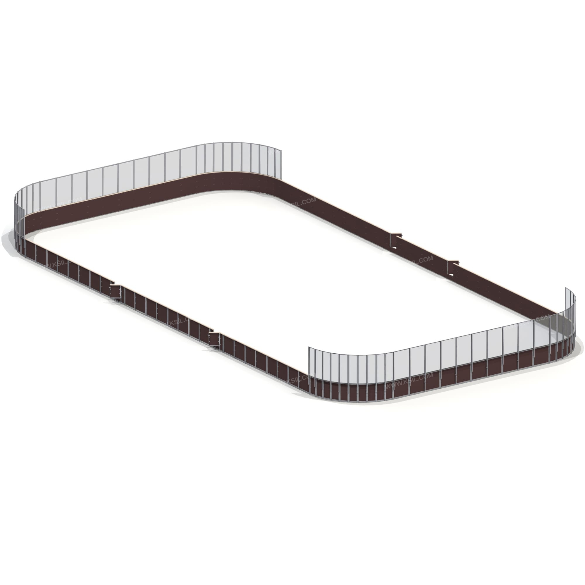 Хоккейная коробка должна представлять собой устойчивую конструкцию, состоящую из несущих стоек, ограждений по периметру игрового поля, входных калиток в количестве не менее четырёх. Ограждения за лицевой линией ворот должны быть увеличенного в 2 раза размера относительно боковых бортов.Несущие стойки должны быть выполнены из металлической профильной трубы сечением не менее 60х40 мм.Ограждения должно состоять из рам, сваренных из уголка размером не менее 50х50 мм и профильной трубы 50х25 мм для усиления и бортов из ламинированной фанеры толщиной не менее 15 мм, прикрепленных к этим рамам. Ограждения с калиткой и сами калитки должны быть изготовлены из такого же уголка 50х50 мм и профильной трубы 50х25 мм и прикрепленными к ним бортами из ламинированной фанеры толщиной не менее 15 мм.Верхние ограждения за воротами должны быть выполнены из уголка с размером не менее 40х40 мм. Пространство внутри рам верхнего ограждения должно быть закрыто сеткой-рабицей. Сверху боковых бортов должны быть установлены перила из бруса не менее 80х40 мм с закругленными фасками.