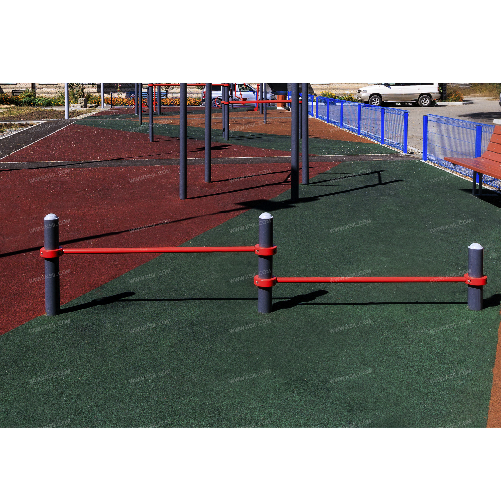 Каскад турников для отжимания должен представлять собой устойчивую конструкцию, обеспечивающую безопасные условия для занятий спортом на свежем воздухе.Каскад турников должен состоять из трех несущих стоек и 2-х перекладин. Несущие стойки должны быть выполнены из металлической трубы диаметром не менее 89 мм с толщиной стенки не менее 3,0мм. Перекладины, крепящиеся к стойкам при помощи хомутов, должны быть изготовлены из металлической трубы диаметром не менее 33 мм с толщиной стенки не менее 2,8мм.Расстояние от поверхности игровой площадки до перекладин должно быть не менее 215 мм и не менее 415 мм.