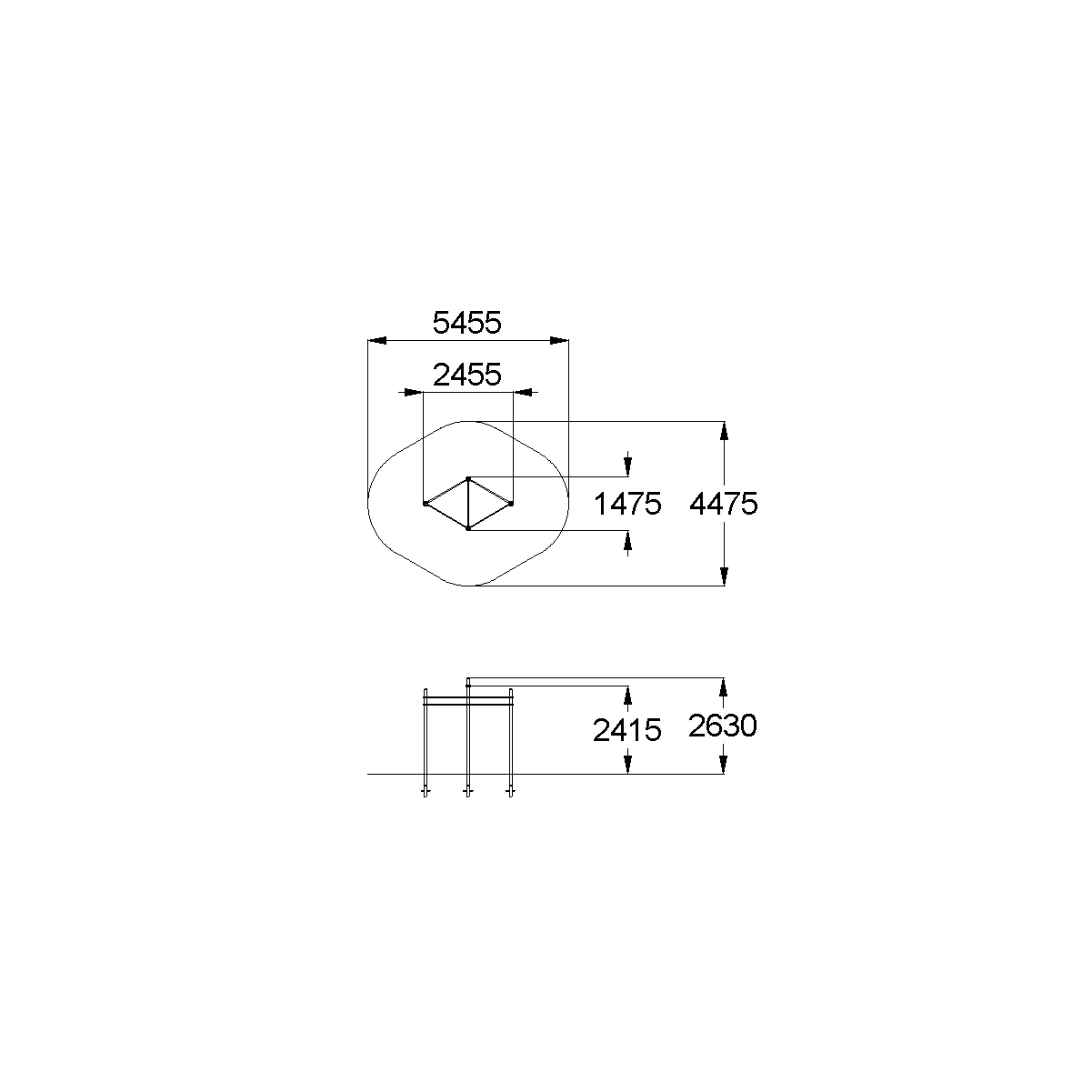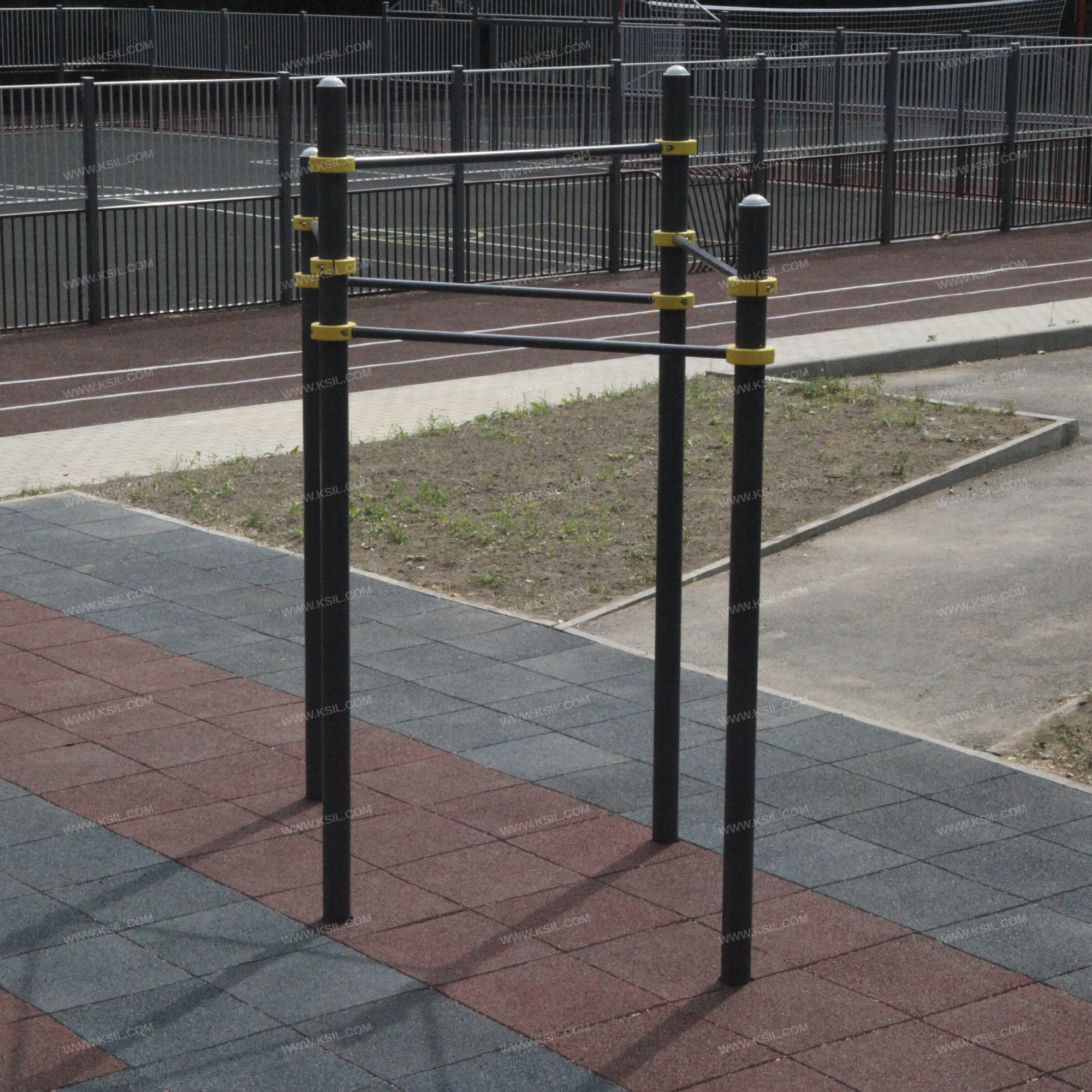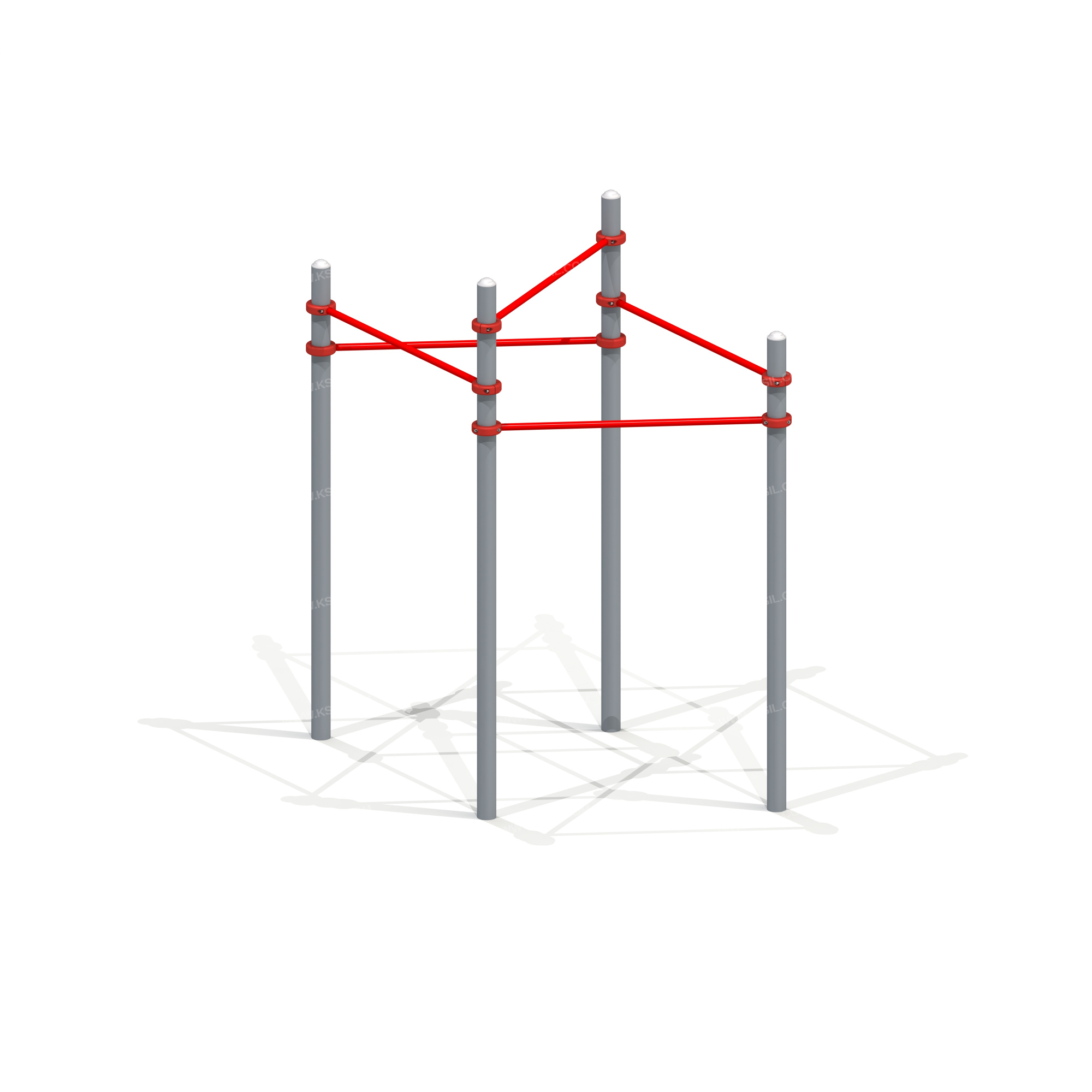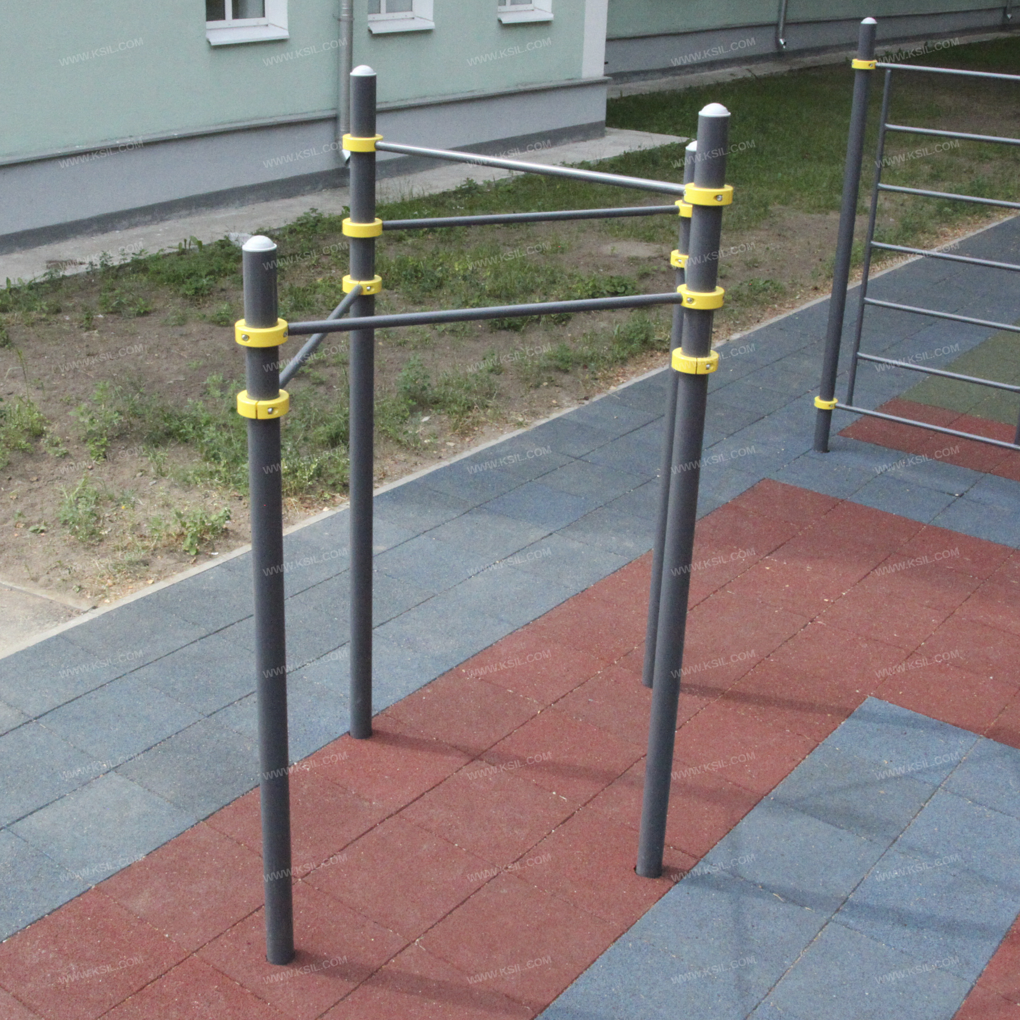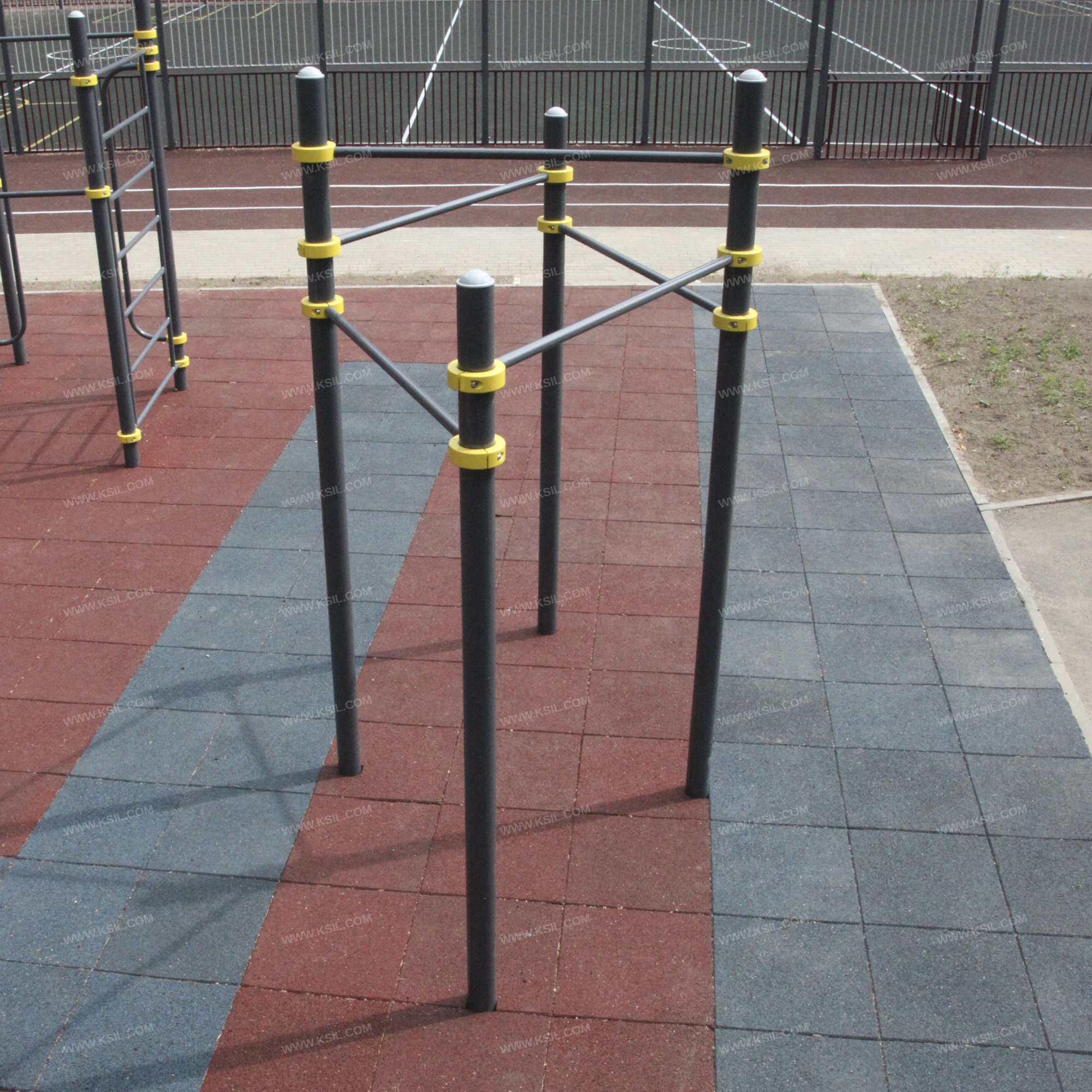 Спортивный комплекс должен представлять собой устойчивую конструкцию, обеспечивающую безопасные условия для занятий спортом на свежем воздухе.Спортивный комплекс должен состоять из 4-х несущих стоек, расположенных в вершинах условного ромба и 5-ти разноуровневых перекладин. Несущие стойки должны быть выполнены из металлической трубы диаметром не менее 89 мм с толщиной стенки не менее 3,0мм. Сверху стойка должна заканчиваться заглушкой, снизу бетонироваться в землю.Перекладины, крепящиеся к стойкам при помощи хомутов, должны быть изготовлены из металлической трубы диаметром не менее 33 мм с толщиной стенки не менее 2,8мм.Расстояние от поверхности игровой площадки до перекладин должно быть не менее 1915 мм, не менее 2115 мм, не менее 2415 мм.