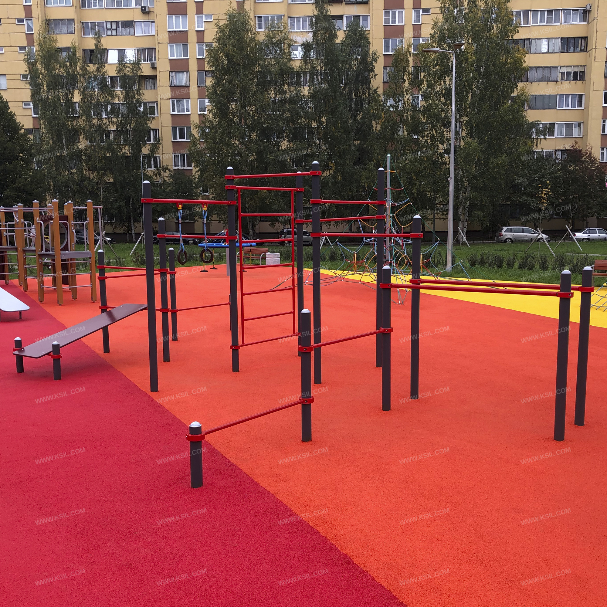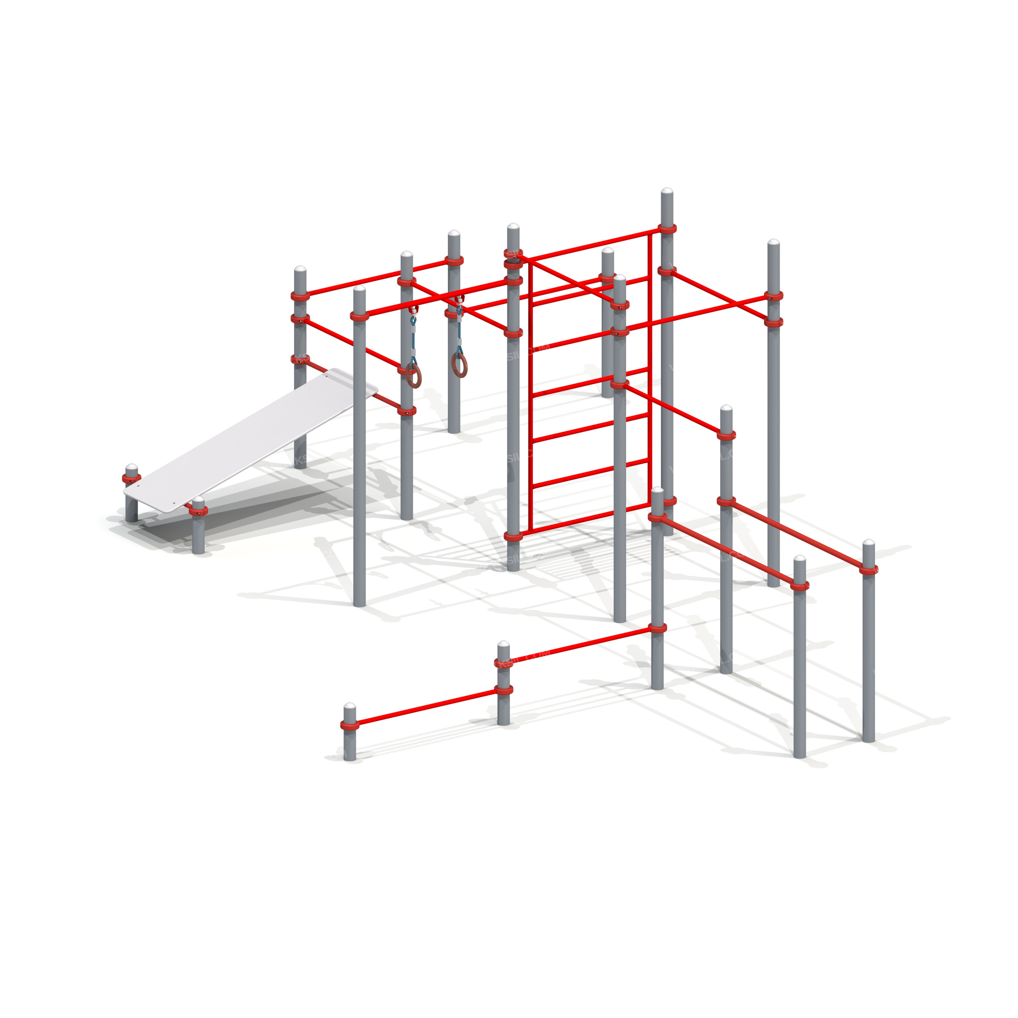 Спортивный комплекс должен представлять собой устойчивую конструкцию, обеспечивающую безопасные условия для занятий спортом на свежем воздухе.Спортивный комплекс должен состоять из 17 несущих стоек, шведской стенки, 10-ти разноуровневых перекладин, скамьи для пресса, перекладины с гимнастическими кольцами, параллельных брусьев. Оборудование должно крепиться к стойкам комплекса через хомуты диаметром 140 мм.Несущие стойки должны быть выполнены из металлической трубы диаметром не менее 89 мм с толщиной стенки не менее 3,0мм. Сверху стойка должна заканчиваться заглушкой, снизу бетонироваться в землю.Перекладины, крепящиеся к стойкам при помощи хомутов, должны быть изготовлены из металлической трубы диаметром не менее 33 мм с толщиной стенки не менее 2,8мм.Скамья для пресса должна состоять из 2-х перекладин с фланцами, выполненных из металлической трубы диаметром не менее 33 мм с толщиной стенки не менее 2,8 мм и настила из влагостойкой фанеры толщиной не менее 21 мм. Жерди параллельных брусьев должны быть изготовлены из металлической трубы диаметром не менее 42 мм.Шведская стенка должна состоять из вертикальных стоек и перекладин, выполненных из металлической трубы диаметром не менее 33 мм. Перекладина с гимнастическими кольцами должна быть выполнена из металлической трубы диаметром не менее 42 мм, гибкой подвески из полипропиленового 6-прядного армированного металлом каната тросовой свивки с резиновым сердечником диаметром не менее 16 мм и колец из влагостойкой фанеры толщиной не менее 21 мм.