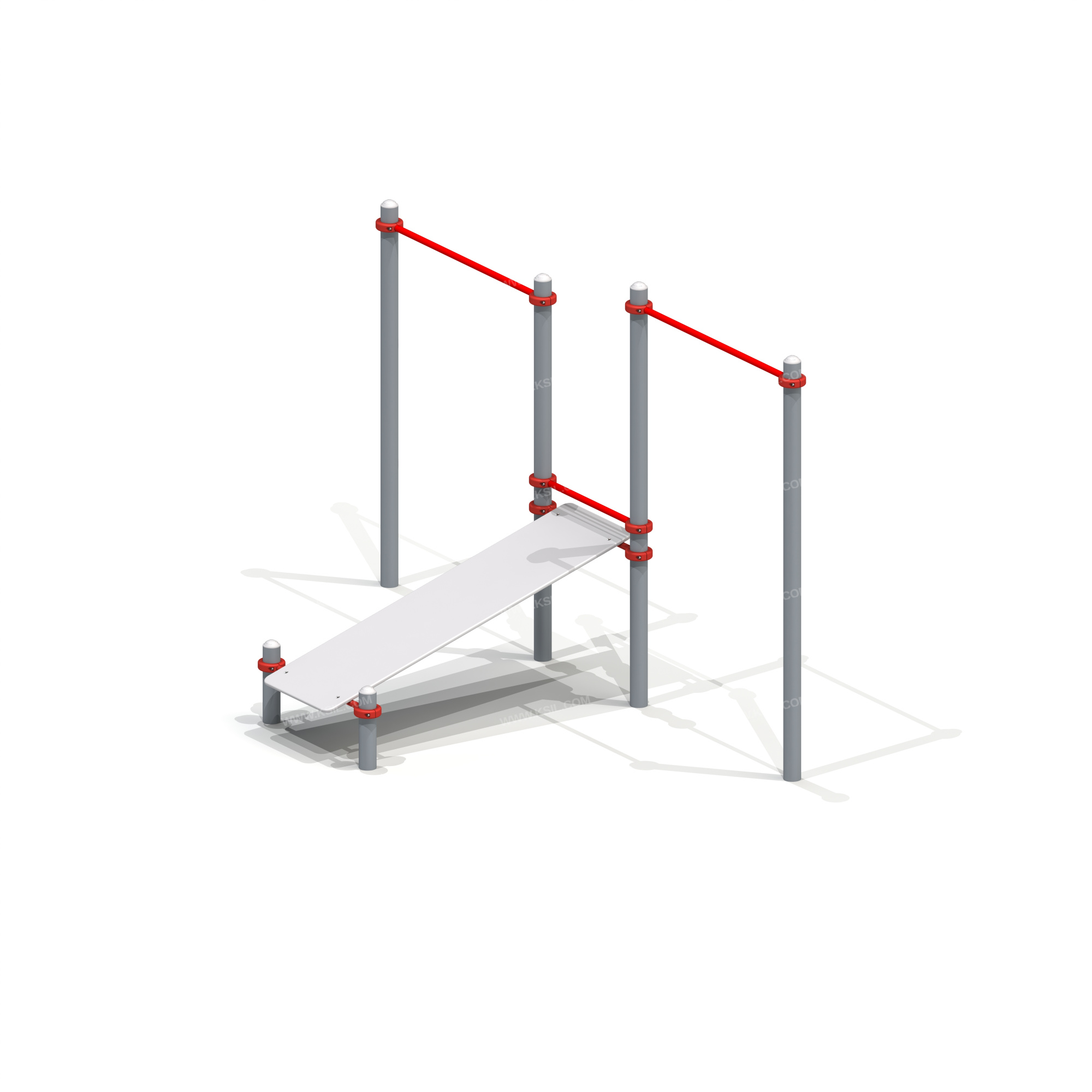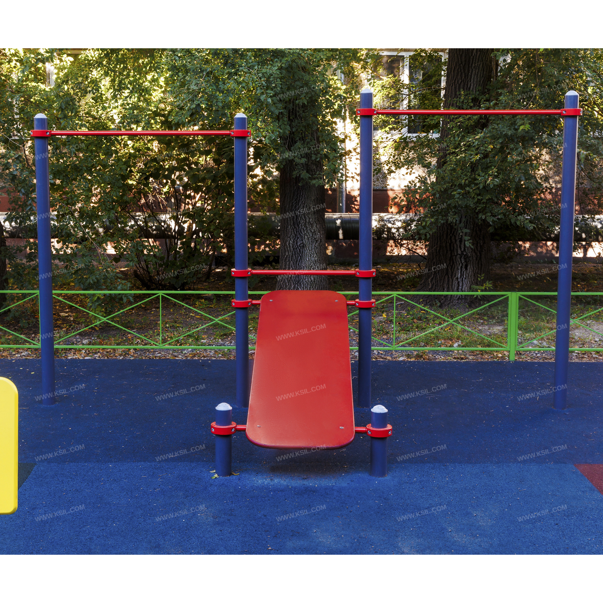 Спортивный комплекс должен представлять собой устойчивую конструкцию, обеспечивающую безопасные условия для занятий спортом на свежем воздухе.Спортивный комплекс должен состоять из 6-ти несущих стоек, 3-х перекладин и скамьи для пресса, установленной между двумя перекладинами. Оборудование должно крепиться к комплексу через хомуты диаметром не менее 140 мм.Несущие разновысокие стойки должны быть выполнены из металлической трубы диаметром не менее 89 мм с толщиной стенки не менее 3,0мм. Перекладины, крепящиеся к стойкам при помощи хомутов, должны быть изготовлены из металлической трубы диаметром не менее 33 мм с толщиной стенки не менее 2,8мм.Расстояние от поверхности игровой площадки до перекладин должно быть не менее 960 мм, не менее 1917 мм и не менее 2117 мм. Скамья должна состоять из настила и перекладин с вставкой. Настил должен быть изготовлен из влагостойкой фанеры толщиной не менее 21 мм. Настил должен крепиться к металлическим перекладинам диаметром не менее 33 мм.
