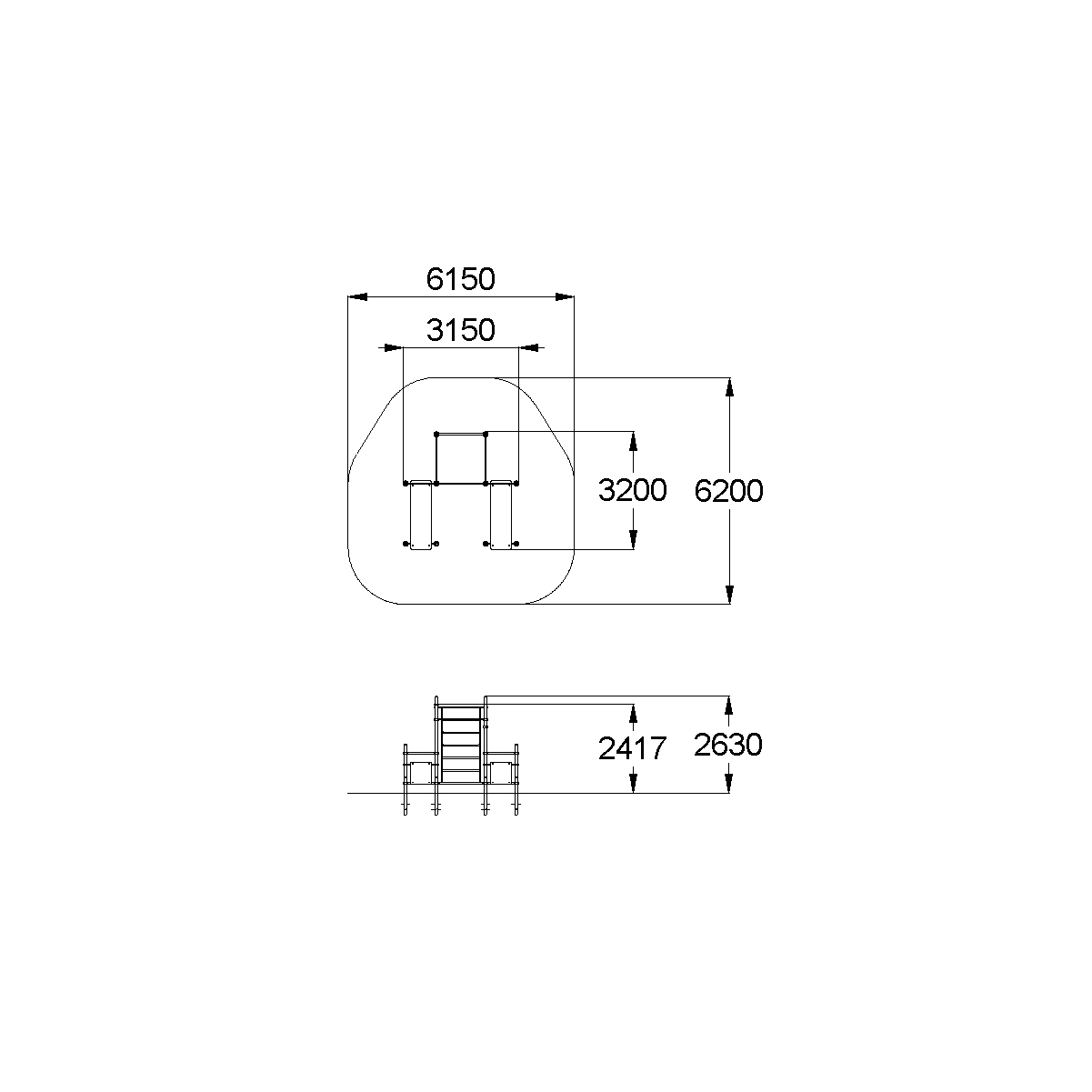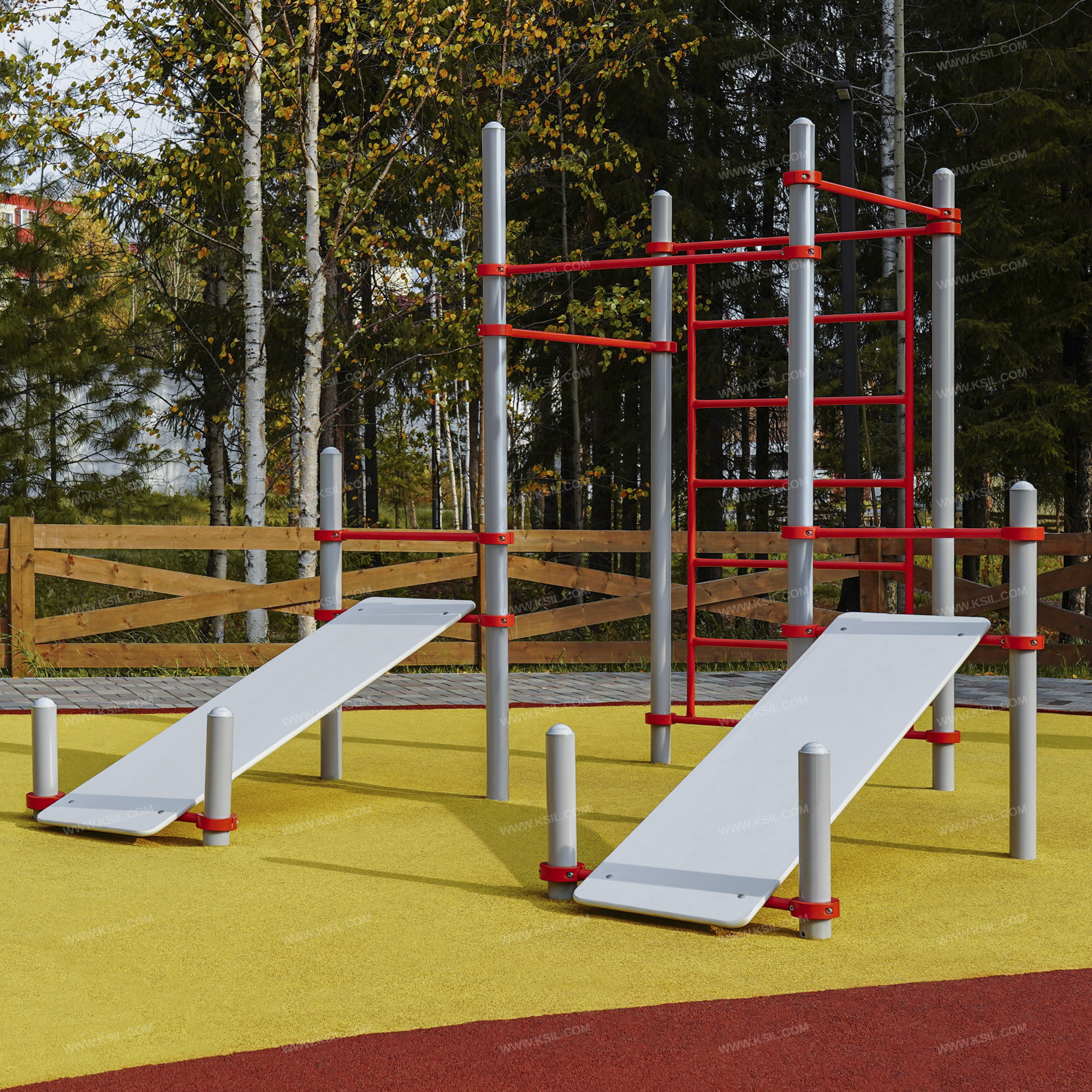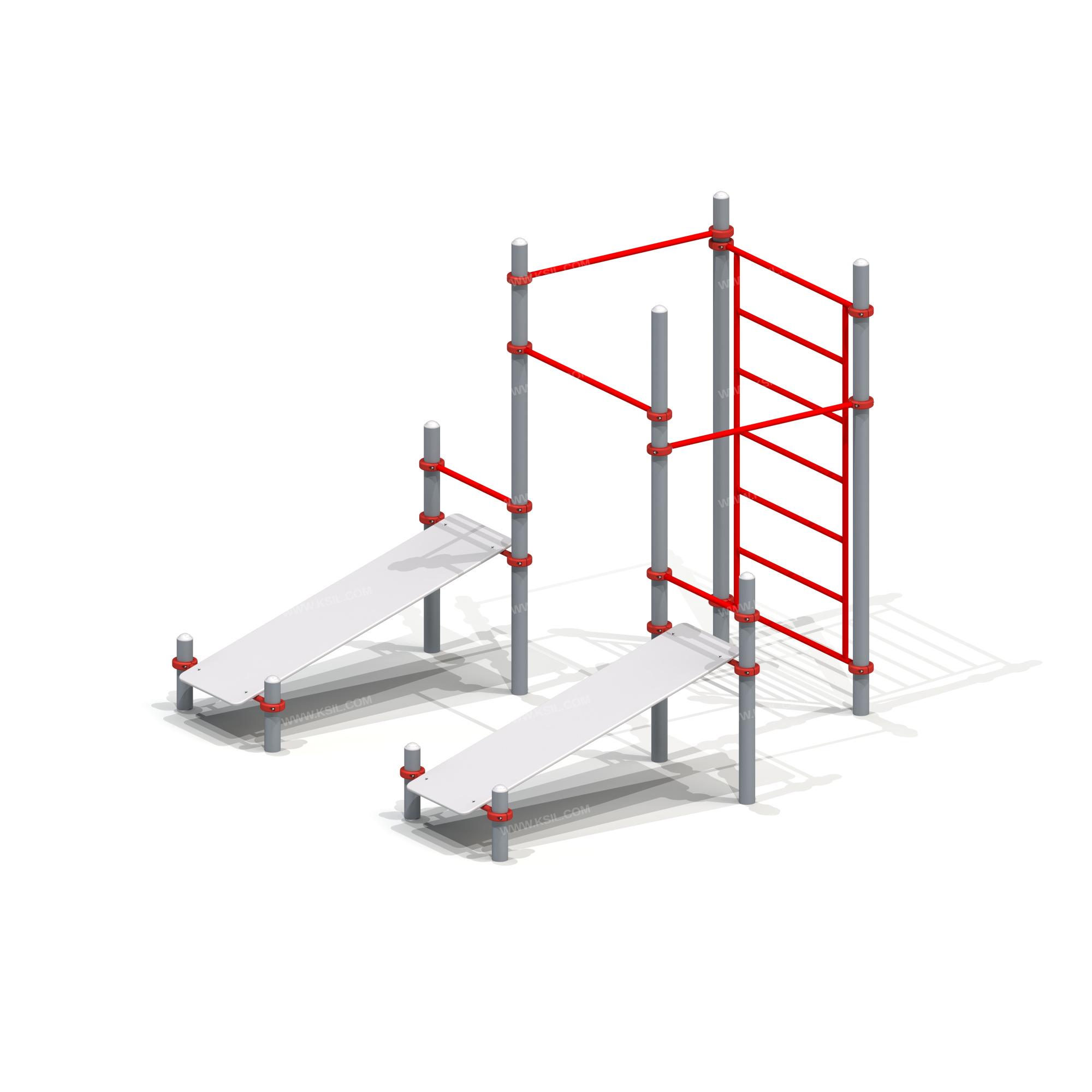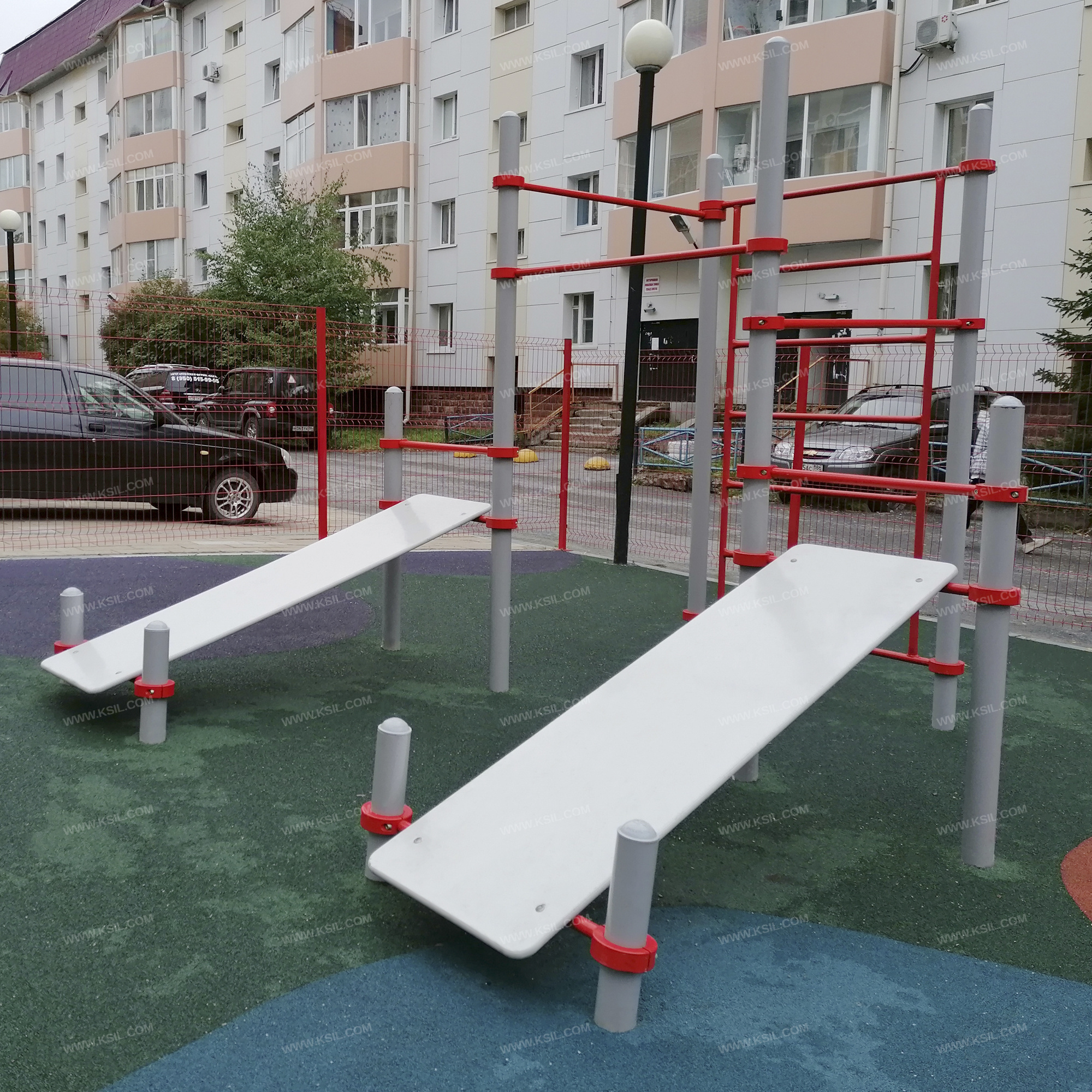 Спортивный комплекс должен представлять собой устойчивую конструкцию, обеспечивающую безопасные условия для занятий спортом на свежем воздухе.Спортивный комплекс состоять из 10-ти разновысоких несущих стоек, четыре из которых расположены в вершинах условного квадрата и спортивного навесного оборудования, крепящегося к стойкам комплекса через хомуты диаметром не менее 140 мм. Комплекс должен состоять из разноуровневых перекладин, шведской стенки и 2-х скамеек для пресса. Несущие стойки должны быть выполнены из металлической трубы диаметром не менее 89 мм с толщиной стенки не менее 3,0мм. Перекладины, крепящиеся к стойкам при помощи хомутов, должны быть изготовлены из металлической трубы диаметром не менее 33 мм с толщиной стенки не менее 2,8мм.Скамья для пресса должна состоять из 2-х перекладин со вставками и настила. Настил должен быть изготовлен из влагостойкой фанеры толщиной не менее 21 мм. Настил должен крепиться к металлическим перекладинам диаметром не менее 33 мм. Шведская стенка должна состоять из вертикальных стоек и перекладин, выполненных из металлической трубы диаметром не менее 33 мм.