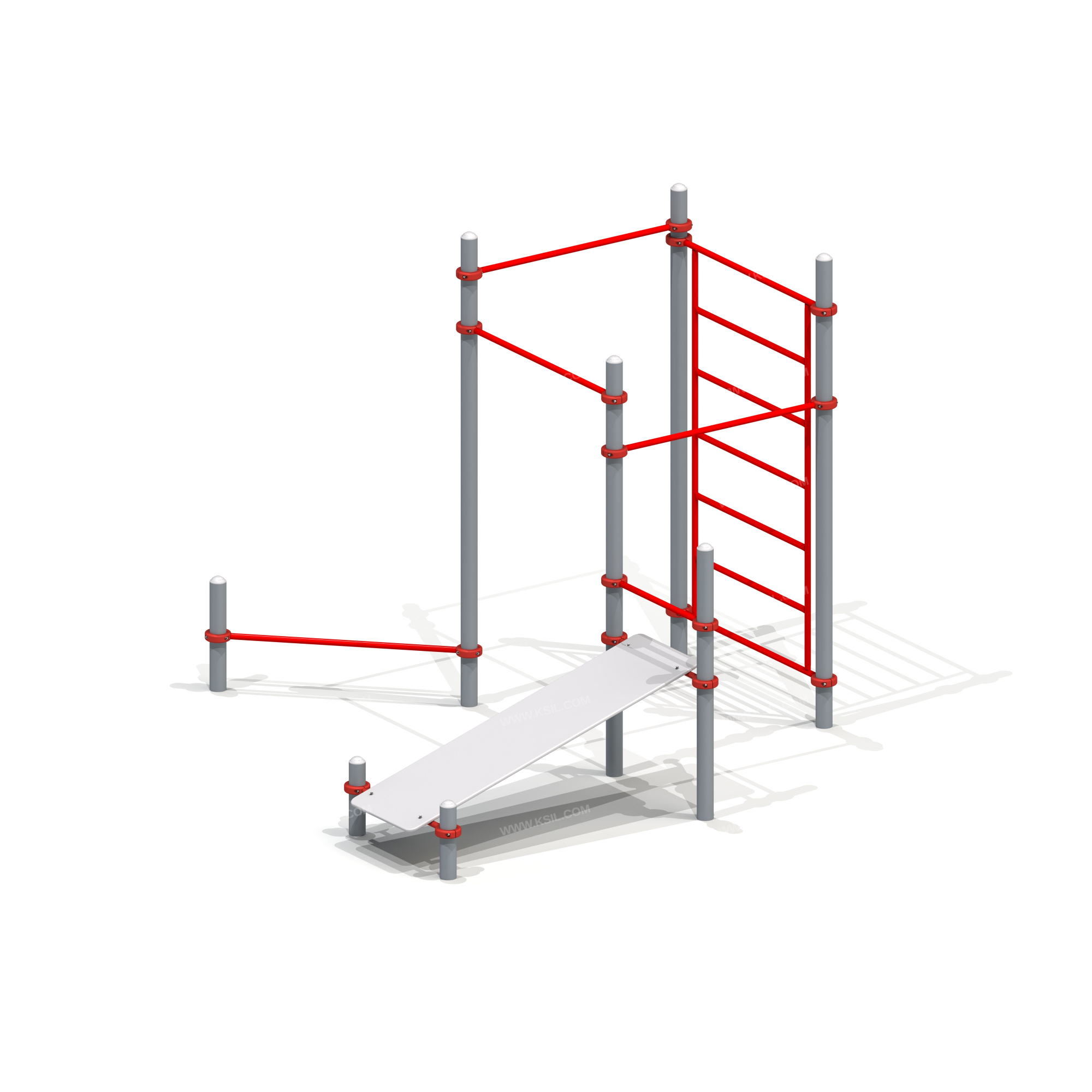 Спортивный комплекс должен представлять собой устойчивую конструкцию, обеспечивающую безопасные условия для занятий спортом на свежем воздухе.Спортивный комплекс состоять из 8- ми несущих стоек, из которых 4 расположены в вершинах условного квадрата и спортивного навесного оборудования, крепящегося к стойкам комплекса через хомуты диаметром не менее 140 мм. Комплекс должен состоять из разноуровневых перекладин, шведской стенки и скамьи для пресса. Несущие стойки должны быть выполнены из металлической трубы диаметром не менее 89 мм с толщиной стенки не менее 3,0мм. Перекладины, крепящиеся к стойкам при помощи хомутов, должны быть изготовлены из металлической трубы диаметром не менее 33 мм с толщиной стенки не менее 2,8мм.Скамья для пресса должна состоять из 2-х перекладин со вставками и настила. Настил должен быть изготовлен из влагостойкой фанеры толщиной не менее 21 мм. Настил должен крепиться к металлическим перекладинам диаметром не менее 33 мм. Шведская стенка должна состоять из вертикальных стоек и перекладин, выполненных из металлической трубы диаметром не менее 33 мм.
