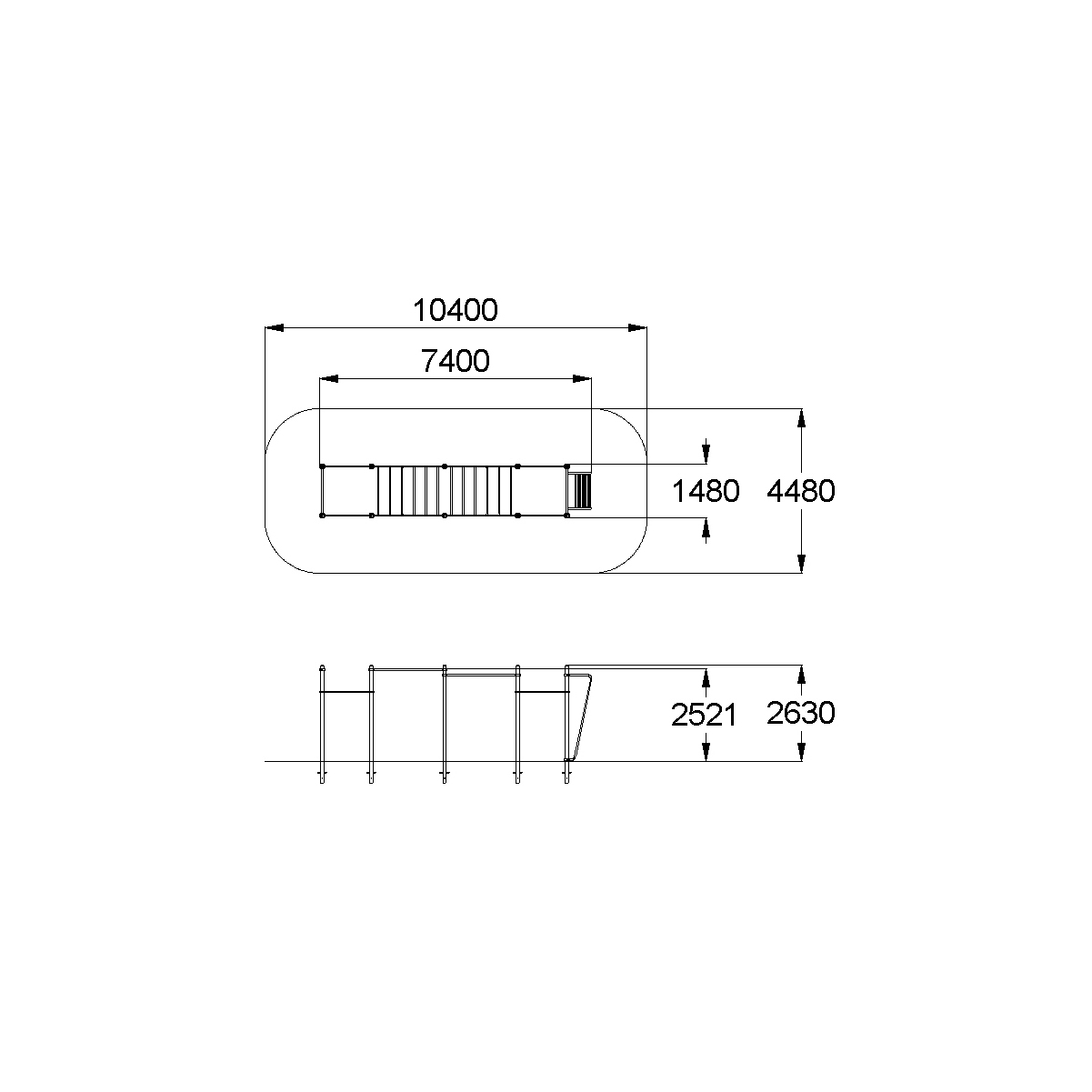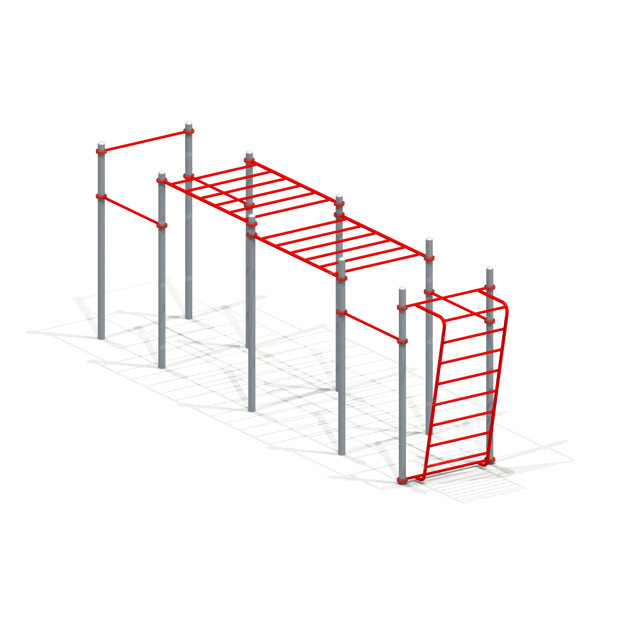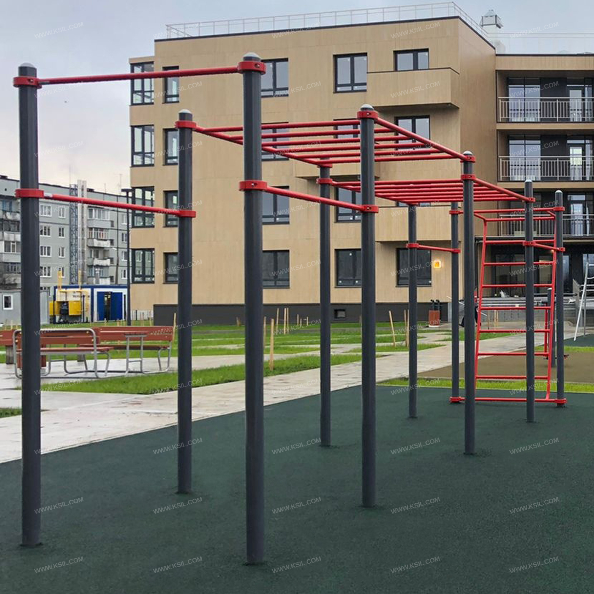 Спортивное оборудование должно представлять собой устойчивую конструкцию, обеспечивающую детям комфортные и безопасные условия для занятия спортом.Комплекс должен представлять собой конструкцию из 10-ти несущих стоек, установленных в два ряда параллельно друг другу. Несущие стойки должны быть соединены 5-ю разноуровневыми перекладинами, 2-мя разноуровневыми рукоходами и выносной шведской стенкой. Оборудование должно крепиться к стойкам комплекса через хомуты диаметром 140 мм.Несущие стойки должны быть выполнены из металлической трубы диаметром не менее 89 мм с толщиной стенки не менее 3,0мм. Сверху стойка должна заканчиваться заглушкой, снизу бетонироваться в землю.Перекладины, крепящиеся к стойкам при помощи хомутов, должны быть изготовлены из металлической трубы диаметром не менее 33 мм с толщиной стенки не менее 2,8мм.Рукоход должен состоять из 2-х направляющих металлических труб диаметром не менее 42 мм и перекладин из трубы диаметром не менее 33 мм. Выносная шведская стенка должна состоять из двух гнутых стоек с перекладинами из металлической трубы диаметром не менее 33.