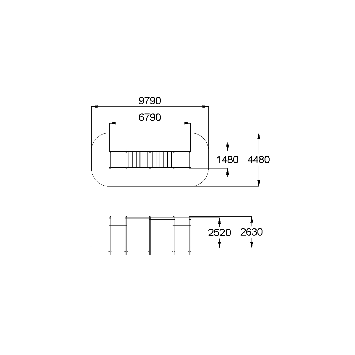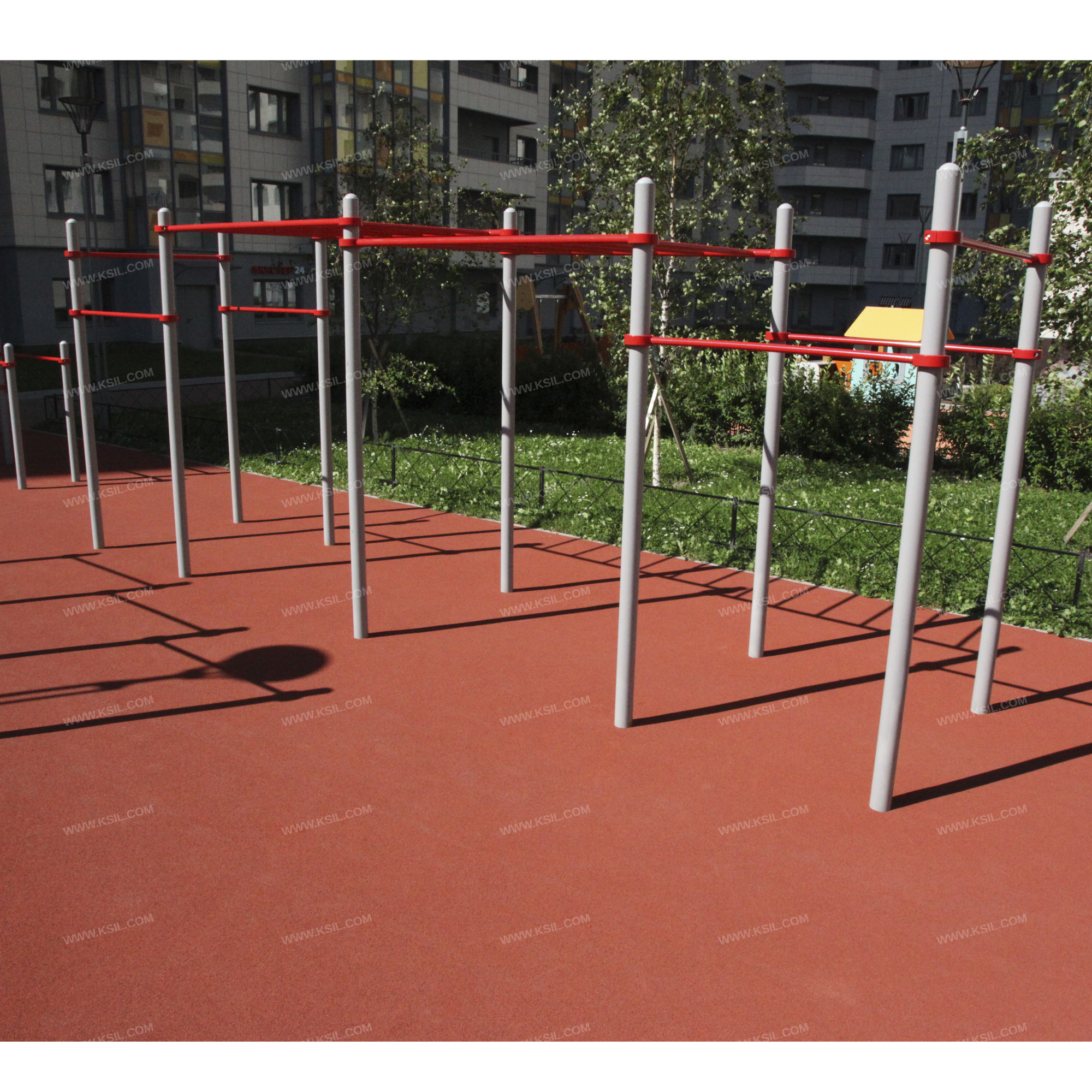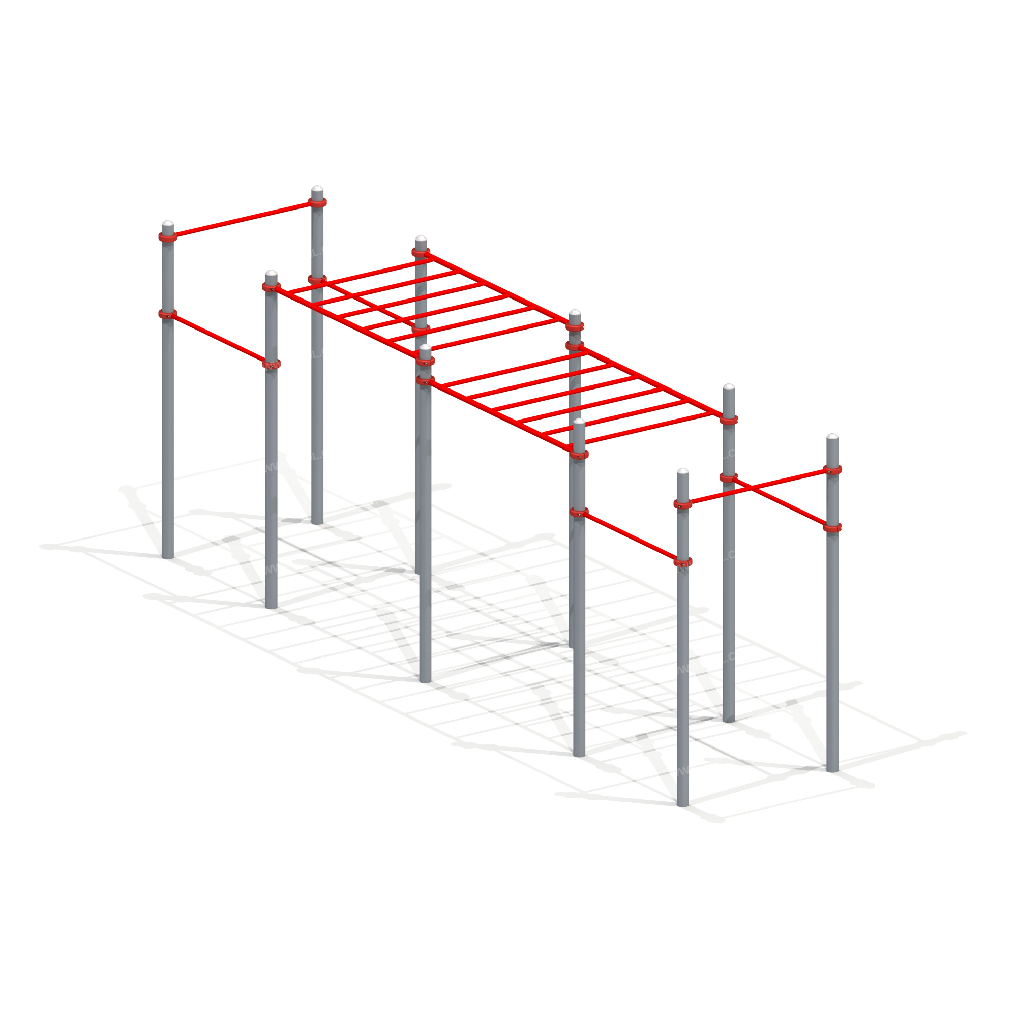 Спортивный комплекс должен представлять собой устойчивую конструкцию, обеспечивающую безопасные условия для занятий спортом на свежем воздухе.Комплекс должен представлять собой конструкцию из 10-ти несущих стоек, установленных в два ряда параллельно друг другу. В каждом ряду и проеме несущие стойки должны быть соединены 6-тью разноуровневыми перекладинами и двумя разноуровневыми рукоходами. Оборудование должно крепиться к стойкам комплекса через хомуты диаметром не менее 140 мм.Несущие стойки должны быть выполнены из металлической трубы диаметром не менее 89 мм с толщиной стенки не менее 3,0мм. Перекладины, крепящиеся к стойкам при помощи хомутов, должны быть изготовлены из металлической трубы диаметром не менее 33 мм с толщиной стенки не менее 2,8мм.Рукоход должен состоять из 2-х направляющих металлических труб диаметром не менее 42 мм и перекладин из трубы диаметром не менее 33 мм.