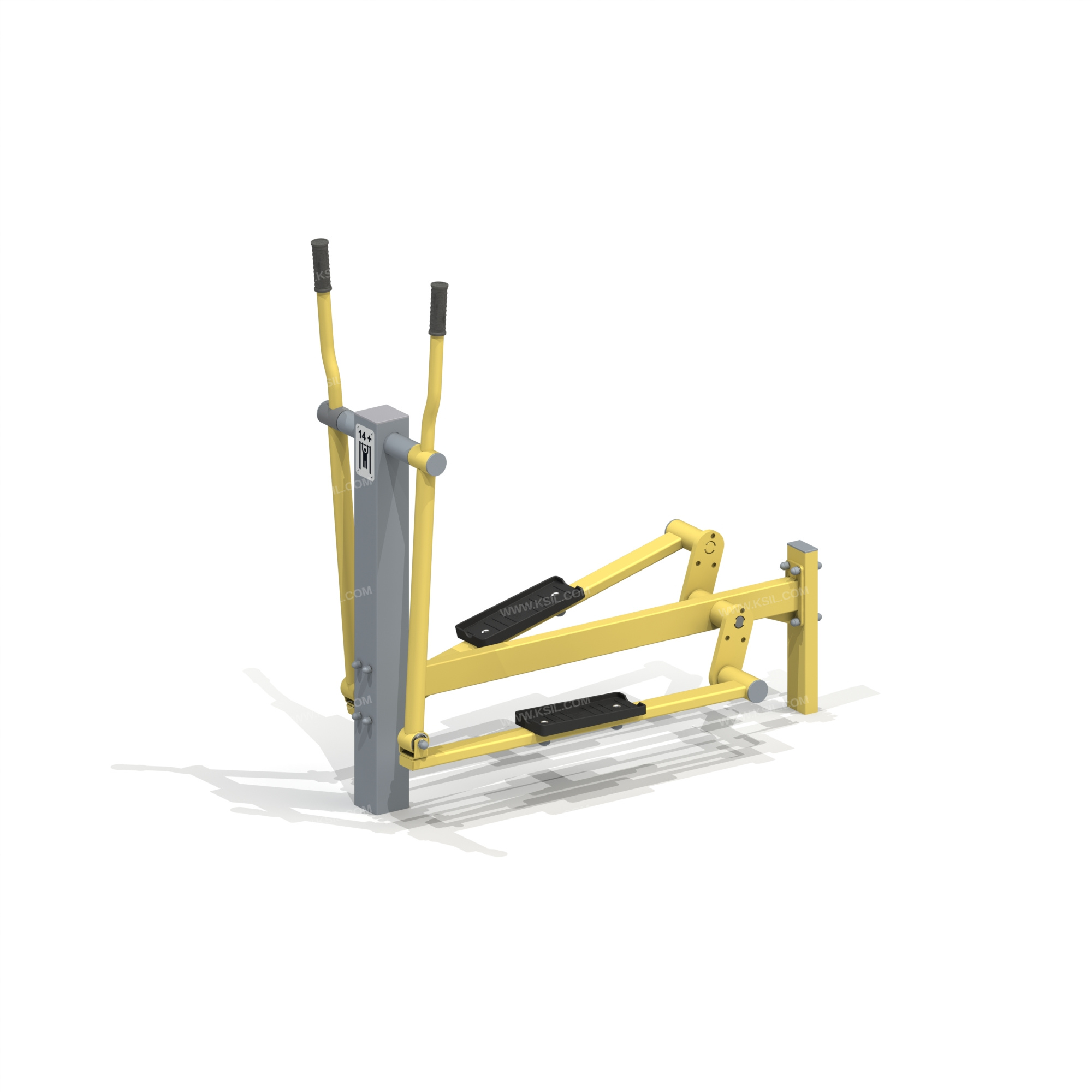 Спортивный тренажер рассчитан на одного пользователя.Спортивный тренажер должен представлять собой устойчивую конструкцию, обеспечивающую безопасные условия для занятий спортом на свежем воздухе и предназначен для развития и укрепления мышц и суставов ног и поясницы, увеличения эластичности соединительных тканей. Спортивный тренажер должен состоять из стойки с отводом и качающихся опор с поручнями Несущая стойка должна быть выполнена из металлической трубы сечением не менее 100х100 мм с толщиной стенки не менее 3 мм, на металлическом основании с отверстиями для крепления к фундаменту. Г-образный отвод должен быть выполнен из металлической трубы сечением не менее 80х40 мм. Качающиеся опоры должны быть выполнены в виде шатунов Г-образной формы из трубы Ø 48 мм с площадками для опоры ног пользователей из трубы сечением 30х60мм в нижней части и рукоятками для захвата руками в верхней части и закреплены на несущей стойке и отводе – зеркально. Опоры для ног должны быть изготовлены из ударопрочного и морозостойкого пластика.Зоны рукояток, предназначенные для захвата, должны быть покрыты слоем атмосферостойкой резины и выполнена из трубы Ø 33,5 мм. Узлы крепления должны изготавливаться в виде шарниров, на основе подшипников качения закрытого типа.