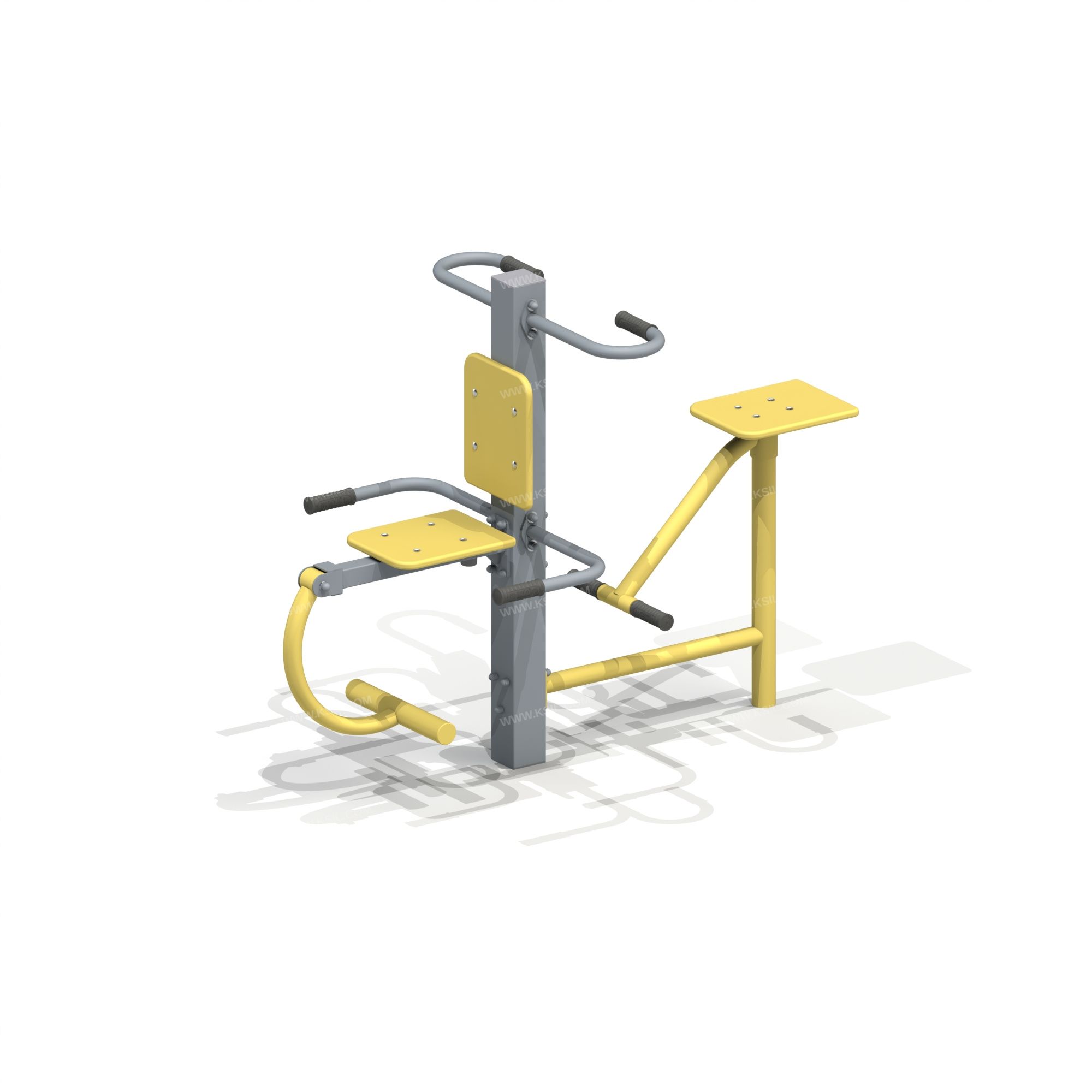 Спортивный тренажер рассчитан на двух пользователей.Спортивный тренажер представляет собой устойчивую конструкцию, обеспечивающую безопасные условия для тренировки и укрепления косых мышц живота, брюшного пресса, мышц поясничного отдела, а также для тренировки мышц ног в положении сидя. Тренажер состоит из тренажера для скручивания в положении сидя и тренажера для сгибания и разгибания ног в коленях в положении сидя.Спортивный тренажер состоит из двух функциональных тренажеров, размещенных на единой несущей стойки. Несущая стойка выполнена из металлической трубы сечением не менее 100х100 мм с толщиной стенки не менее 3 мм, на металлическом основании с отверстиями для крепления к фундаменту. В верхней части стойка закрыта заглушкой. С одной стороны несущей стойки крепится спинка, выполненная из влагостойкой фанеры толщиной не менее 21 мм, и консоль с сиденьем, выполненным из влагостойкой фанеры толщиной не менее 21 мм. К концу консоли крепится противовес для ног, изготовленный из металлической трубы сечением не менее Ø 48 мм и из круга сечением не менее Ø58 мм, снабженный подшипниками для обеспечения плавного хода. Диапазон движения противовеса для ног ограничен упором, представляющим собой резиновый отбойник, который крепится в нижней части консоли. С другой стороны несущей стойки крепится рама, выполненная из труб сечением не менее 60 мм и 48 мм. В верхней части рамы крепится сиденье, выполненное из влагостойкой фанеры толщиной не менее 21 мм, на металлическом основании с упорами для ног, снабженным подшипниками для обеспечения плавного хода. По бокам к несущей стойке крепятся поручни, изготовленные из металлической трубы диаметром не менее Ø 33,5 мм. Зоны поручней, предназначенные для захвата, закрыты несъемными резиновыми ручками.