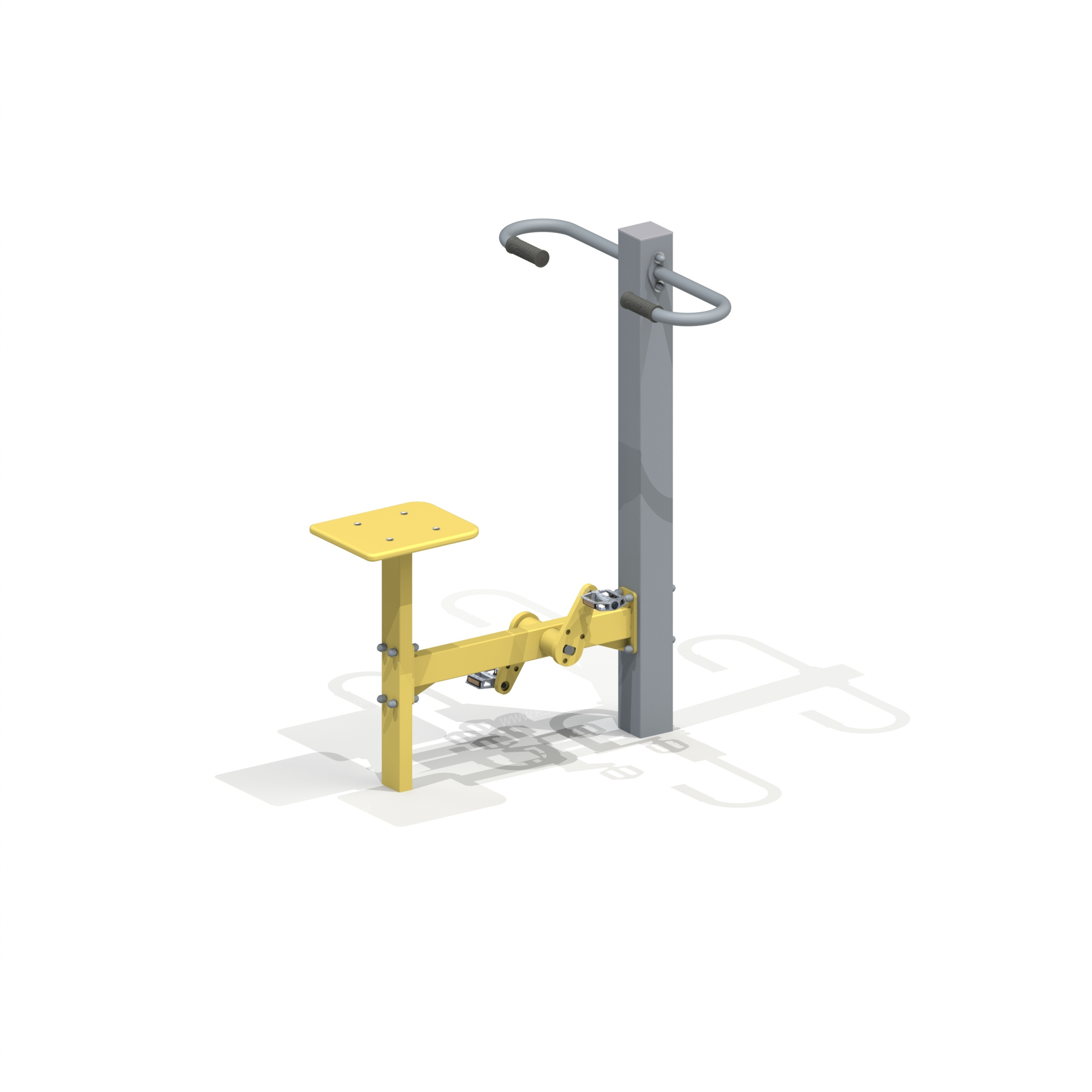 Спортивный тренажер рассчитан на одного пользователя.Спортивный тренажер должен представлять собой устойчивую конструкцию, обеспечивающую безопасные условия для занятий спортом на свежем воздухе и предназначен для развития и укрепления мышц и суставов ног.Спортивный тренажер должен состоять из несущей стойки с рукоятками и сиденья с педалями на металлическом каркасе. Несущая стойка должна быть выполнена из металлической трубы сечением не менее 100х100 мм с толщиной стенки не менее 3 мм, на металлическом основании с отверстиями для крепления к фундаменту. Сиденье должно быть выполнено из влагостойкой фанеры толщиной не менее 21 мм.Рукоятки должны располагаться на несущей стойке. Зоны рукояток, предназначенные для захвата, должны быть покрыты слоем атмосферостойкой резины и выполнена из трубы Ø 33,5 мм. Узлы крепления должны изготавливаться в виде шарниров, на основе подшипников качения закрытого типа.Рама с сидением и педалями из трубы сечением 80х40 мм и 60х40 мм.
