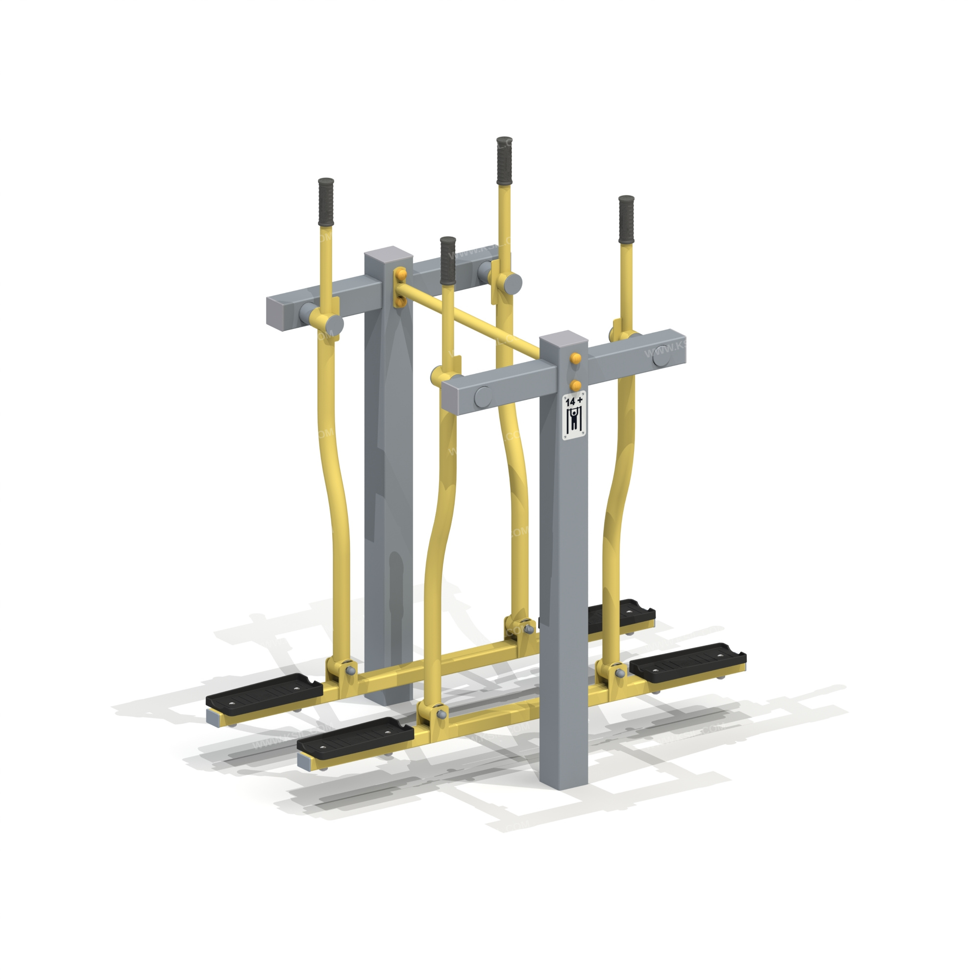 Спортивный тренажер рассчитан на двух пользователей.Спортивный тренажер должен представлять собой устойчивую конструкцию, обеспечивающую безопасные условия для занятий спортом на свежем воздухе и предназначен для тренировки и укрепления мышц и суставов ног и поясницы. Тренажер должен имитировать ходьбу на лыжах с палками.Спортивный тренажер должен состоять из 2-х стоек соединенных трубой Ø33,5 мм, 2-х качающихся опор с 2мя рычагами.Стойка Т-образной формы должна быть выполнена из металлической трубы сечением не менее 100х100 мм с толщиной стенки не менее 3 мм, на металлическом основании с отверстиями для крепления к фундаменту. Качающиеся опоры должны быть выполнены в виде шатунов, с площадками для опоры ног пользователей из трубы сечением 40х60 мм в нижней части и рычагами из трубы Ø48 мм с рукоятками в верхней части для захвата руками из трубы Ø33,5 мм и закреплены в верхней части несущих стоек.Опоры для ног должны быть изготовлены из ударопрочного и морозостойкого пластика.Зоны рукояток, предназначенные для захвата, должны быть покрыты слоем атмосферостойкой резины. Узлы крепления качающихся опор к стойке должны изготавливаться в виде шарниров, на основе подшипников качения закрытого типа.